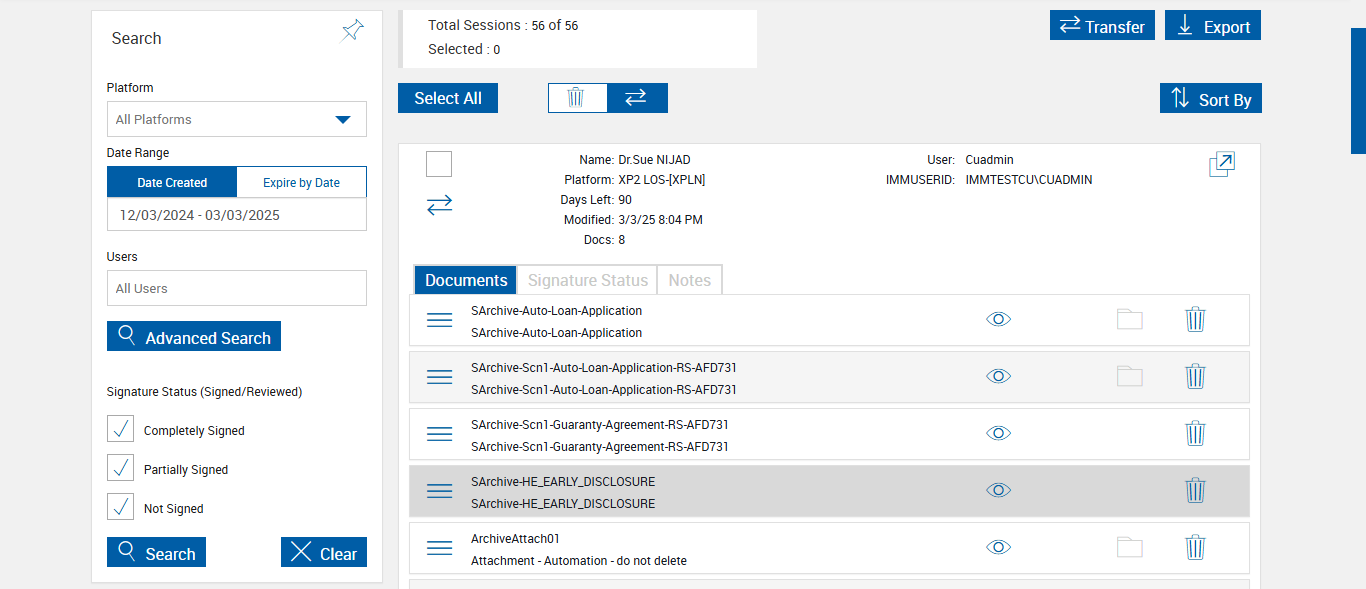 verify process XML Session With Archive Options in Search Active Sessions Page