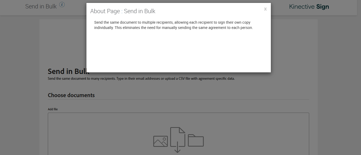 Actual(Passed): Successfully verified 'Send in Bulk page' Tooltip Text Send the same document to multiple recipients, allowing each recipient to sign their own copy individually. This eliminates the need for manually sending the same agreement to each person.