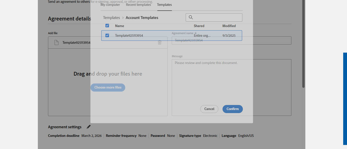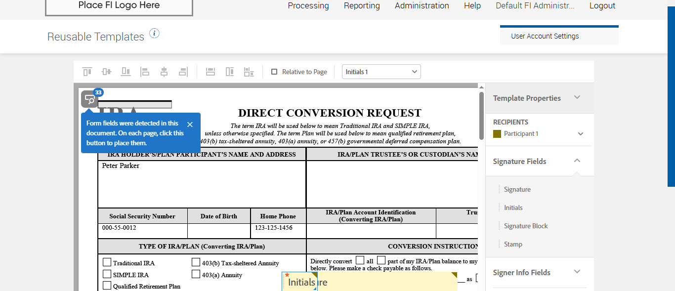 Expected: Expected Tooltip Create pre-configured documents designed for repeated use by defining fixed content and structure such as signature fields, text fields, and other form elements, ensuring that each signer interacts with the document in a consistent way.