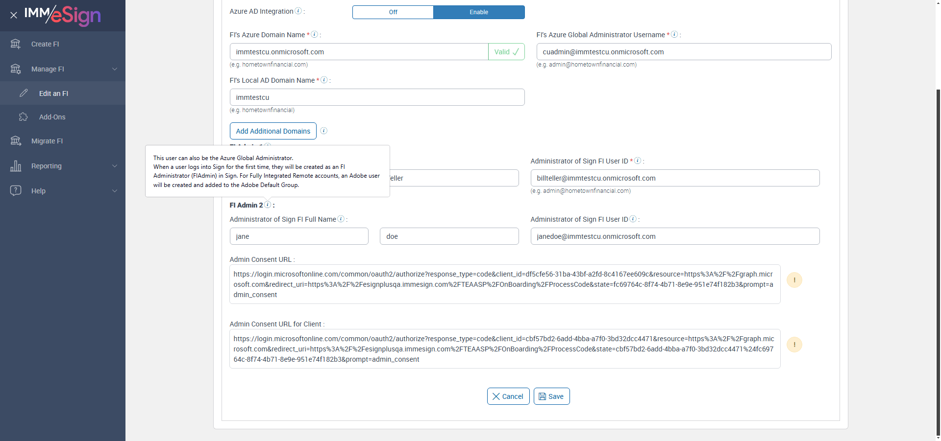 | 08:38:36 PM | Successfully verified Fi Admin 2 tool tip This user can also be the Azure Global Administrator. When a user logs into Sign for the first time, they will be created as an FI Administrator (FIAdmin) in Sign. For Fully Integrated Remote accounts, an Adobe user will be created and added to the Adobe Default Group. equals to This user can also be the Azure Global Administrator. When a user logs into Sign for the first time, they will be created as an FI Administrator (FIAdmin) in Sign. For Fully Integrated Remote accounts, an Adobe user will be created and added to the Adobe Default Group. [ScreenShot] | |