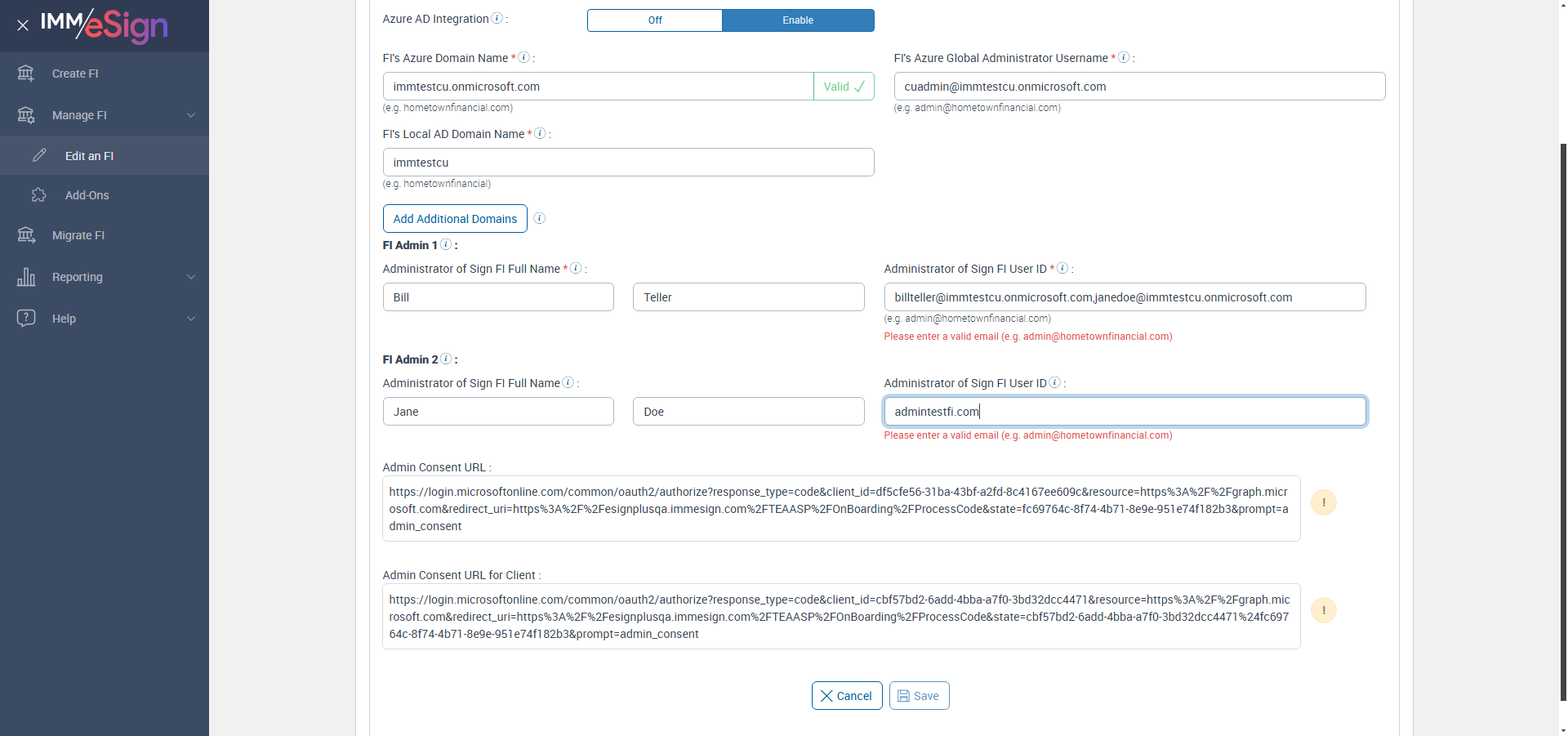 | 08:38:34 PM | Successfully verified Fi Admin 1 tool tip This user will be created as an FI Administrator (FIAdmin) in Sign. For the Fully Integrated Remote account this user will be added to the Default Group in the institution’s Adobe account. This user can be the same as the Azure Global Administrator. equals to This user will be created as an FI Administrator (FIAdmin) in Sign. For the Fully Integrated Remote account this user will be added to the Default Group in the institution’s Adobe account. This user can be the same as the Azure Global Administrator. [ScreenShot] | |