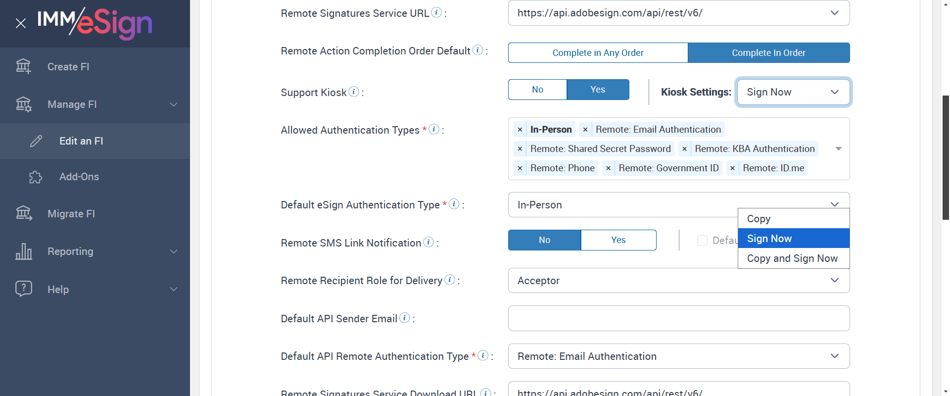 Actual(Passed): Verified Kiosk setting dropdown fields value - [Copy, Sign Now, Copy and Sign Now][ScreenShot]