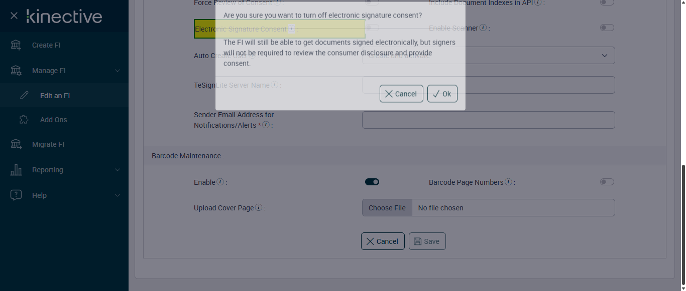 Expected: Are you sure you want to turn off electronic signature consent? The FI will still be able to get documents signed electronically, but signers will not be required to review the consumer disclosure and provide consent.