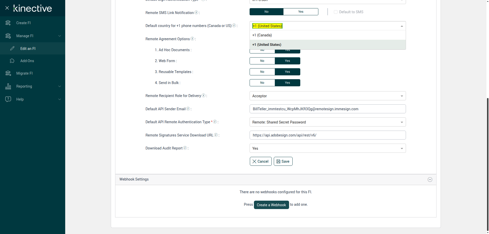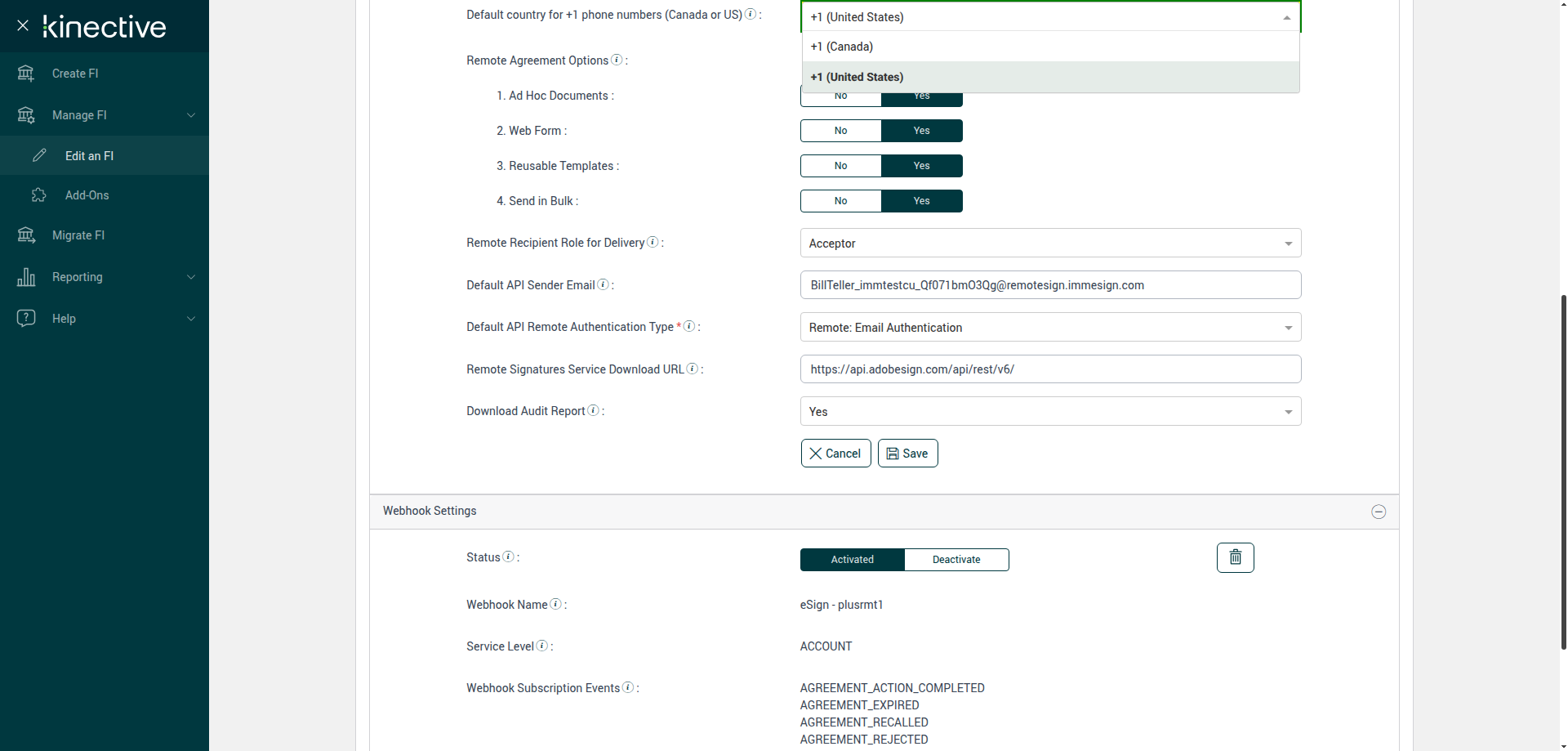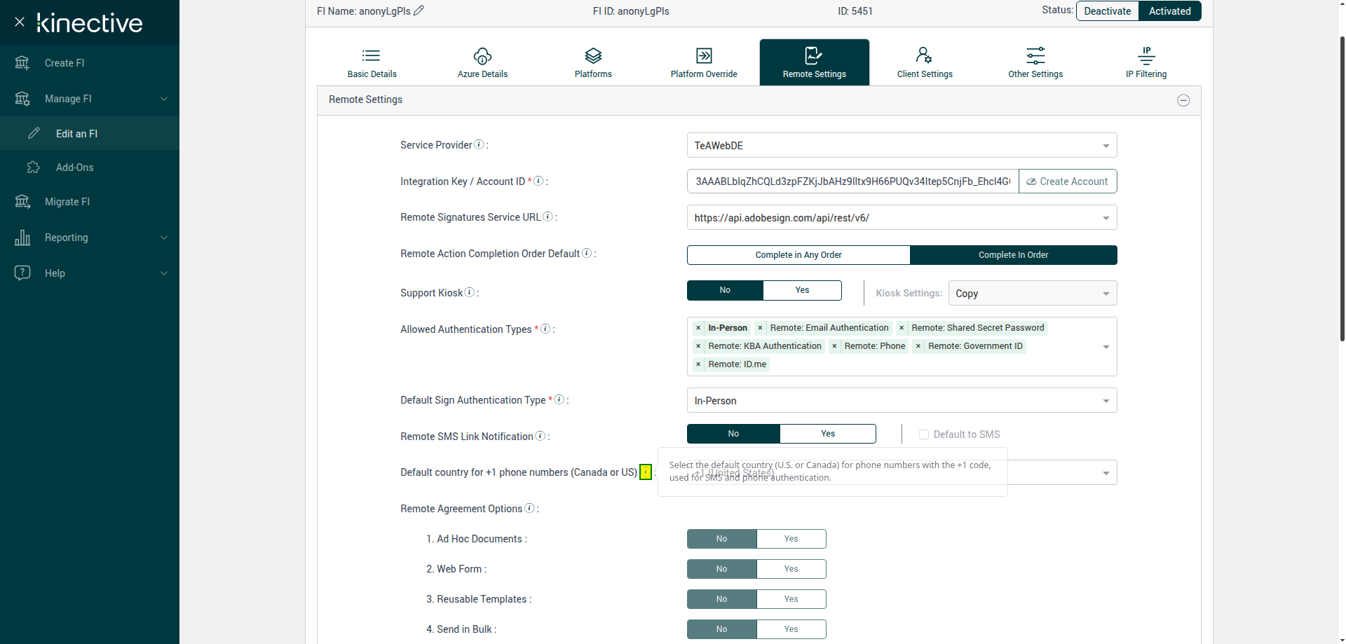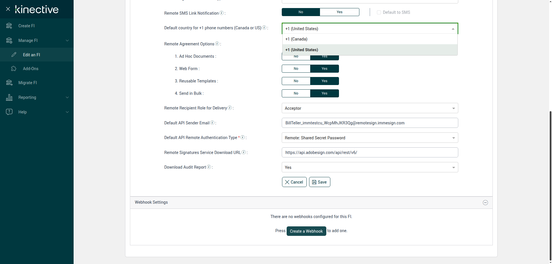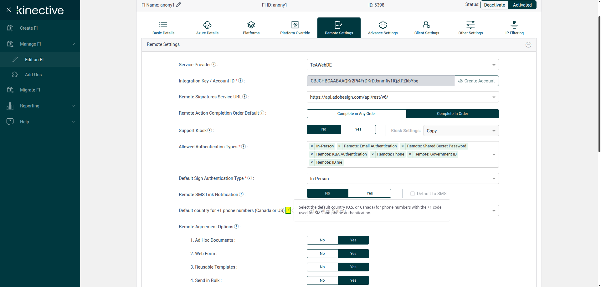 (Verify Manage FI Remote Settings Country Code Drop Down Existing FI)