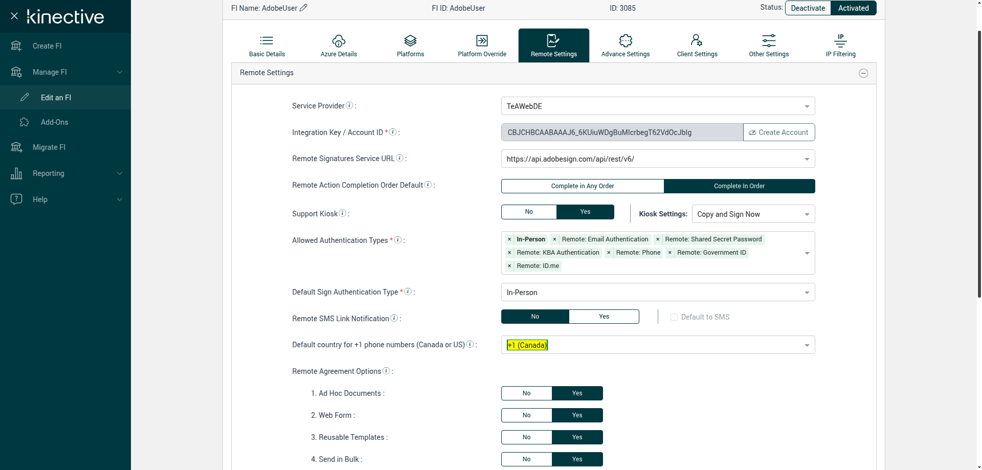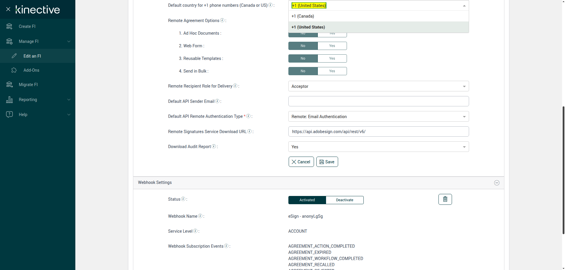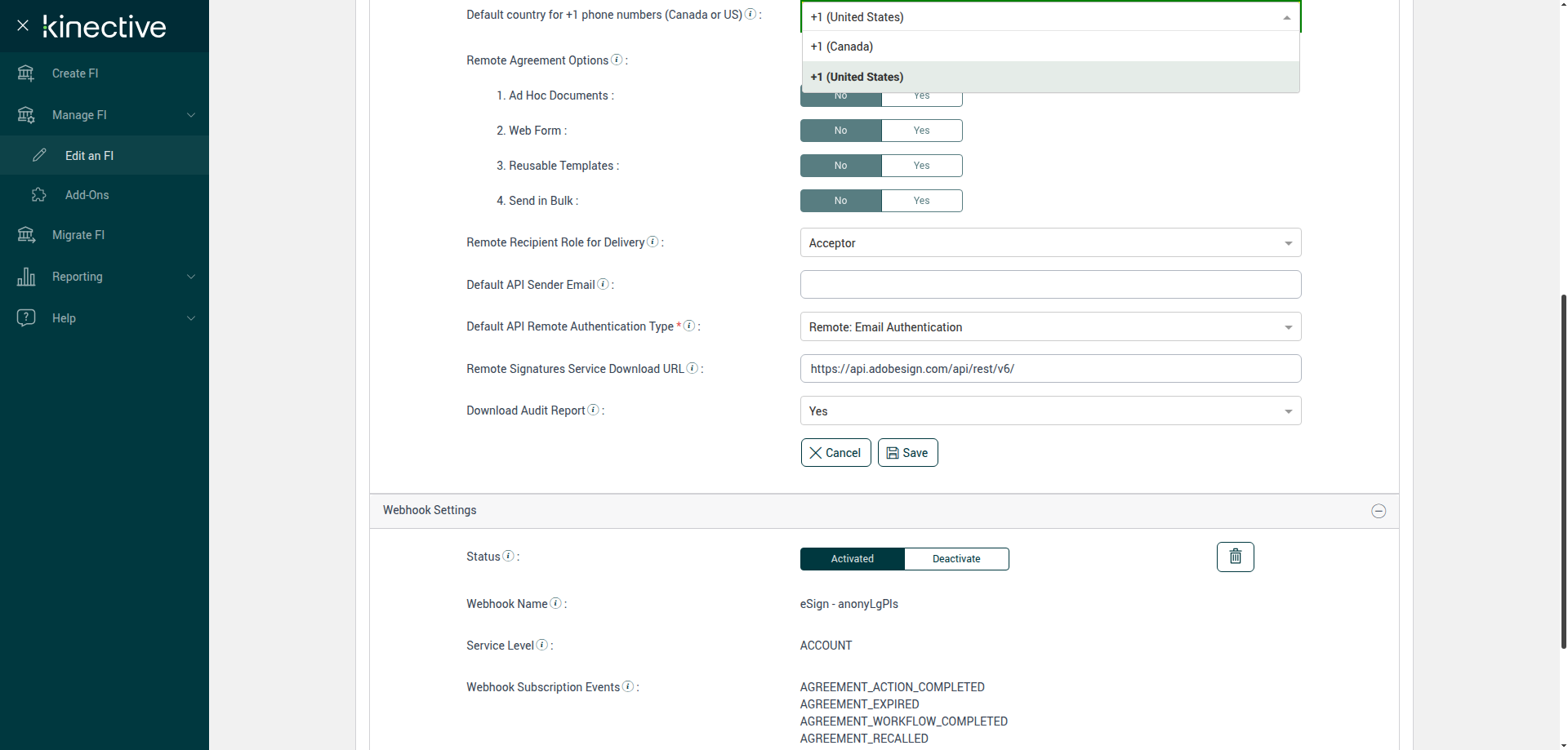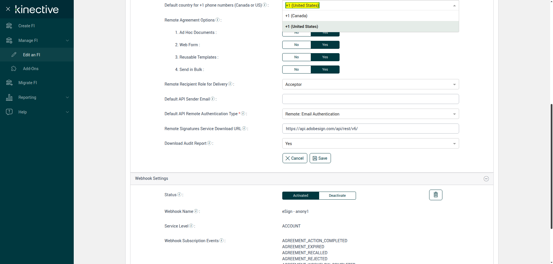 (Verify Manage FI Remote Settings Country Code Drop Down Existing FI)