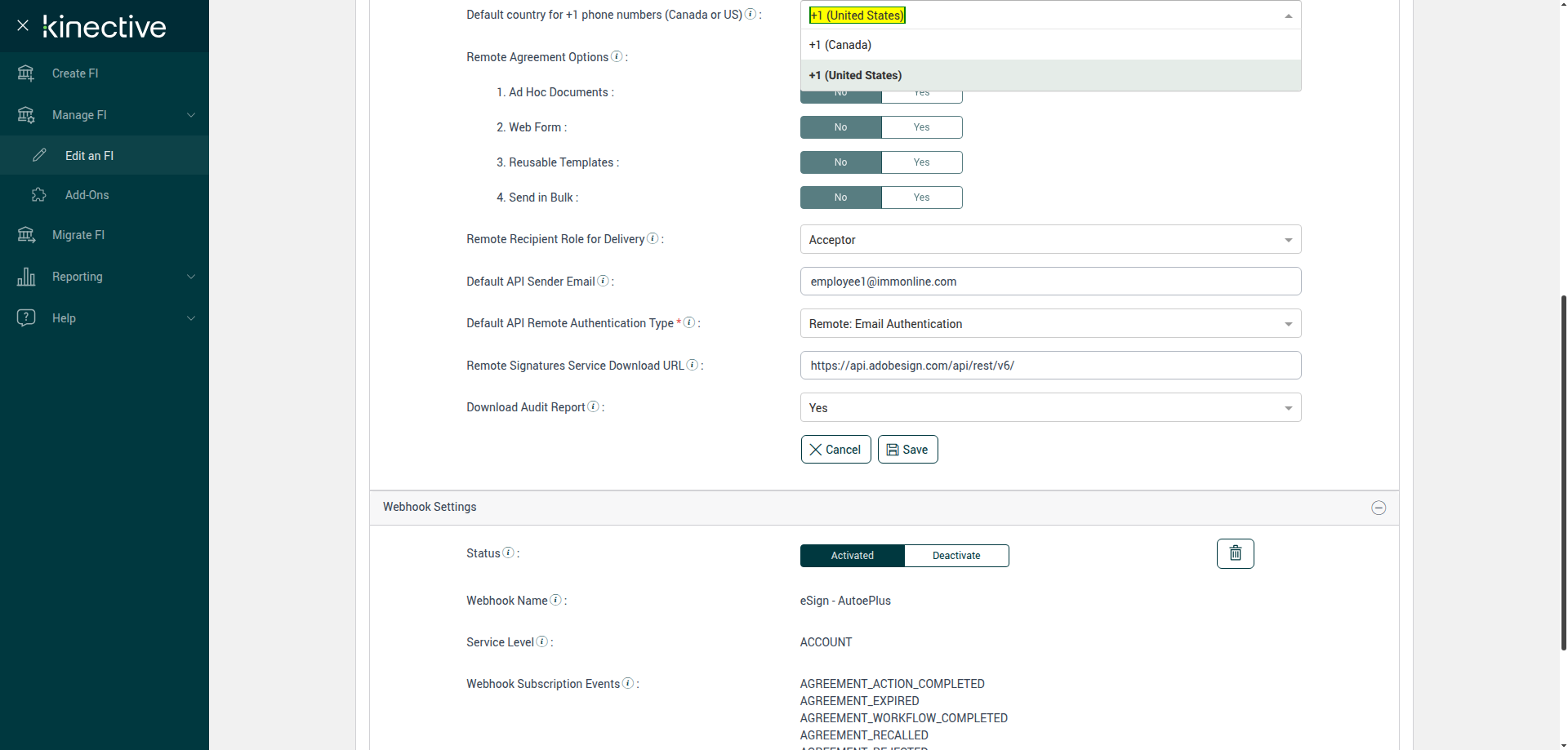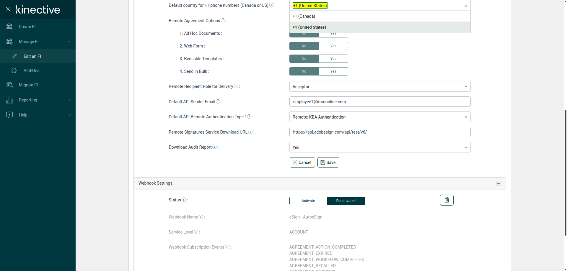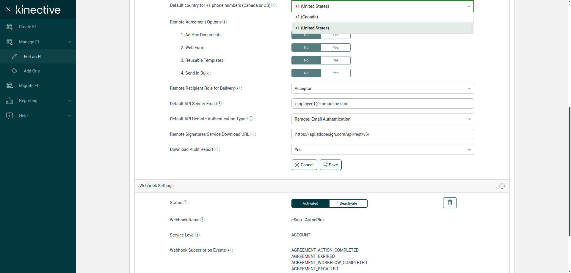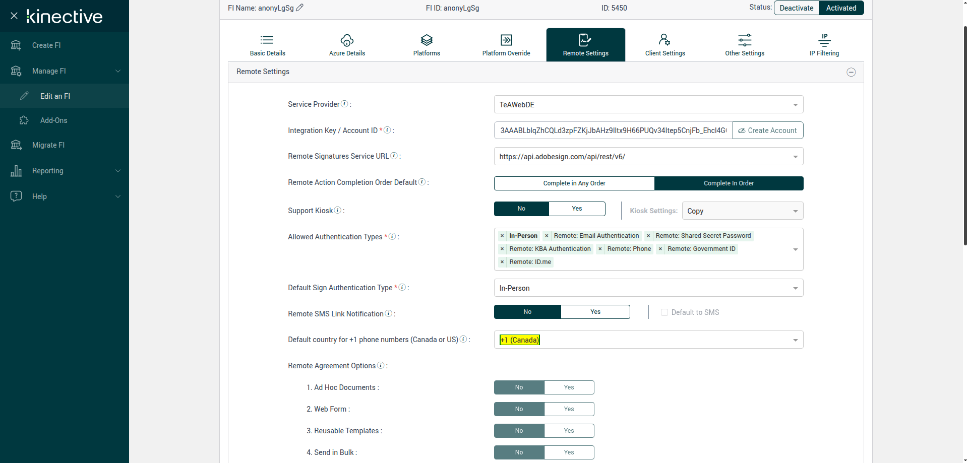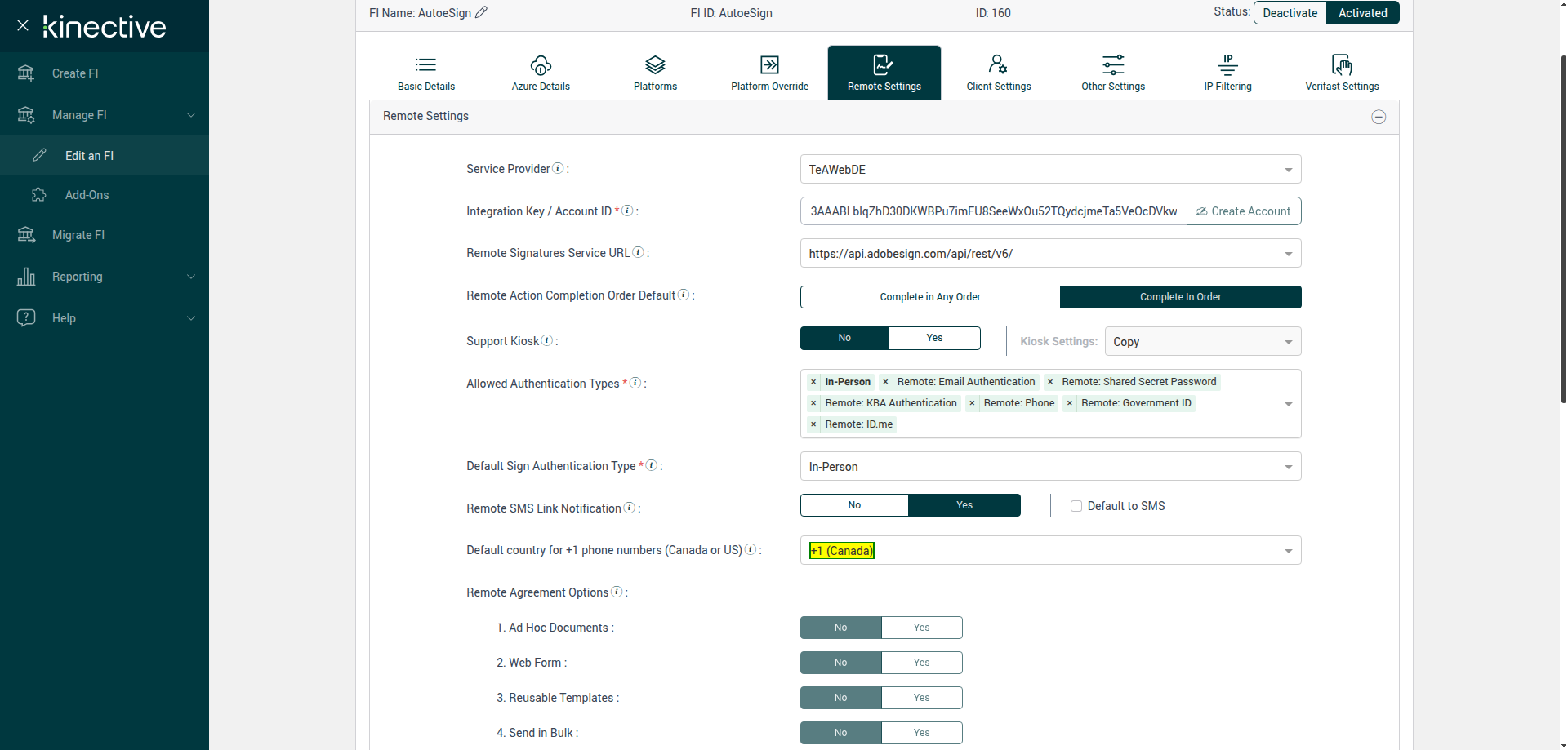 (Verify Manage FI Remote Settings Country Code Drop Down Existing FI)