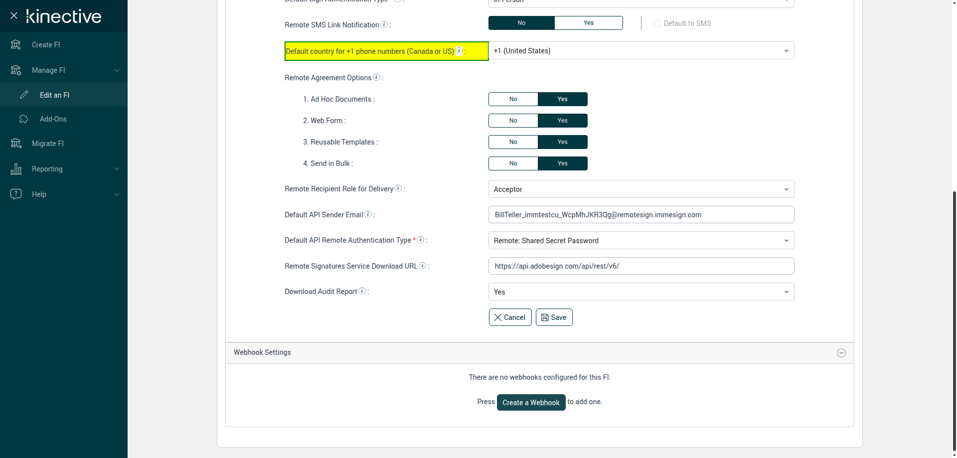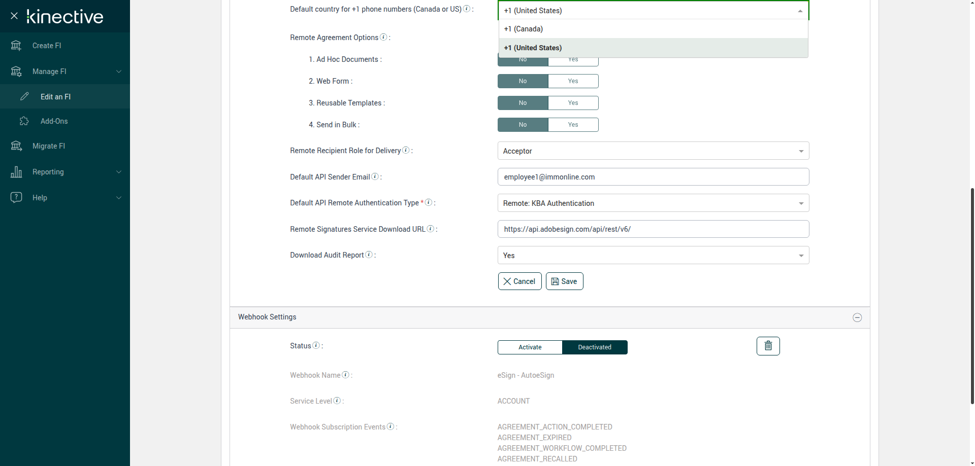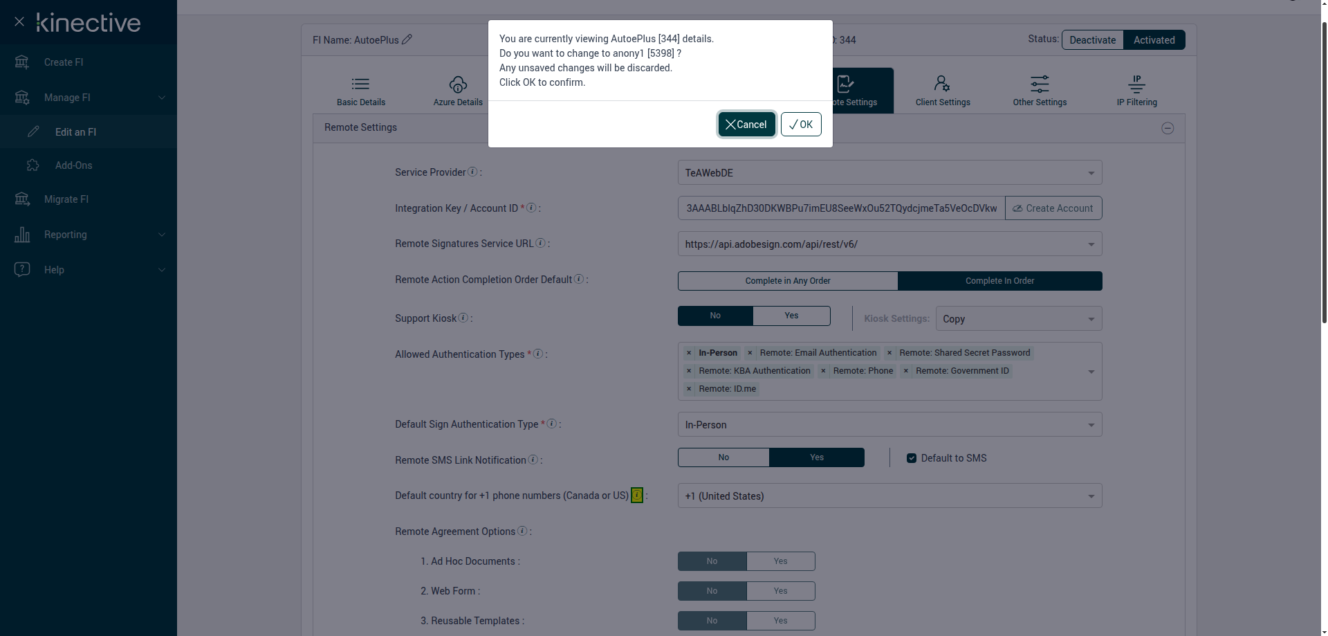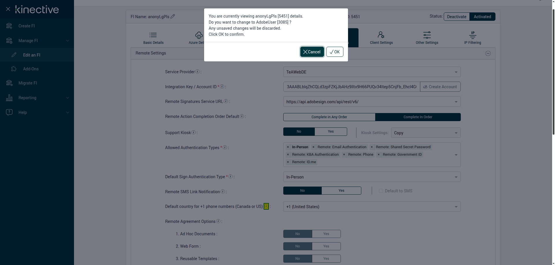 (Verify Manage FI Remote Settings Country Code Drop Down Existing FI)