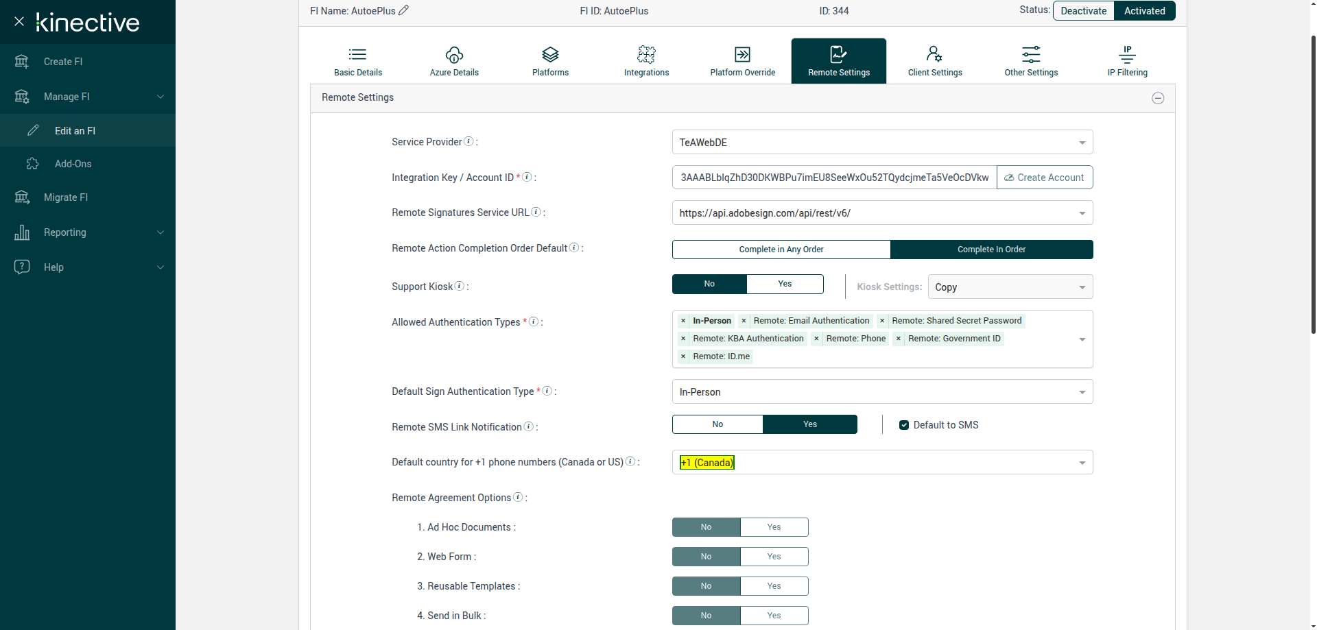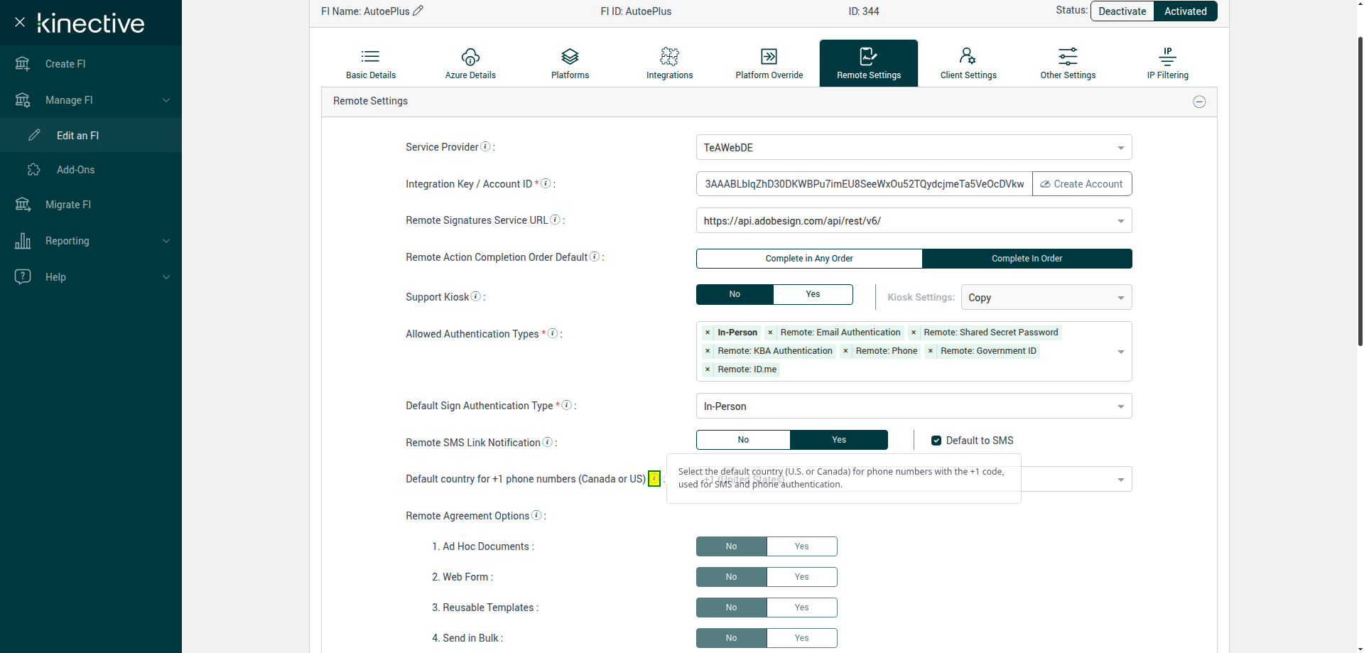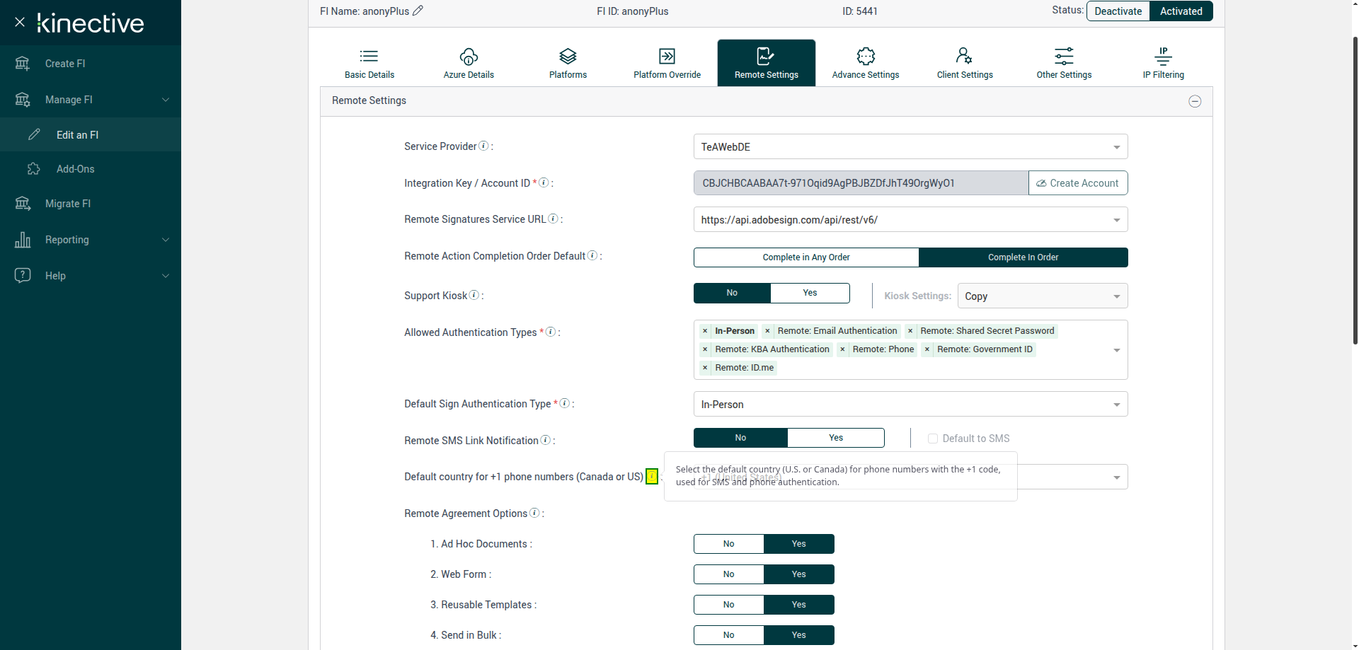Verify Manage FI Remote Settings Country Code Drop Down Existing FI - Fully Integrated - PlusFI