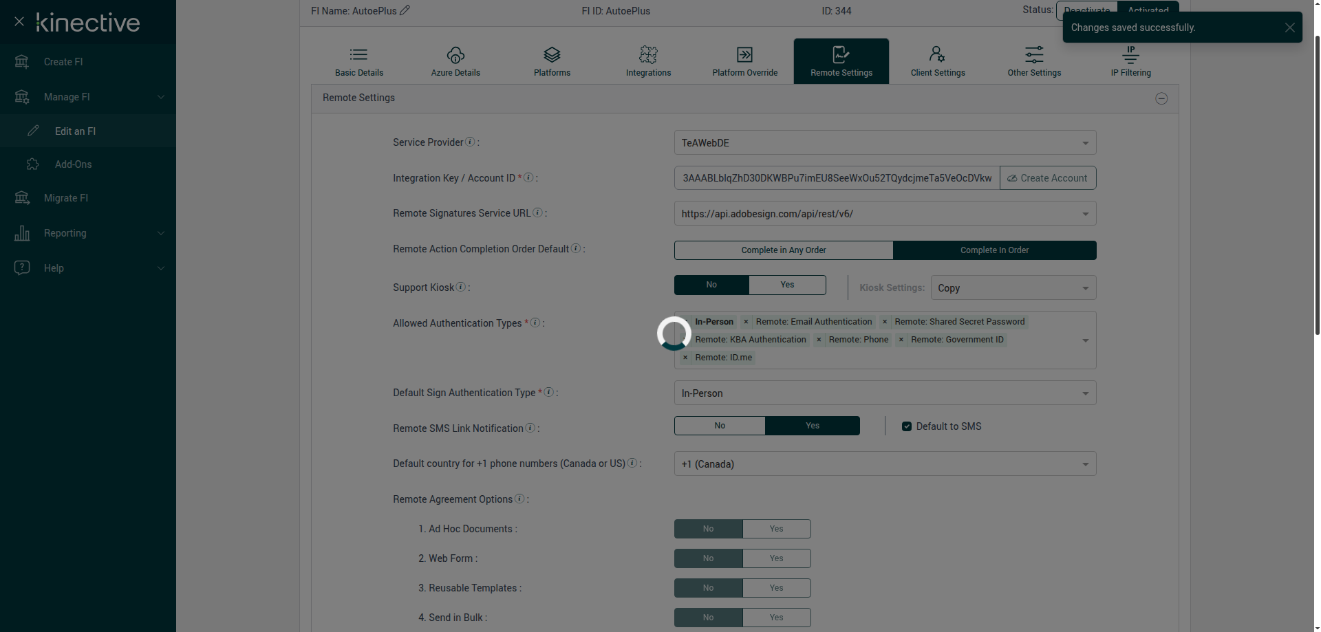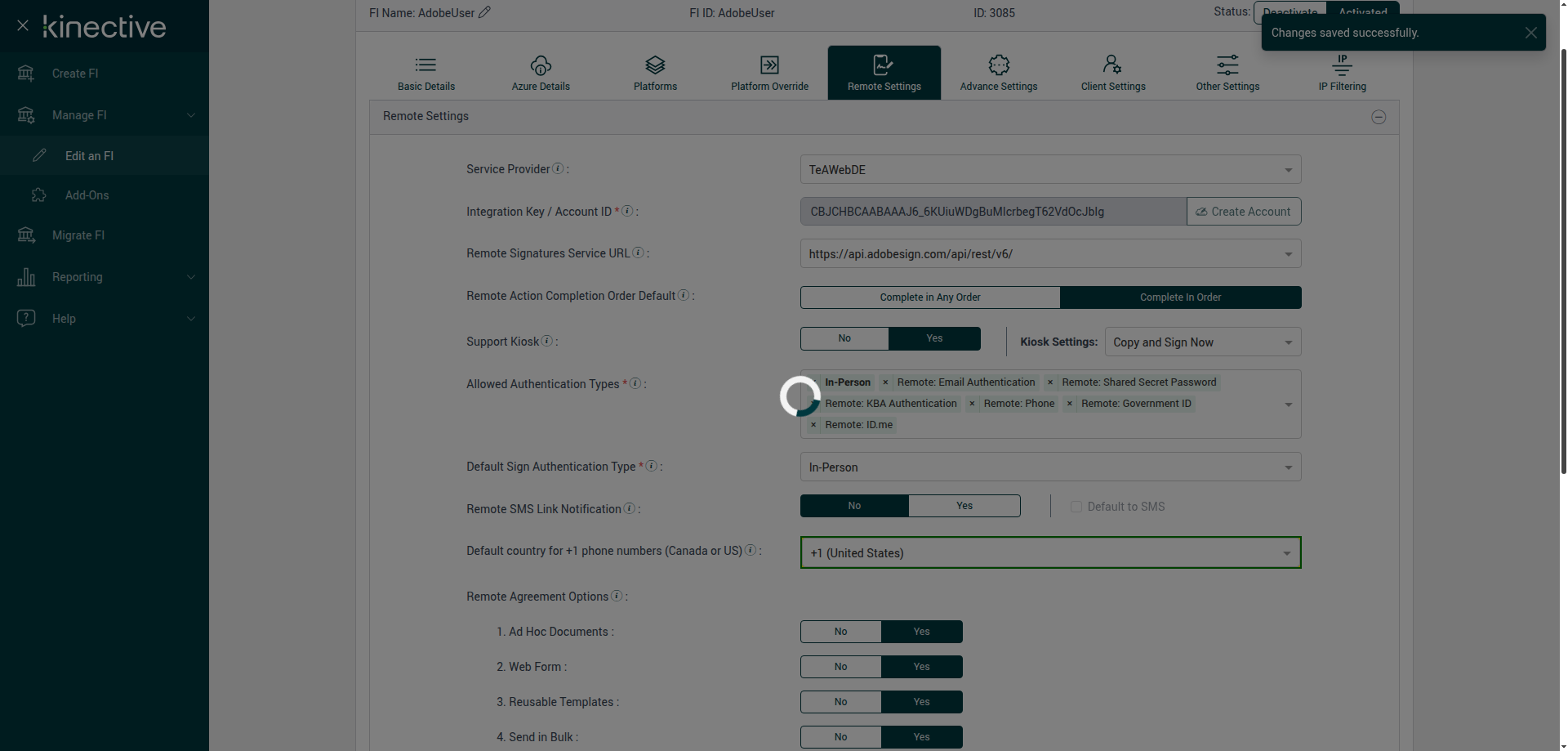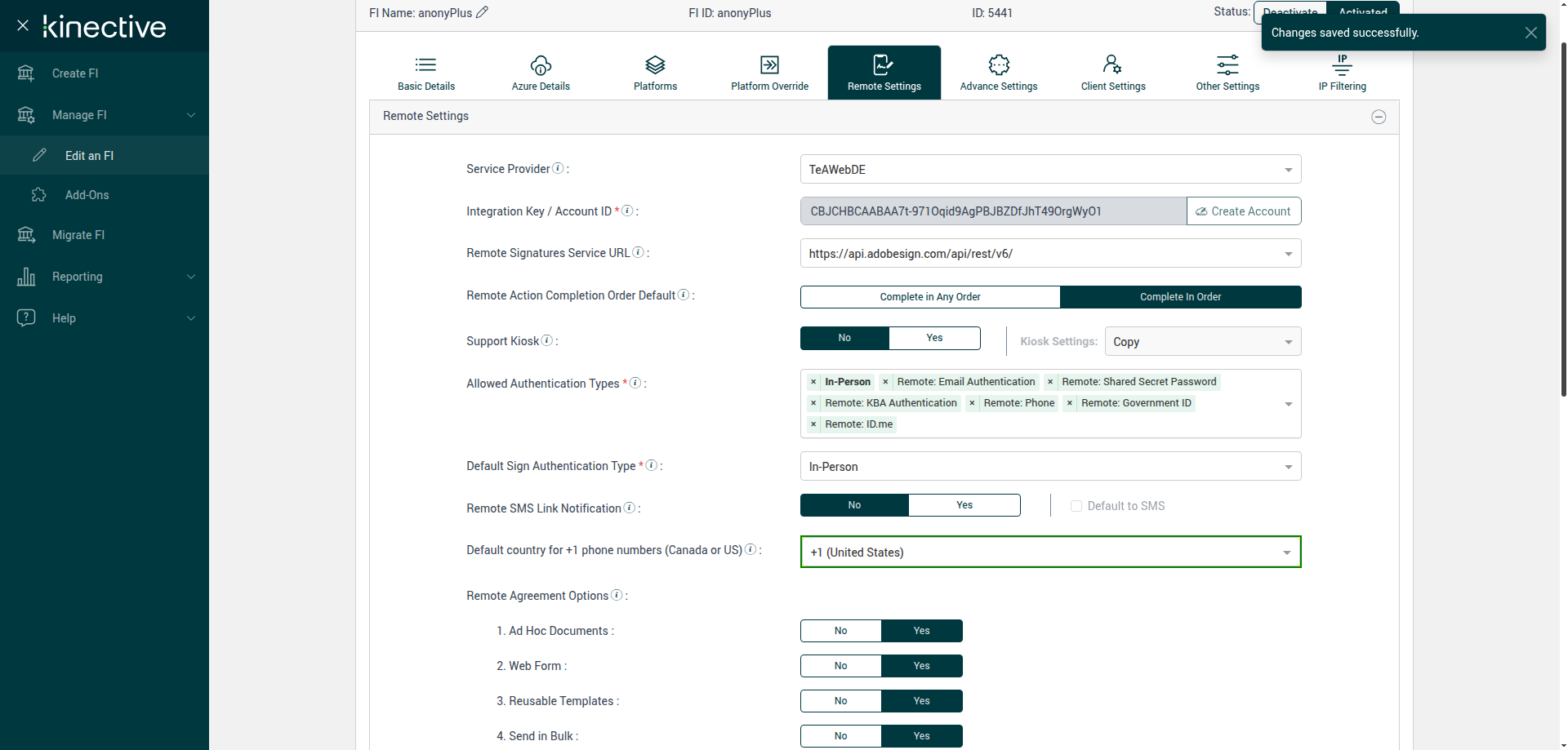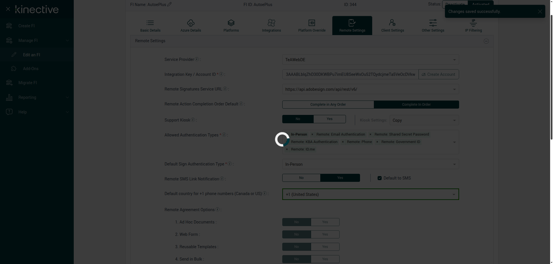 Verify Manage FI Remote Settings Country Code Drop Down Existing FI - Fully Integrated - PlusFI