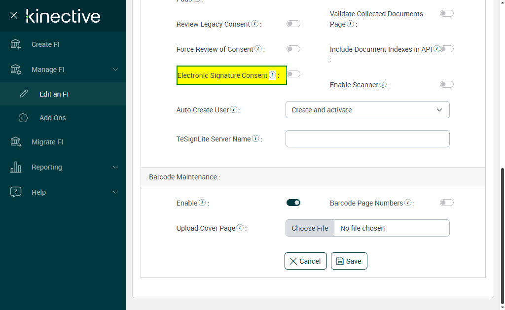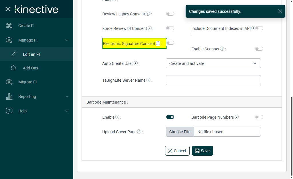 Expected: Are you sure you want to turn off electronic signature consent? The FI will still be able to get documents signed electronically, but signers will not be required to review the consumer disclosure and provide consent.