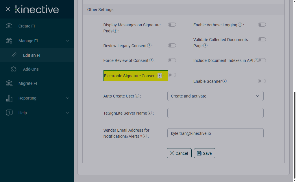 verify Electronic Signature Consent in Other Settings Page Existing FI - Legacy - SignFI COMMENTS: