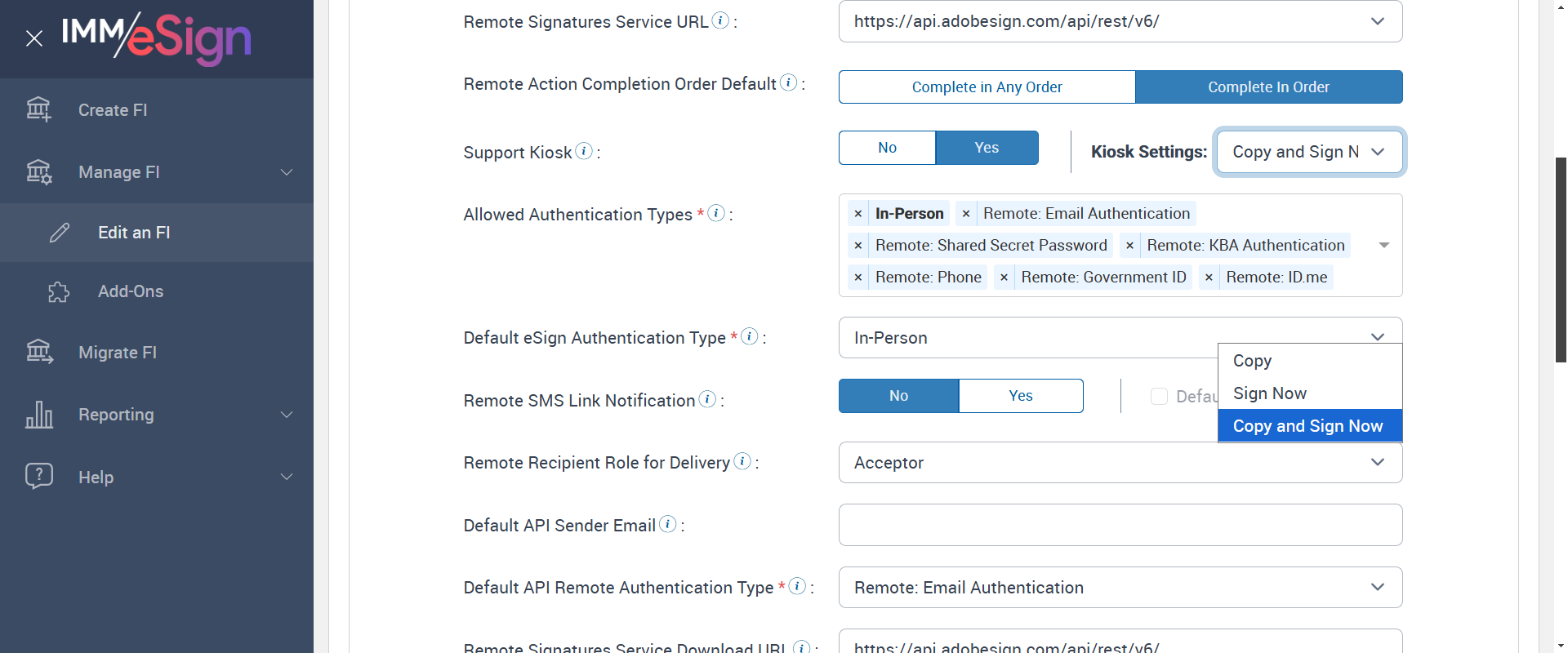 Actual(Passed): Verified Kiosk setting dropdown fields value - [Copy, Sign Now, Copy and Sign Now][ScreenShot]