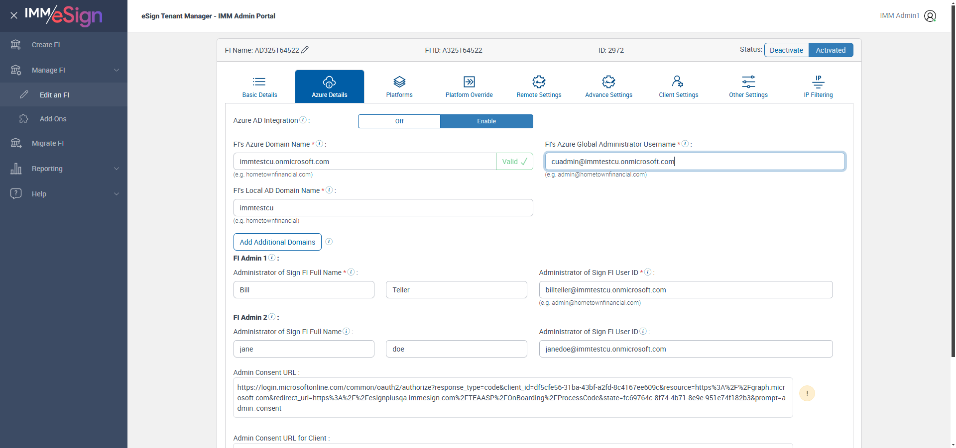 | 06:08:51 PM | Successfully verified Fi Admin 1 tool tip This user will be created as an FI Administrator (FIAdmin) in Sign. For the Fully Integrated Remote account this user will be added to the Default Group in the institution’s Adobe account. This user can be the same as the Azure Global Administrator. equals to This user will be created as an FI Administrator (FIAdmin) in Sign. For the Fully Integrated Remote account this user will be added to the Default Group in the institution’s Adobe account. This user can be the same as the Azure Global Administrator. [ScreenShot] | |