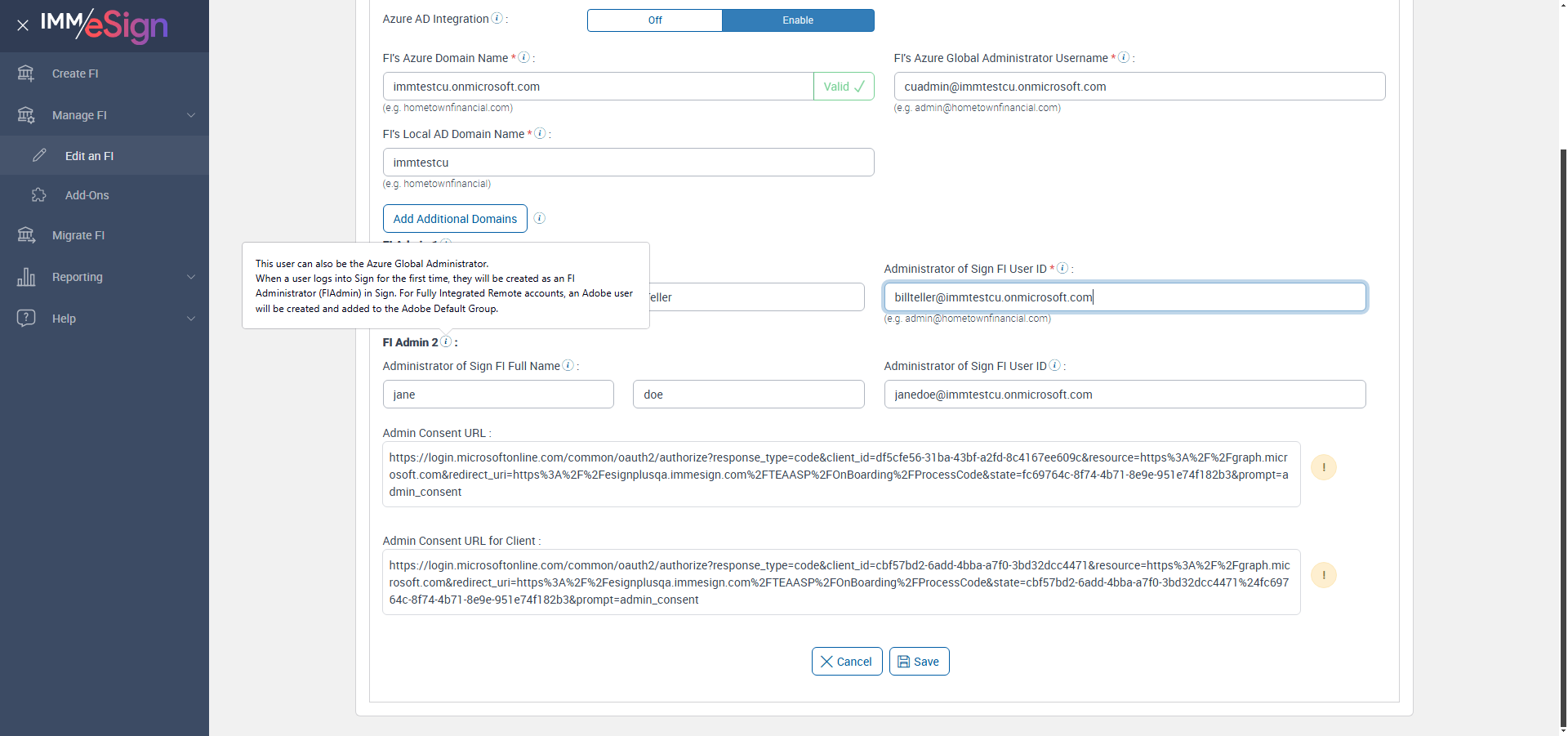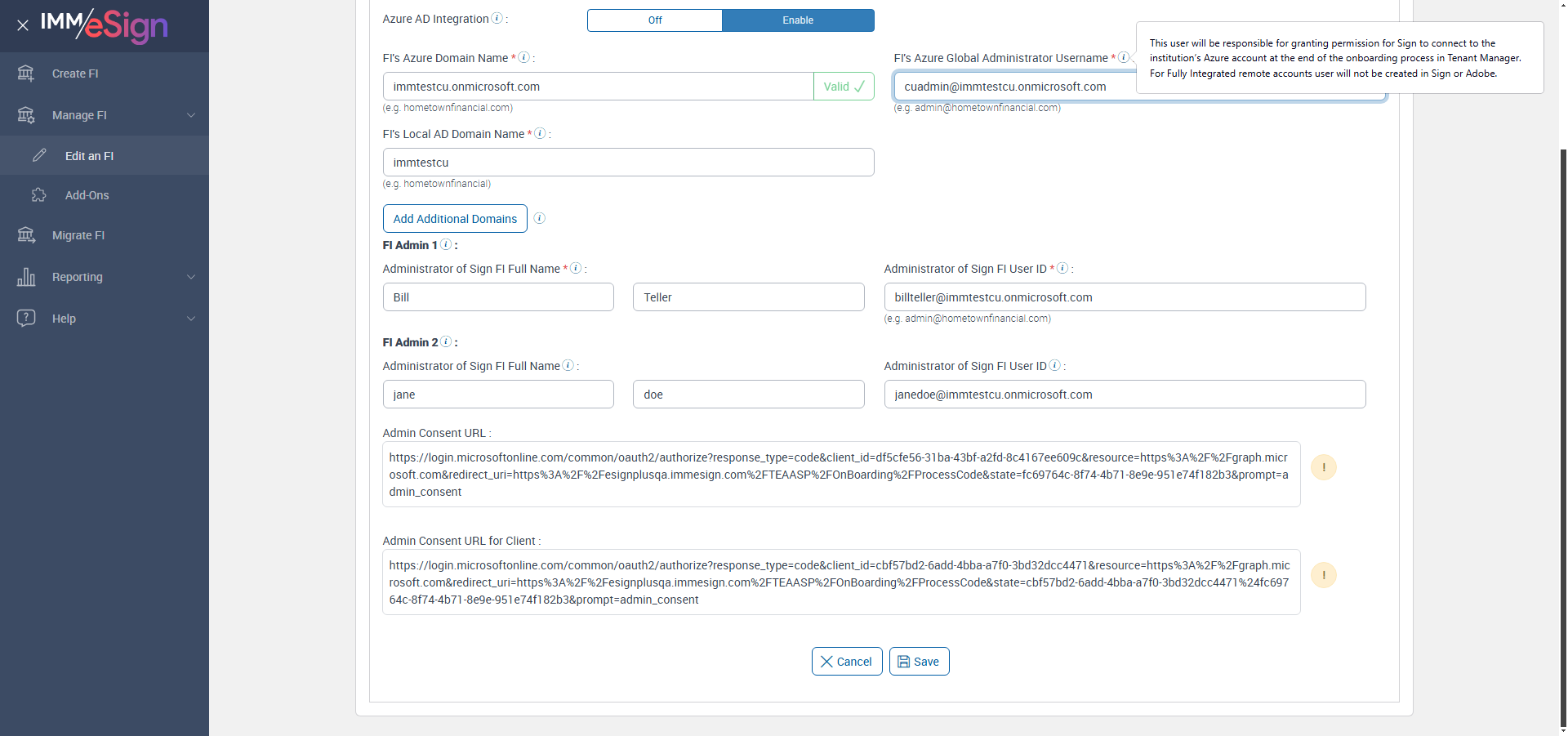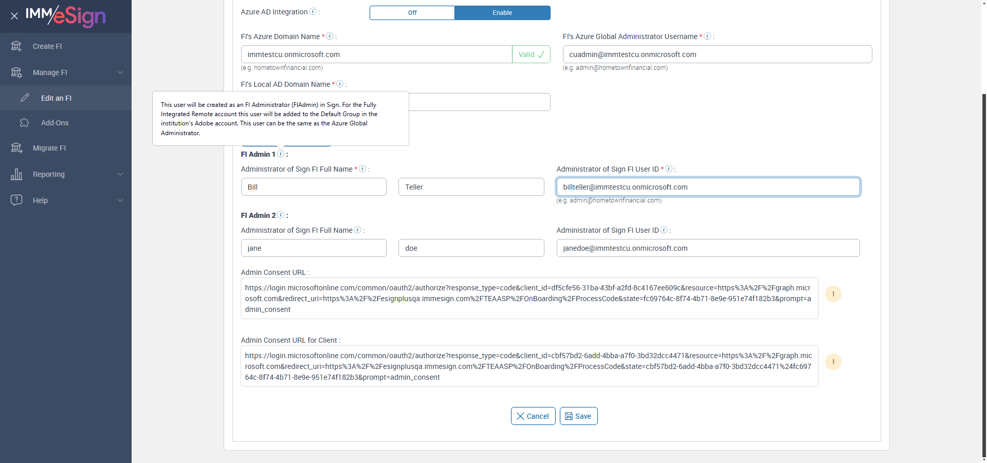 | 06:08:54 PM | Failed to verify Fi Admin 2 tool tip This user can also be the Azure Global Administrator. When a user logs into Sign for the first time, they will be created as an FI Administrator (FIAdmin) in Sign. For Fully Integrated Remote accounts, an Adobe user will be created and added to the Adobe Default Group. equals to This user will be created as an FI Administrator (FIAdmin) in Sign. For the Fully Integrated Remote account this user will be added to the Default Group in the institution’s Adobe account. This user can be the same as the Azure Global Administrator. [ScreenShot] | |