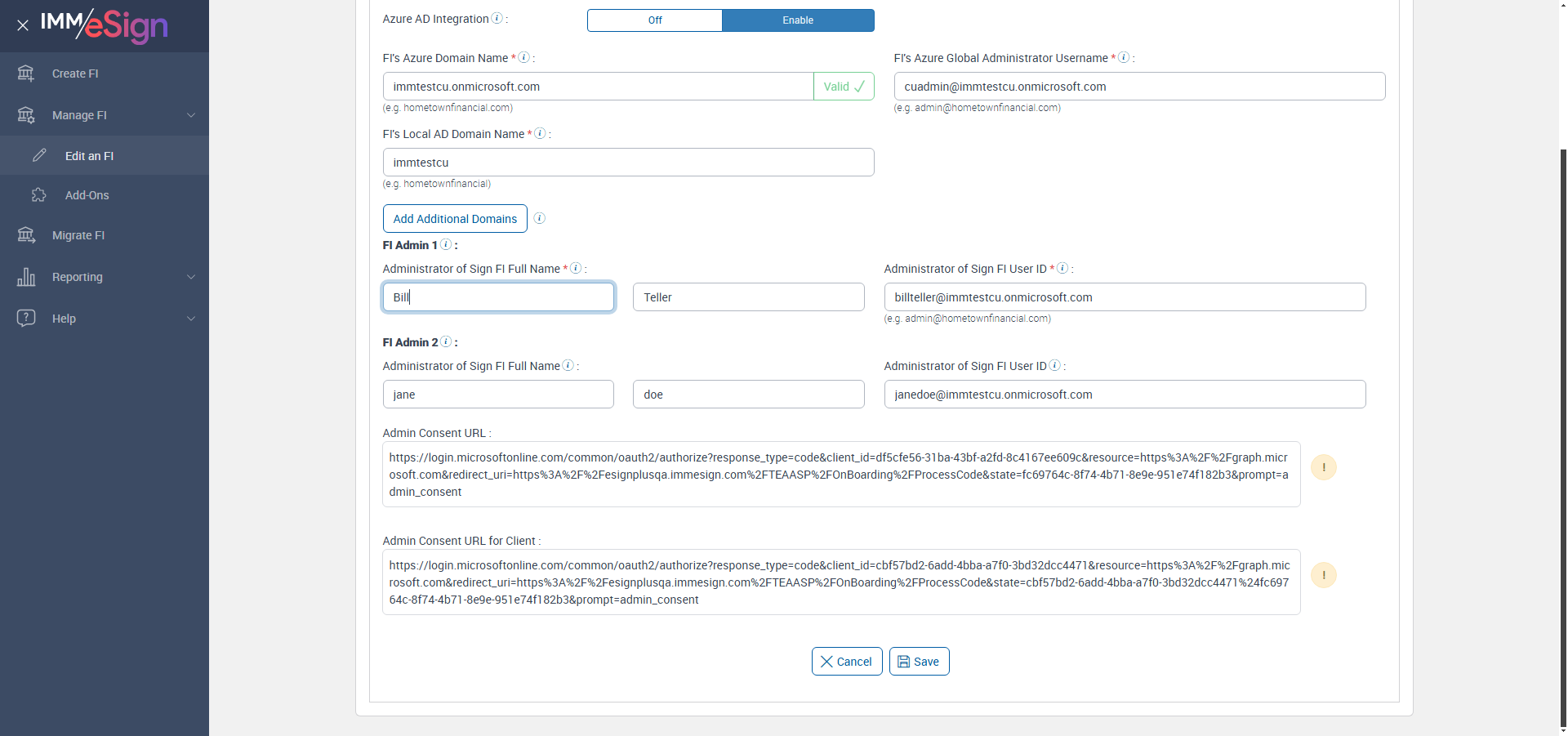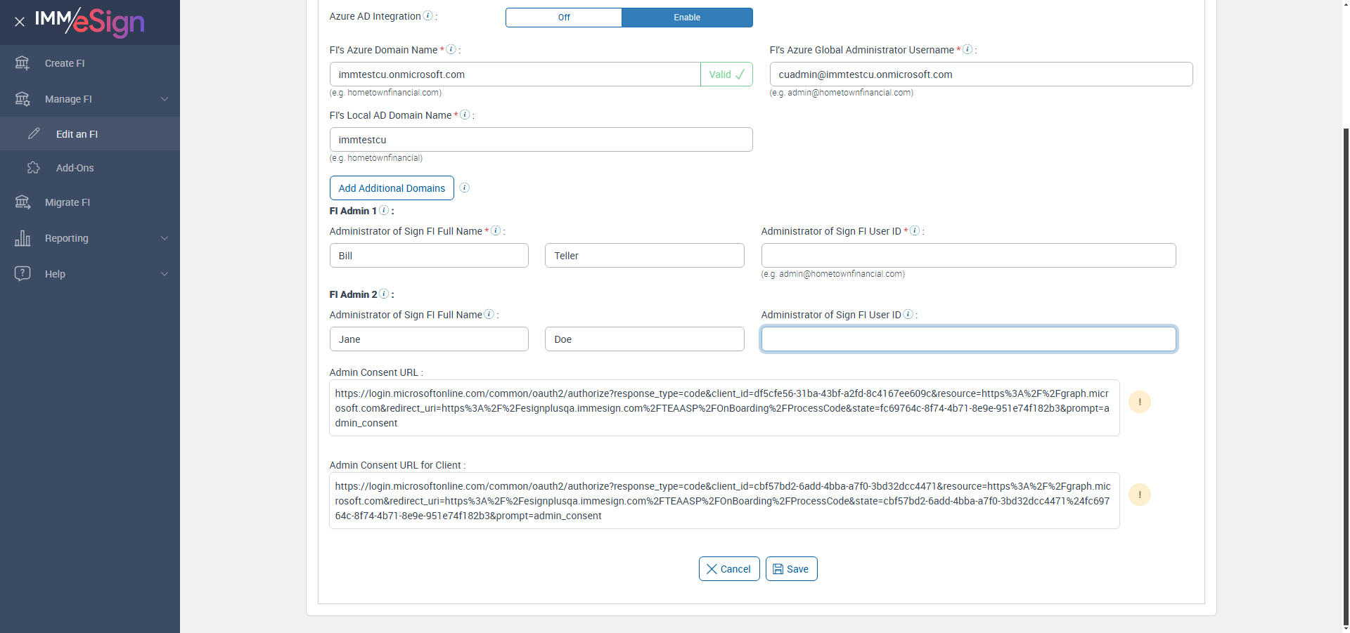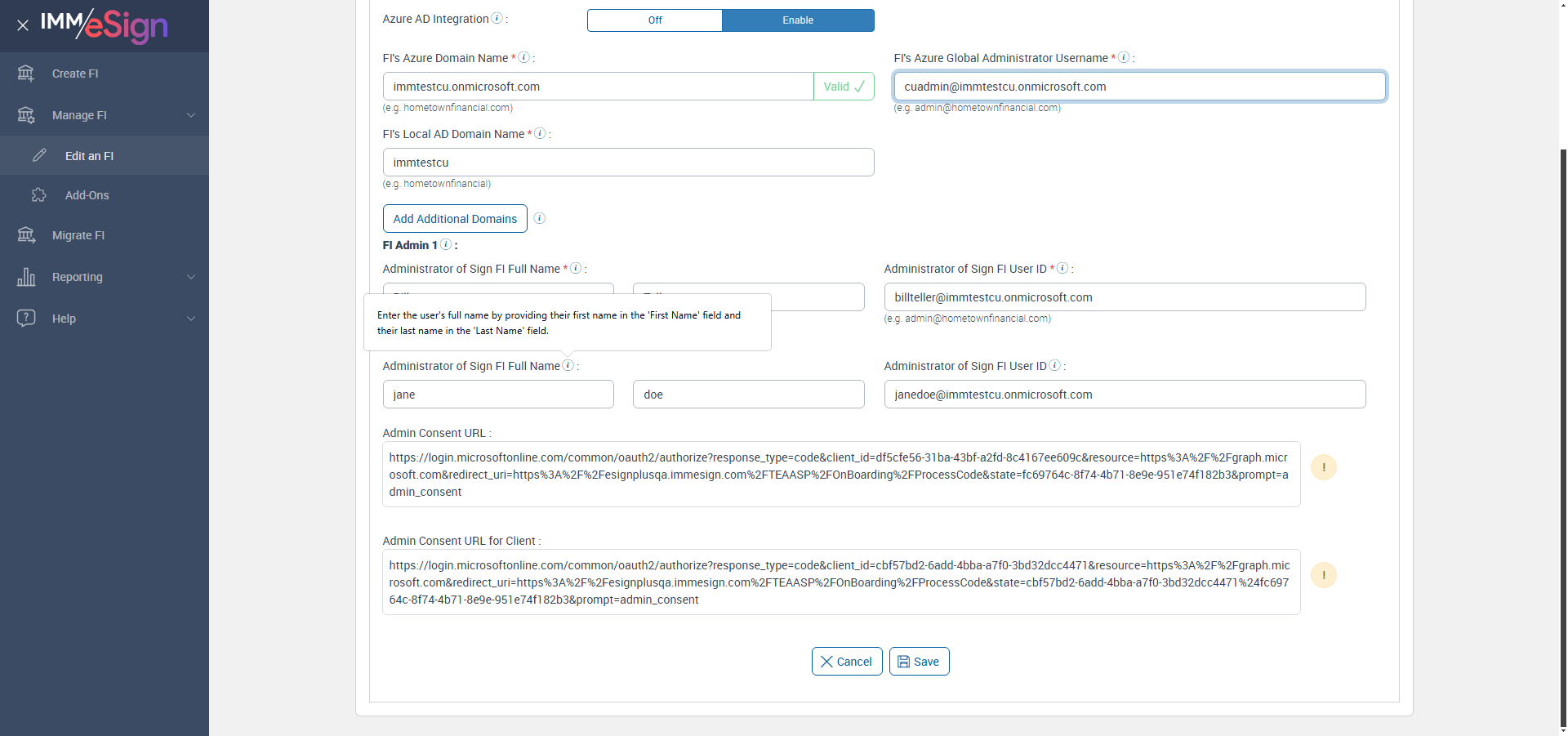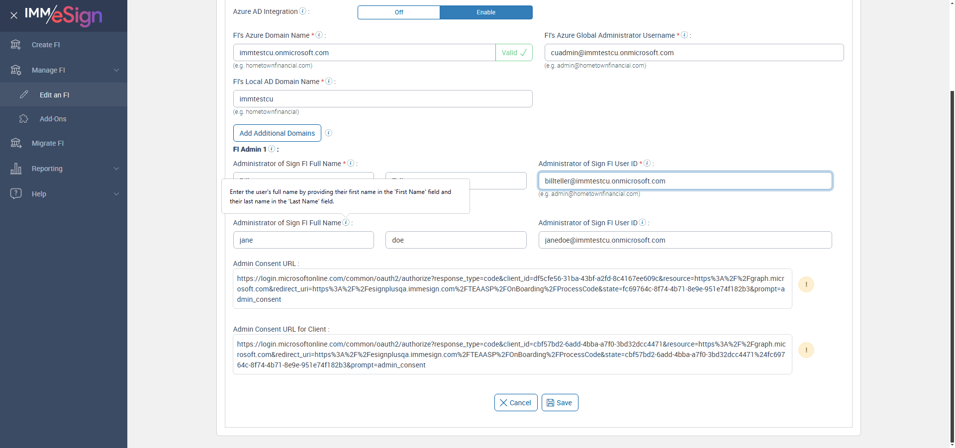 | 06:08:54 PM | Failed to verify Fi Admin 2 tool tip This user can also be the Azure Global Administrator. When a user logs into Sign for the first time, they will be created as an FI Administrator (FIAdmin) in Sign. For Fully Integrated Remote accounts, an Adobe user will be created and added to the Adobe Default Group. equals to This user will be created as an FI Administrator (FIAdmin) in Sign. For the Fully Integrated Remote account this user will be added to the Default Group in the institution’s Adobe account. This user can be the same as the Azure Global Administrator. [ScreenShot] | |