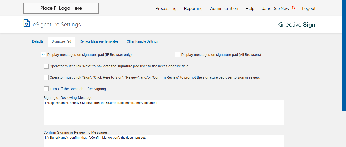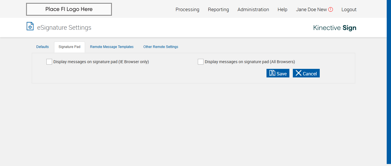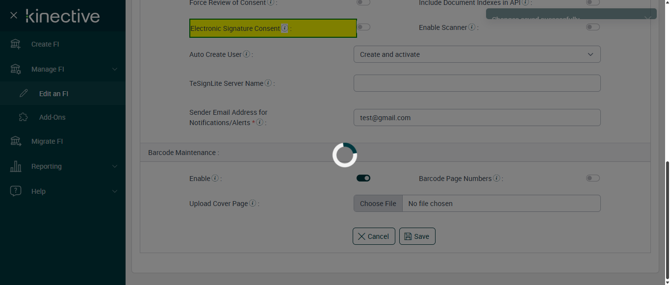 Actual(Passed): Successfully verified Electronic Signature Consent confirmation popup message Are you sure you want to turn off electronic signature consent? The FI will still be able to get documents signed electronically, but signers will not be required to review the consumer disclosure and provide consent.[ScreenShot]