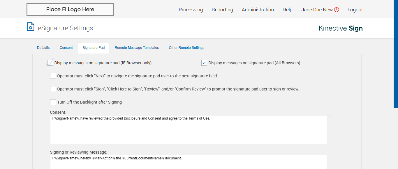 Expected: Electronic Signature Consent enabled by default