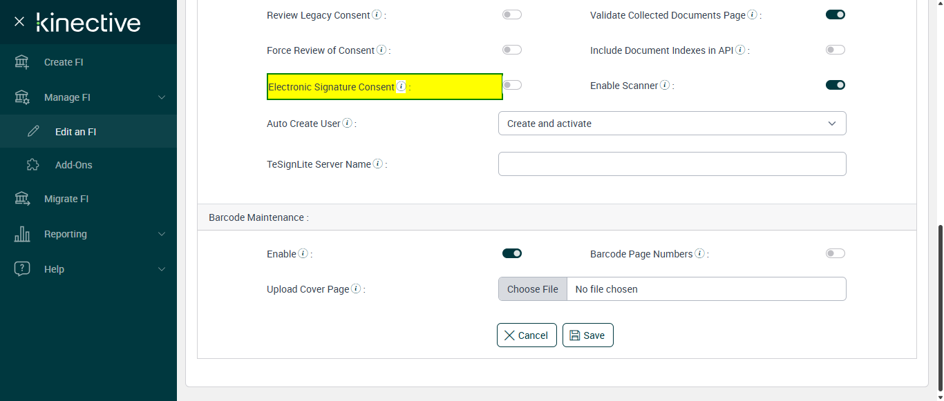 Expected: Are you sure you want to turn off electronic signature consent? The FI will still be able to get documents signed electronically, but signers will not be required to review the consumer disclosure and provide consent.