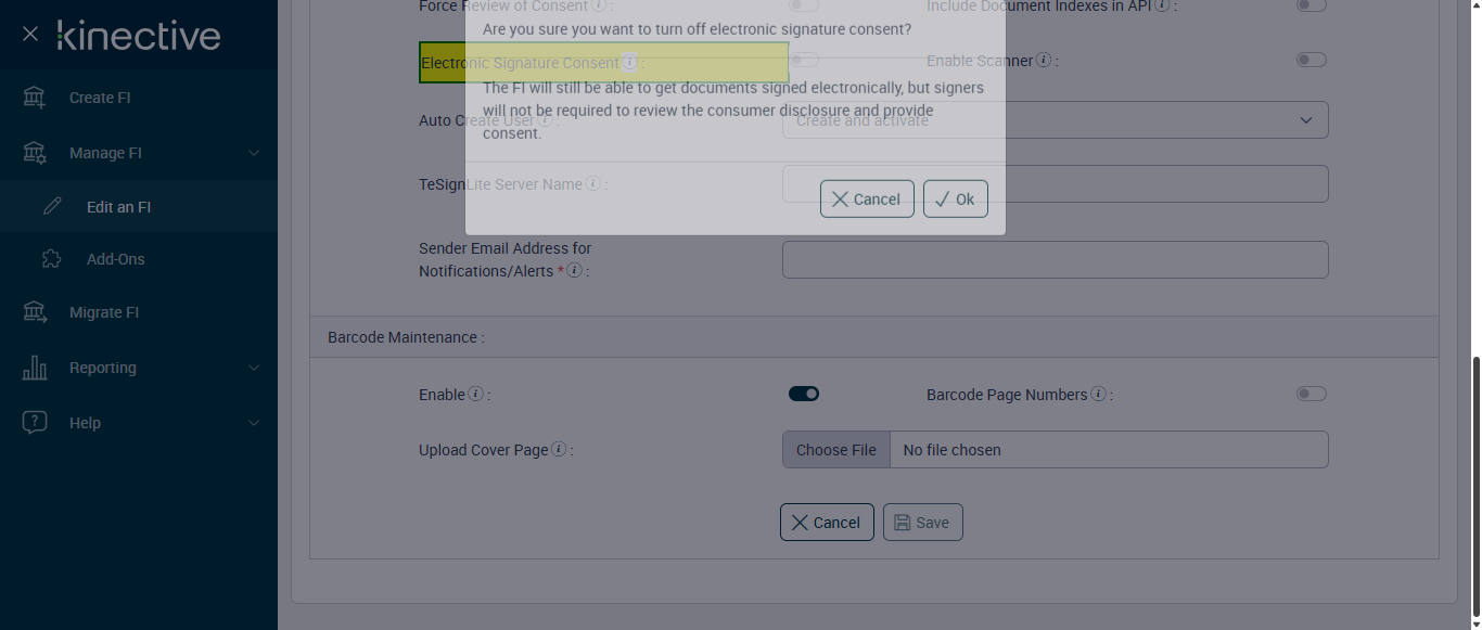 Expected: Are you sure you want to turn off electronic signature consent? The FI will still be able to get documents signed electronically, but signers will not be required to review the consumer disclosure and provide consent.