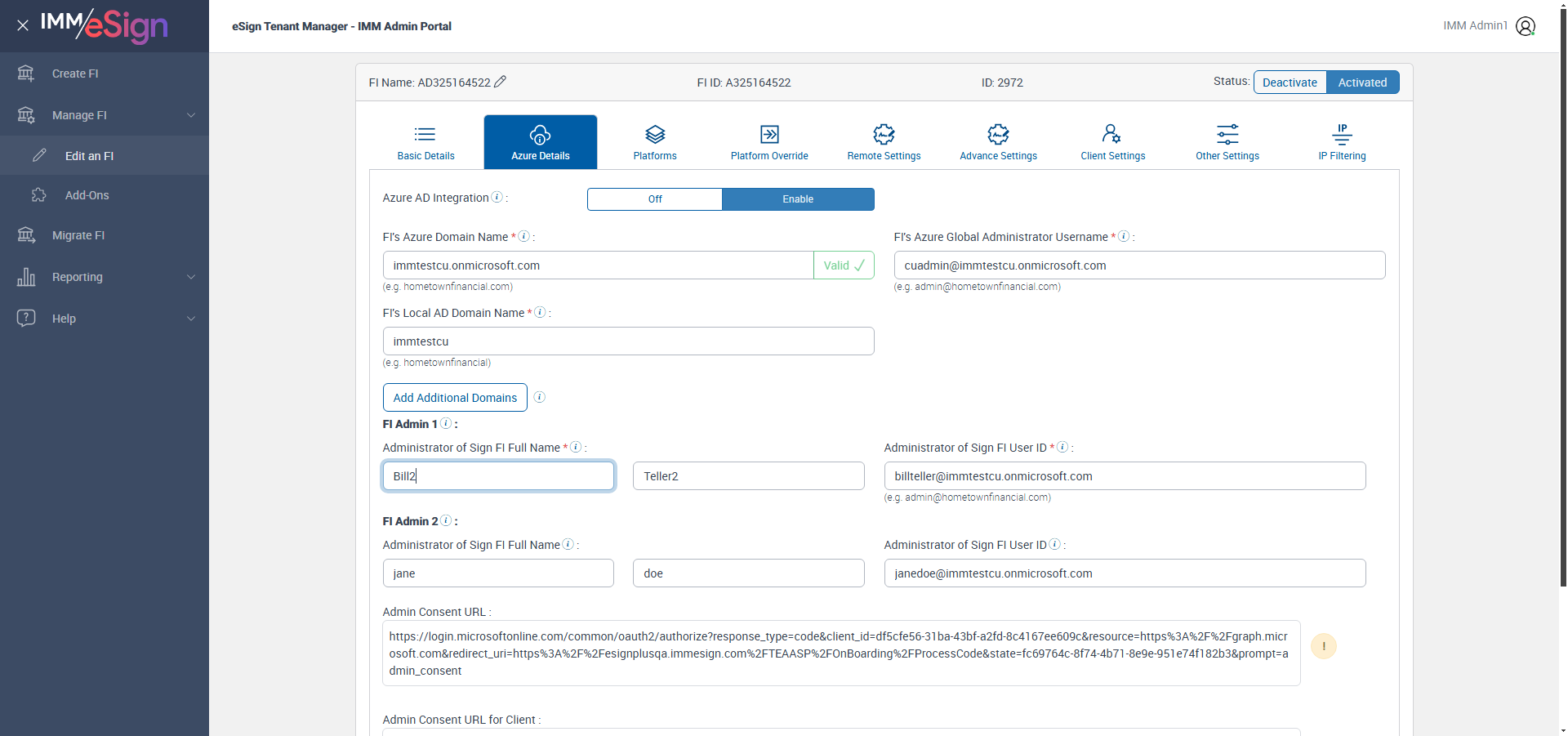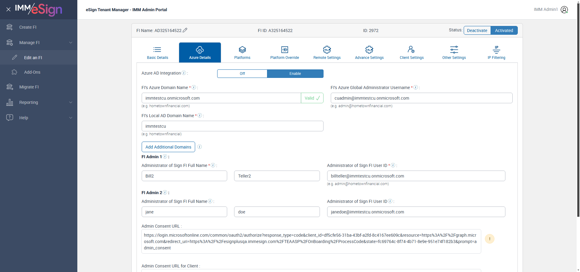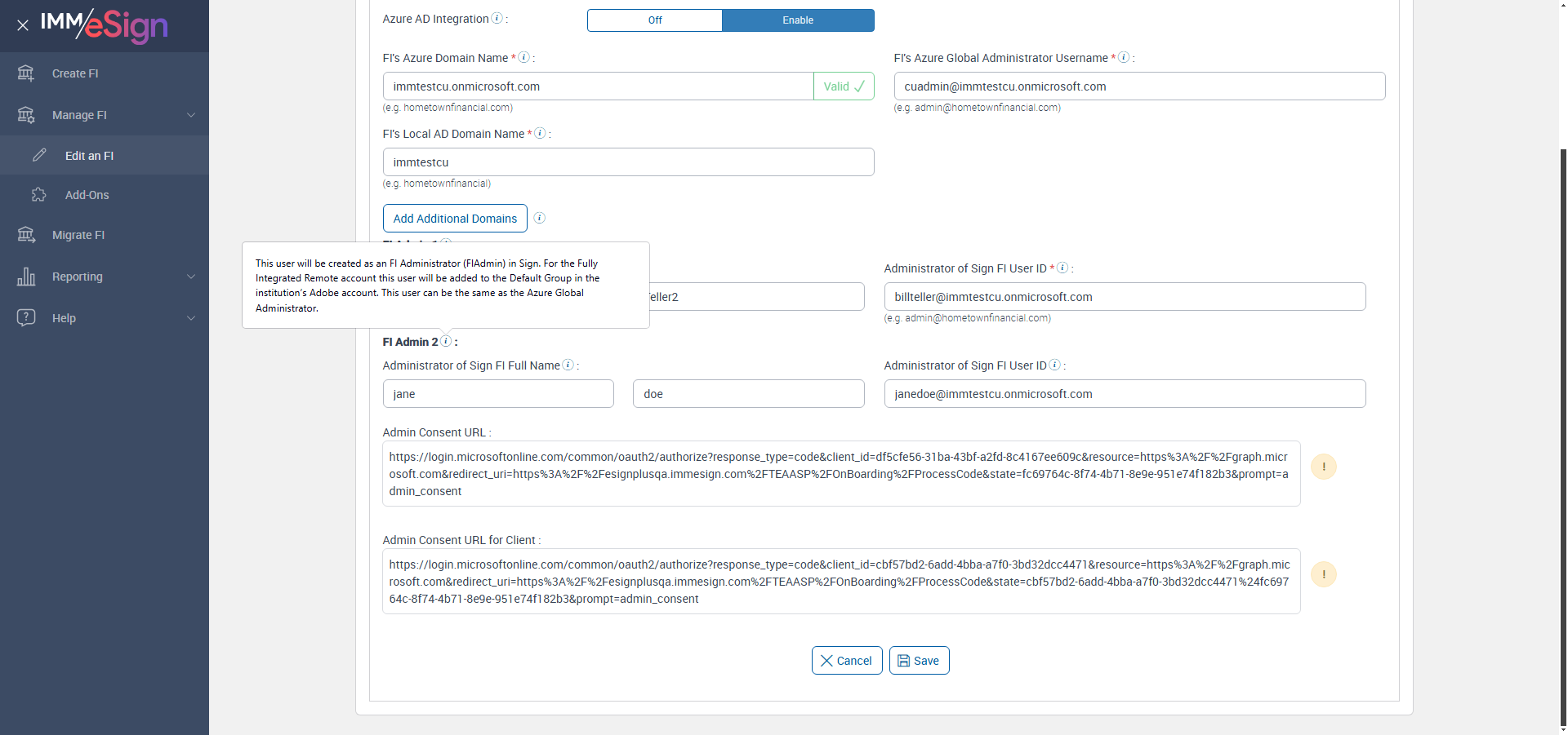 | 05:39:10 PM | Successfully verified Fi Admin 2 tool tip This user will be created as an FI Administrator (FIAdmin) in Sign. For the Fully Integrated Remote account this user will be added to the Default Group in the institution’s Adobe account. This user can be the same as the Azure Global Administrator. equals to This user will be created as an FI Administrator (FIAdmin) in Sign. For the Fully Integrated Remote account this user will be added to the Default Group in the institution’s Adobe account. This user can be the same as the Azure Global Administrator. [ScreenShot] | |