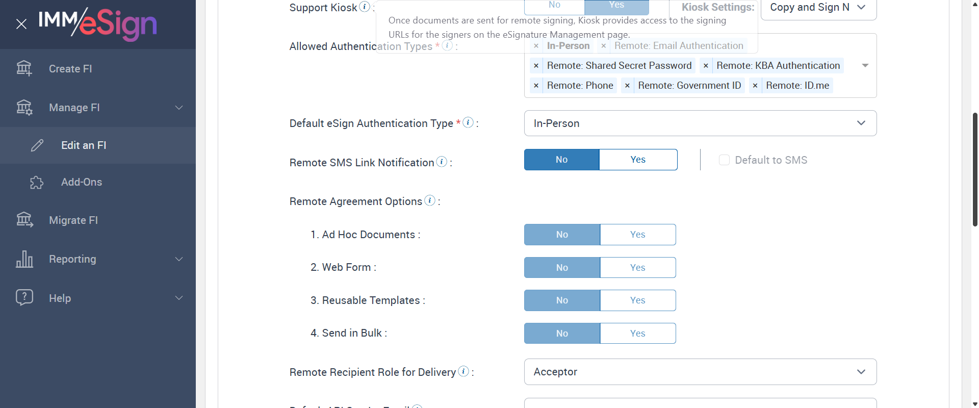 Set Kiosk setting dropdown field in Tenant Manager. Login into eSign Fi with creating RTS and XML session and verify Kiosk functionality.