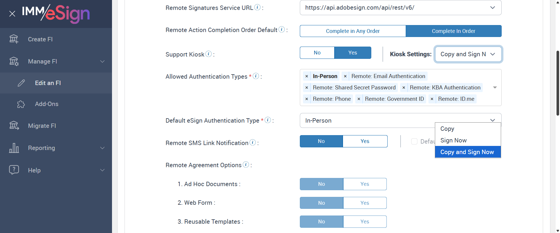 Expected: Verify Kiosk setting dropdown field is showing selected value - Copy and Sign Now