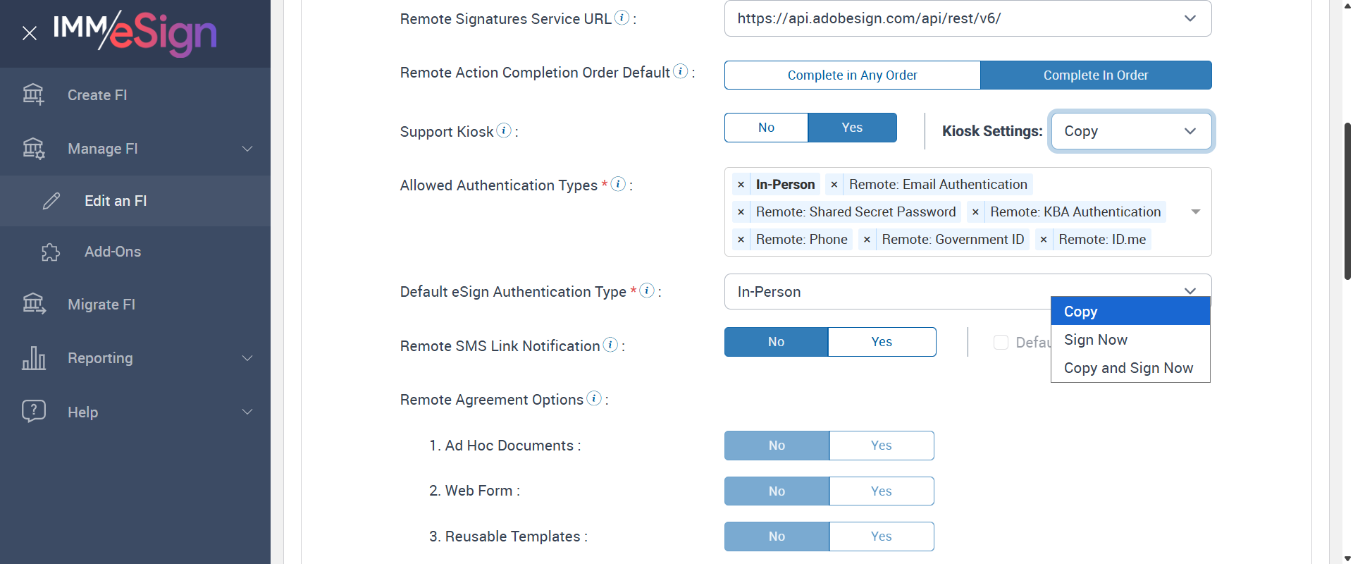 ({Tenant_URL=https://esignnonprod.immesign.com/qa/tenantmanager/, EmailID=test.docadmin@immonline.com;, WorkflowSummary=, Login_User_ID=fiadmin, Address=, FiStatus=, FiAdmin_LastName=, Add_Dictionary=, GRP_PermissionRadio=, Effect_Summary=, Name=, GRP_PermissionChkBox=, NewUser_ID=, LocalDomain=, PartiesToView=, NewName=, User_ID=, Wkf_Permission=, Reset_Password=, NewDescription=, AZDomain=, Workflow=, City=, Delete_Dictionary=, AttachmentTypeOption=, PlusFi=false, NewEmailID=eSignQATest@hotmail.com;, State=, Login_Password=nimdaif, eSignClient=, ClientID=, Domain=, UserType=, NewGroup=, Tenant_User=, FiAdmin_FirstName=, Group=, Dictionary=, FI_Name=, CompletionOder=Complete in order; Complete in any order;, Description=Set Kiosk setting dropdown field in Tenant Manager. Login into eSign Fi with creating RTS and XML session and verify Kiosk functionality., AdditionalDomainName=, SearchUser=, Filepath=src/main/resources/testdata/files/documentRTS/BasicRTSDocs/005BA1.pdf;src/main/resources/testdata/files/documentRTS/BasicRTSDocs/513BA.pdf;src/main/resources/testdata/files/documentRTS/BasicRTSDocs/ZZZZ_SampleDoc.pdf, TestID=VerifyKioskFunctionalityWithRTSAndXMLSessionInEsignFi, KioskDropDownValues=Copy;Sign Now;Copy and Sign Now;, FiAdmin_UserID=, Dictionary_Code=, IndexSource=, Access_Password=, UserURL2=, Inbox_Permission=, Confirm_Reset_Password=, AdditionalLocalDomainName=, Notes=, Inbox=, GlobalAdmin=, Path=src/main/resources/testdata/files/documentRTS/BasicRTSDocs/BasicRTSDocTemplates.zip;, Copy_User_ID=, Tenant_Password=, Enter_eSignClient=, ZipCode=, FI_ID=ekiosk6, Confirm_Password=, CasesUser=, Tab=, UserURL=, Copy_Tab=})
