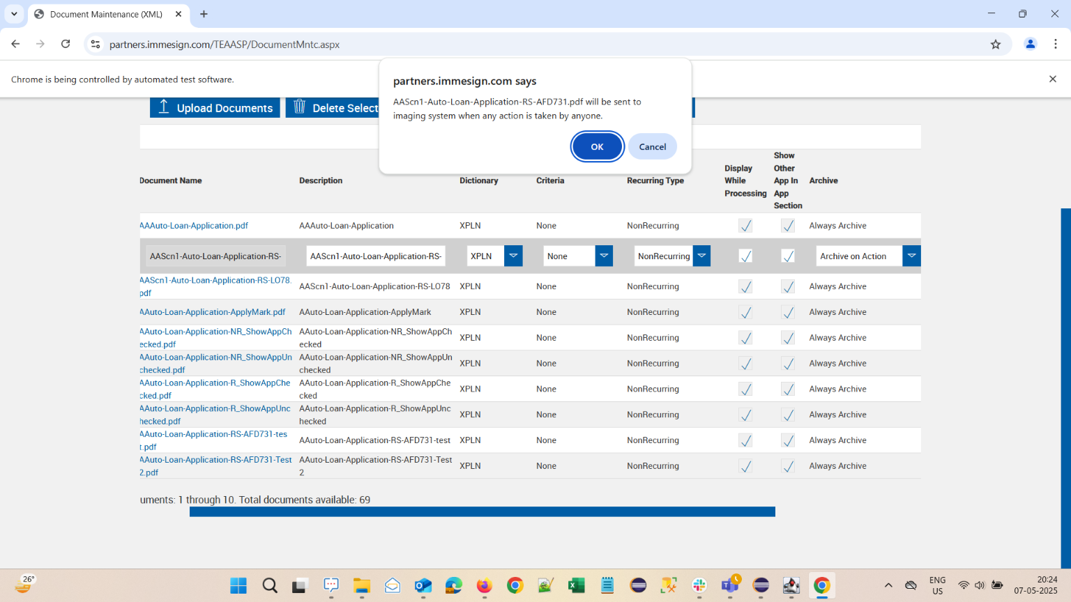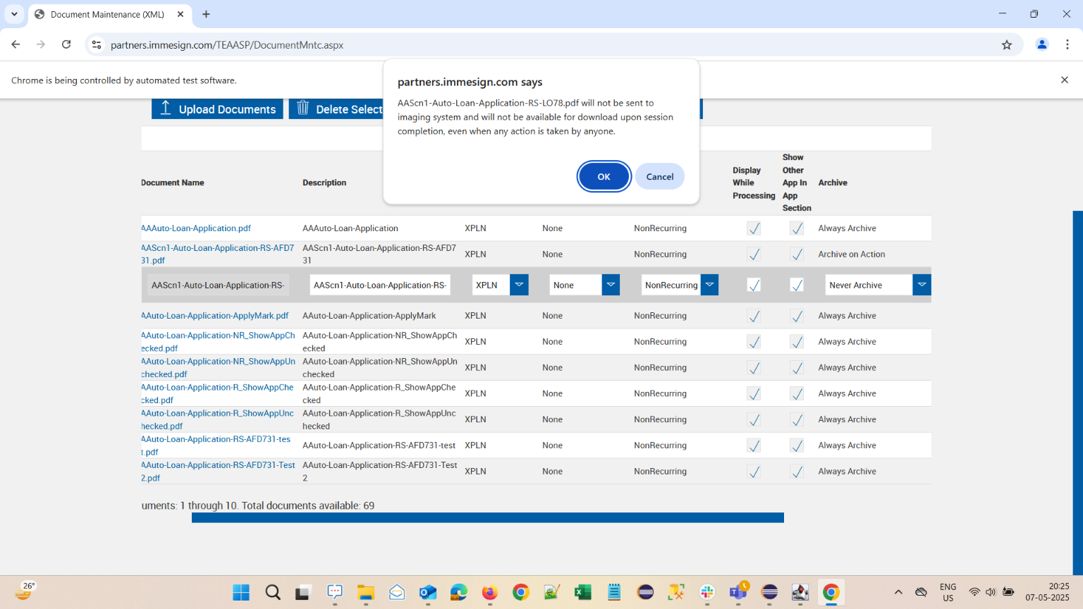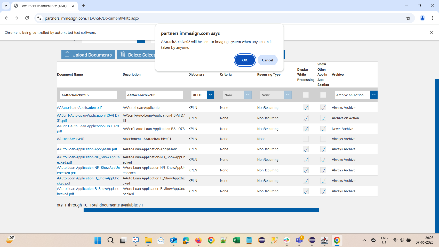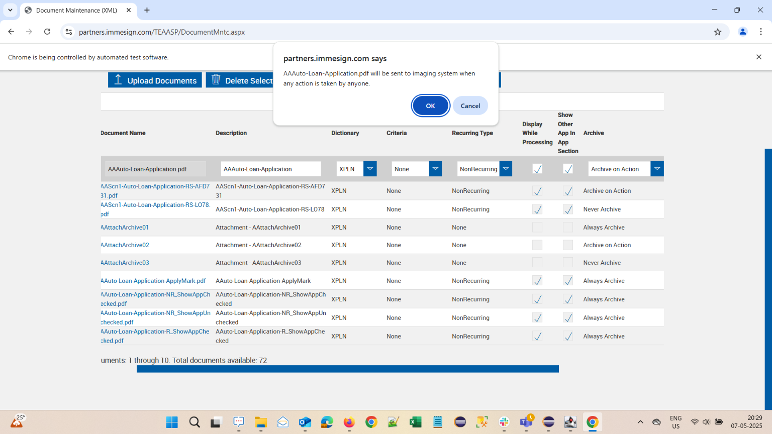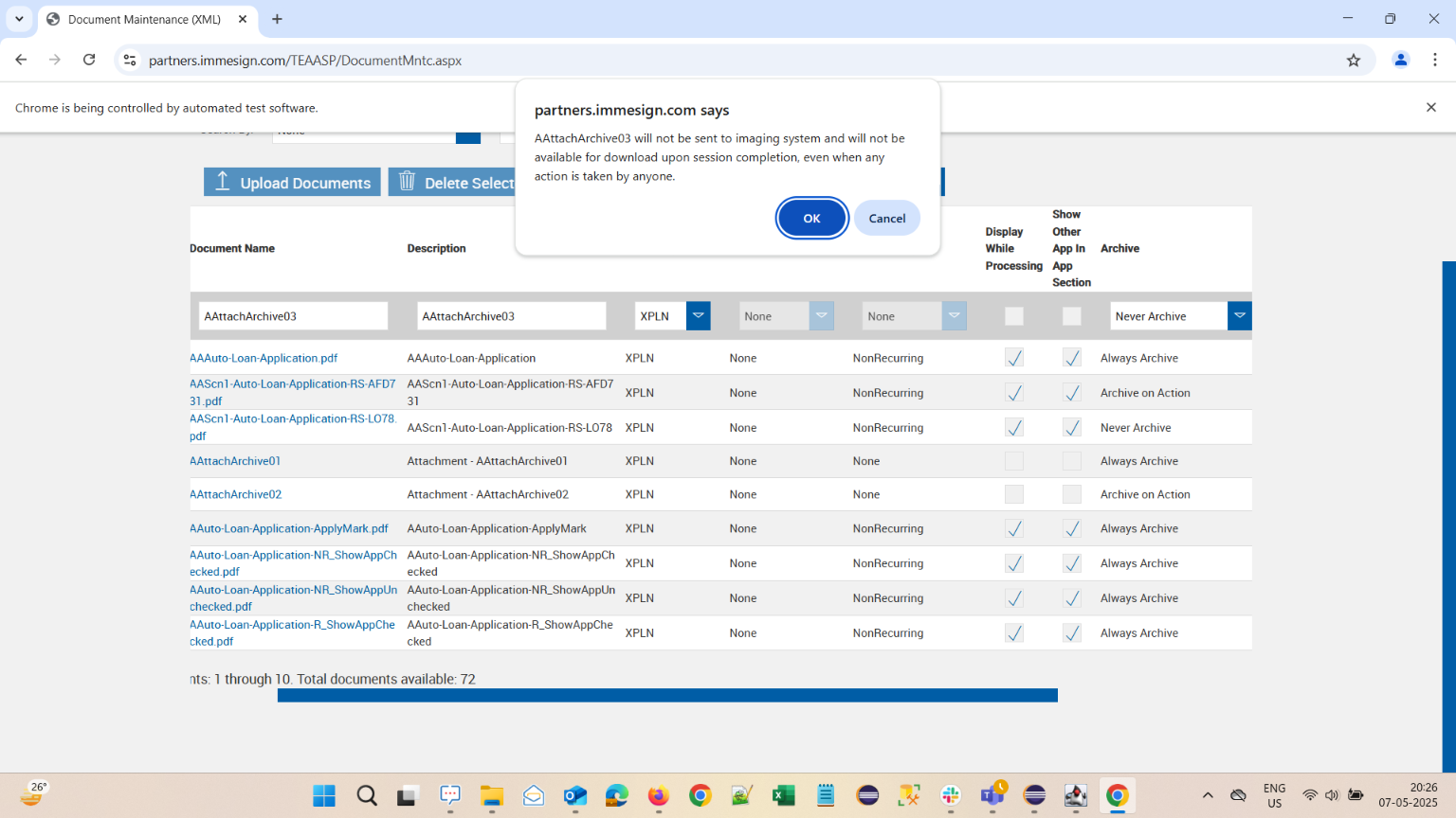 | {Description=verify Archive options are available in Document Maintenance XML Pages, FI=qaplusfi, AttachmentDescription=AAttachArchive01,AAttachArchive02,AAttachArchive03, Condition_Edit=, DocumentName_Edit=AAAuto-Loan-Application.pdf,AAScn1-Auto-Loan-Application-RS-AFD731.pdf,AAScn1-Auto-Loan-Application-RS-LO78.pdf, SearchKeyword=, TestID=VerifyArchiveOptionsforDocumentMaintenanceXML, docset_doc2=, docset_doc1=, filepath=src/main/resources/testdata/files/configuringfi/AAAuto-Loan-Application.pdf,src/main/resources/testdata/files/configuringfi/AAScn1-Auto-Loan-Application-RS-AFD731.pdf,src/main/resources/testdata/files/configuringfi/AAScn1-Auto-Loan-Application-RS-LO78.pdf, DocumentDescription_Edit=, PartiesToView=, AttachmentName=AAttachArchive01,AAttachArchive02,AAttachArchive03, FieldNametoSearch=, CriteriaName=, Template_Description=, DocSetName=A_DocSet05, DocumentName=AAuto-Loan-Application-ApplyMark.pdf, Password=iMM@2022, DictionaryOption=XPLN, Condition=, CriteriaName_Edit=, Criteria_Description_Edit=, Template_Name=, KeepUnlock=, SearchDictionary=, Criteria_Description=, Template_Platform=, DocumentDescription=, Username=cuadmin@immtestcu.onmicrosoft.com} |