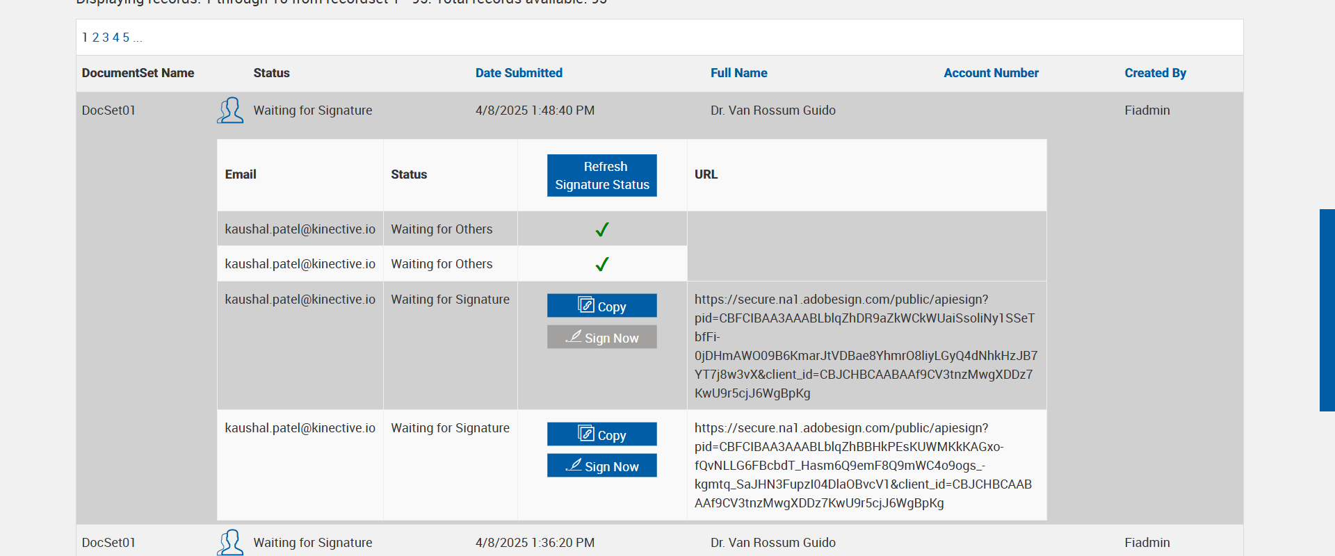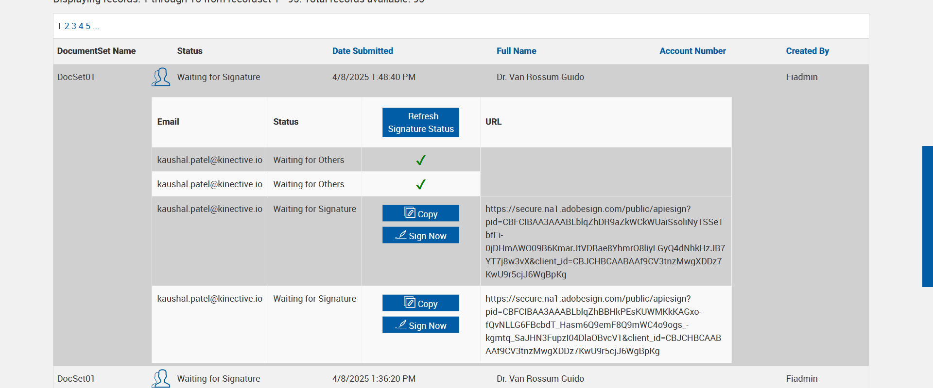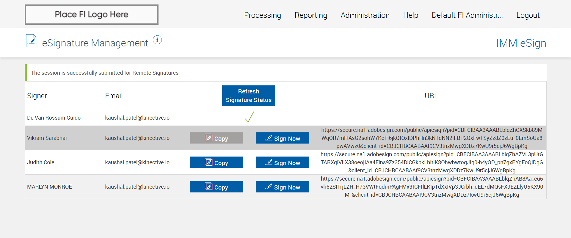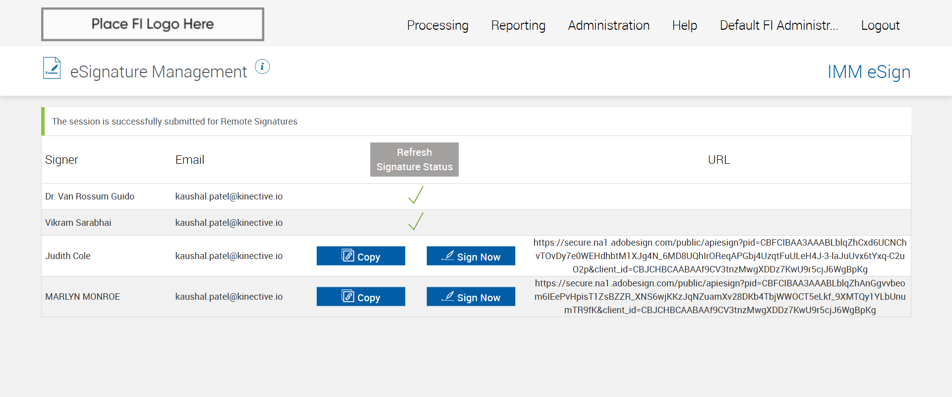 Expected: Verify green tick-mark displayed for first two parties in 'Remote Signautre Status Report' page