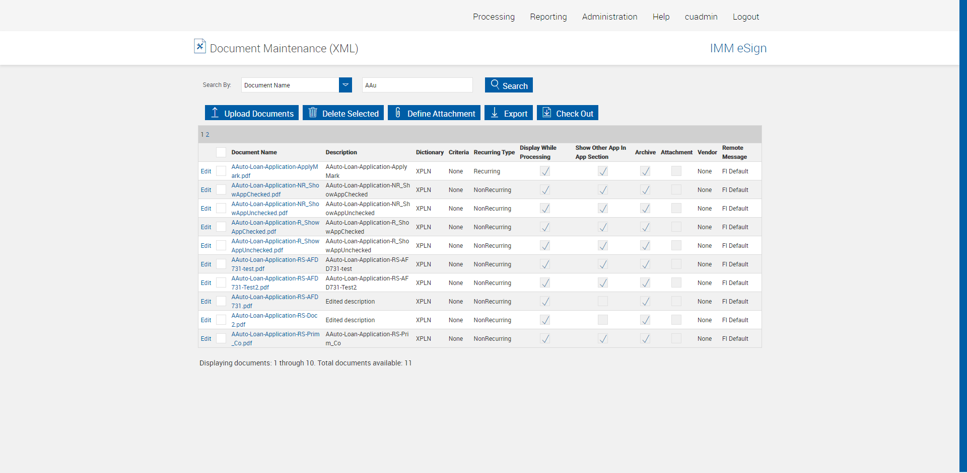 Actual(Passed): It display the 'Document Name which contains the letter sequence : AAu[ScreenShot] --- 08 Oct 20:37:51 469 - Page URL:: https://esignplusqa.immesign.com/teaasp/documentmntc.aspx
