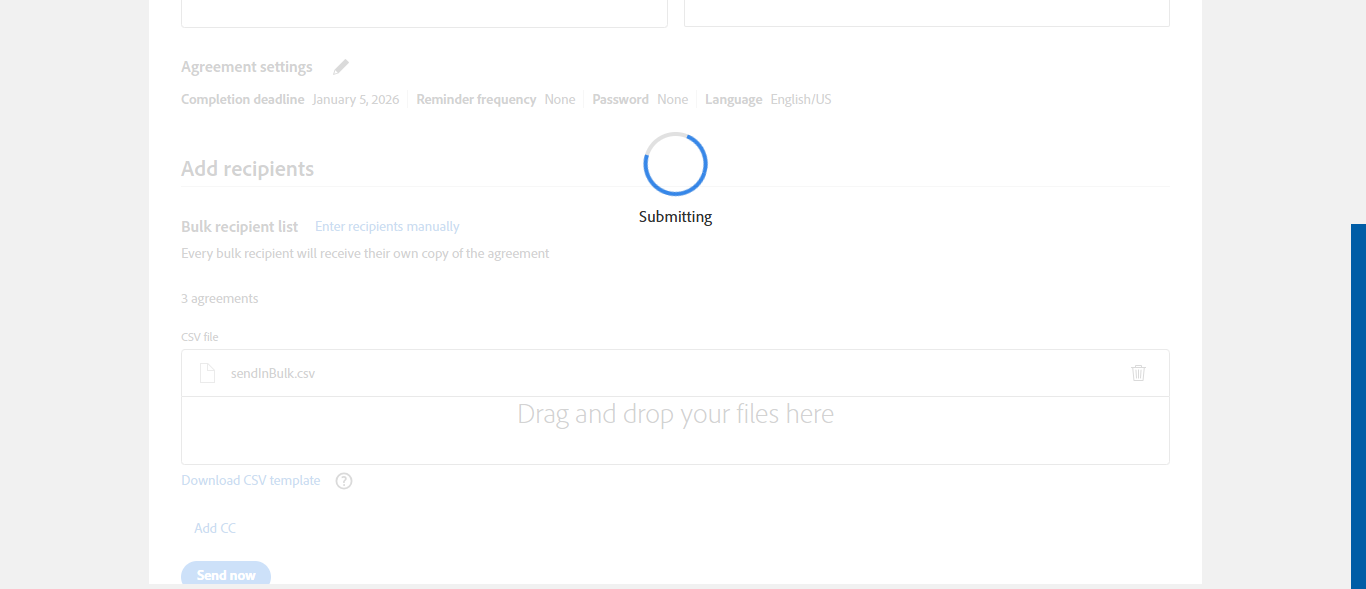 Success message The Bulk send Remote Sign Document, containing 3 agreements, has been queued for sending to recipients.