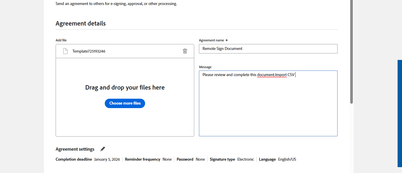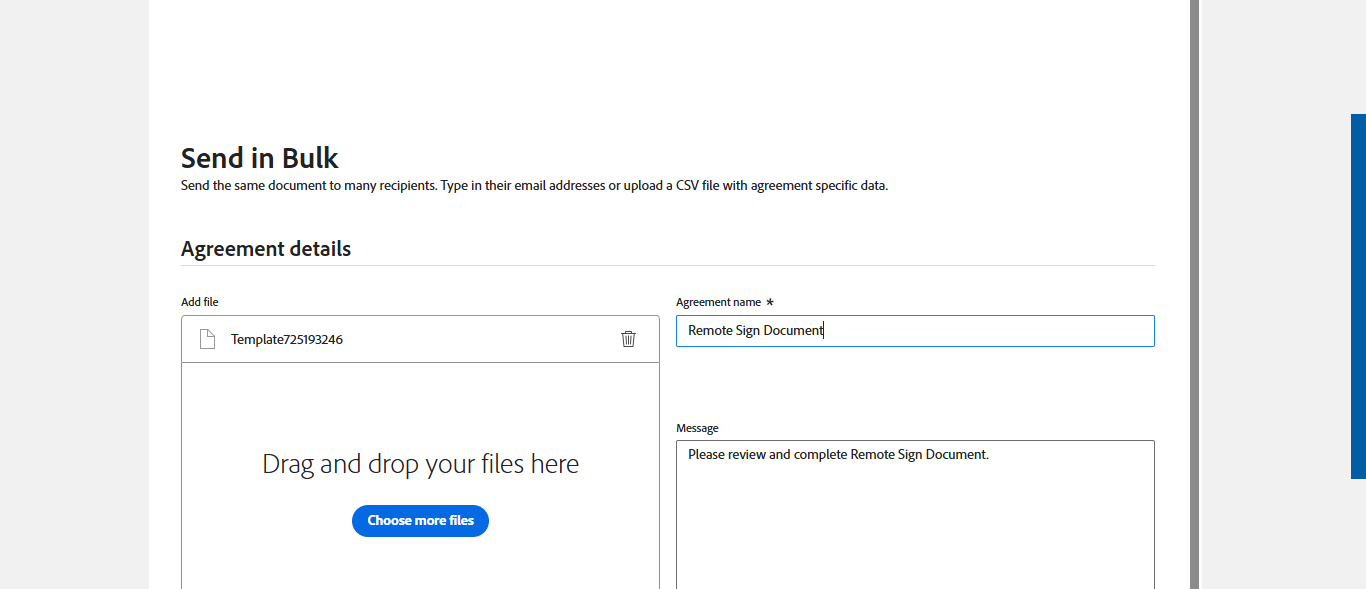 Success message The Bulk send "Remote Sign Document", containing 3 agreements, has been queued for sending to recipients. |