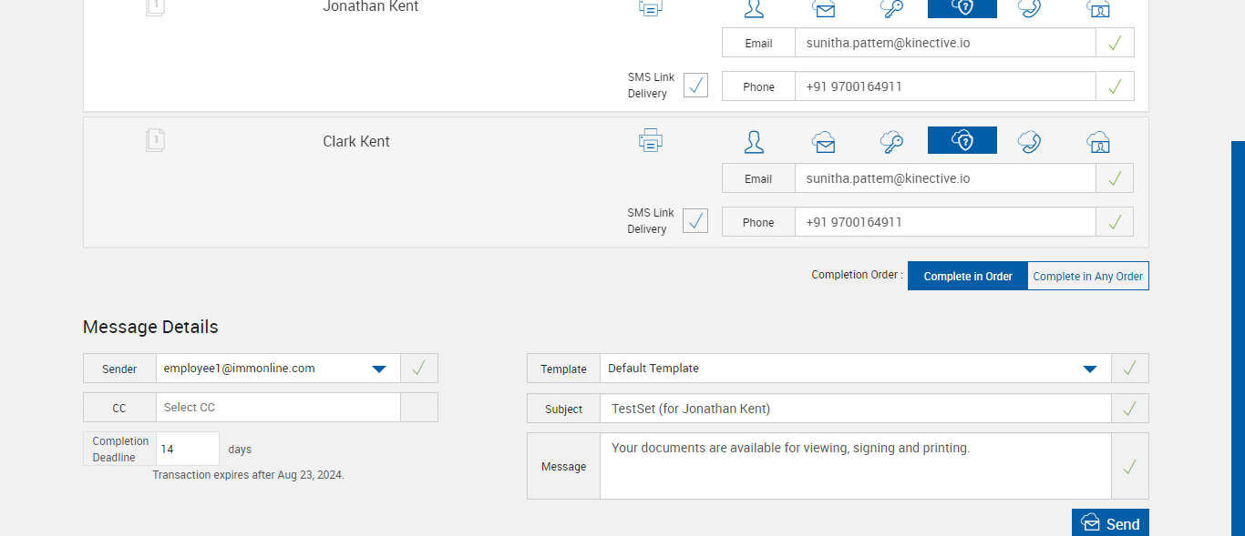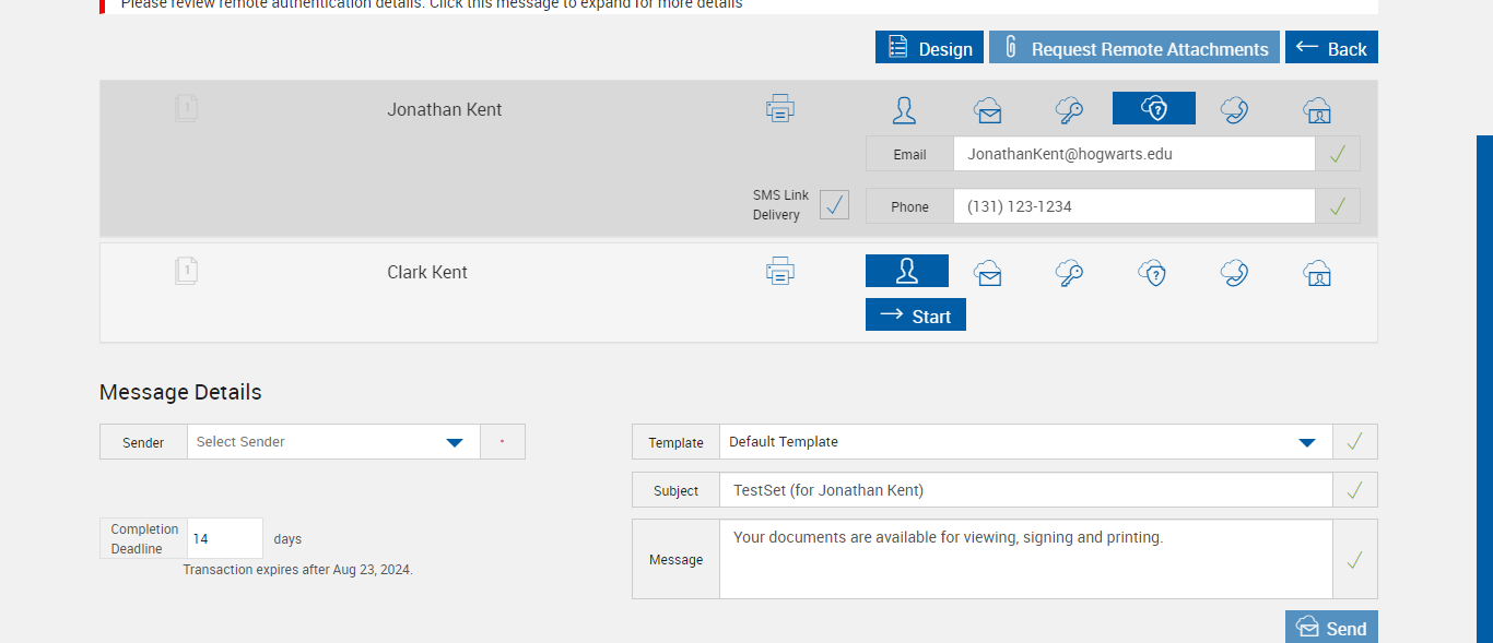 | 06:17:59 pm | Entered 'Message' : Your documents are available for viewing, signing and printing. | |