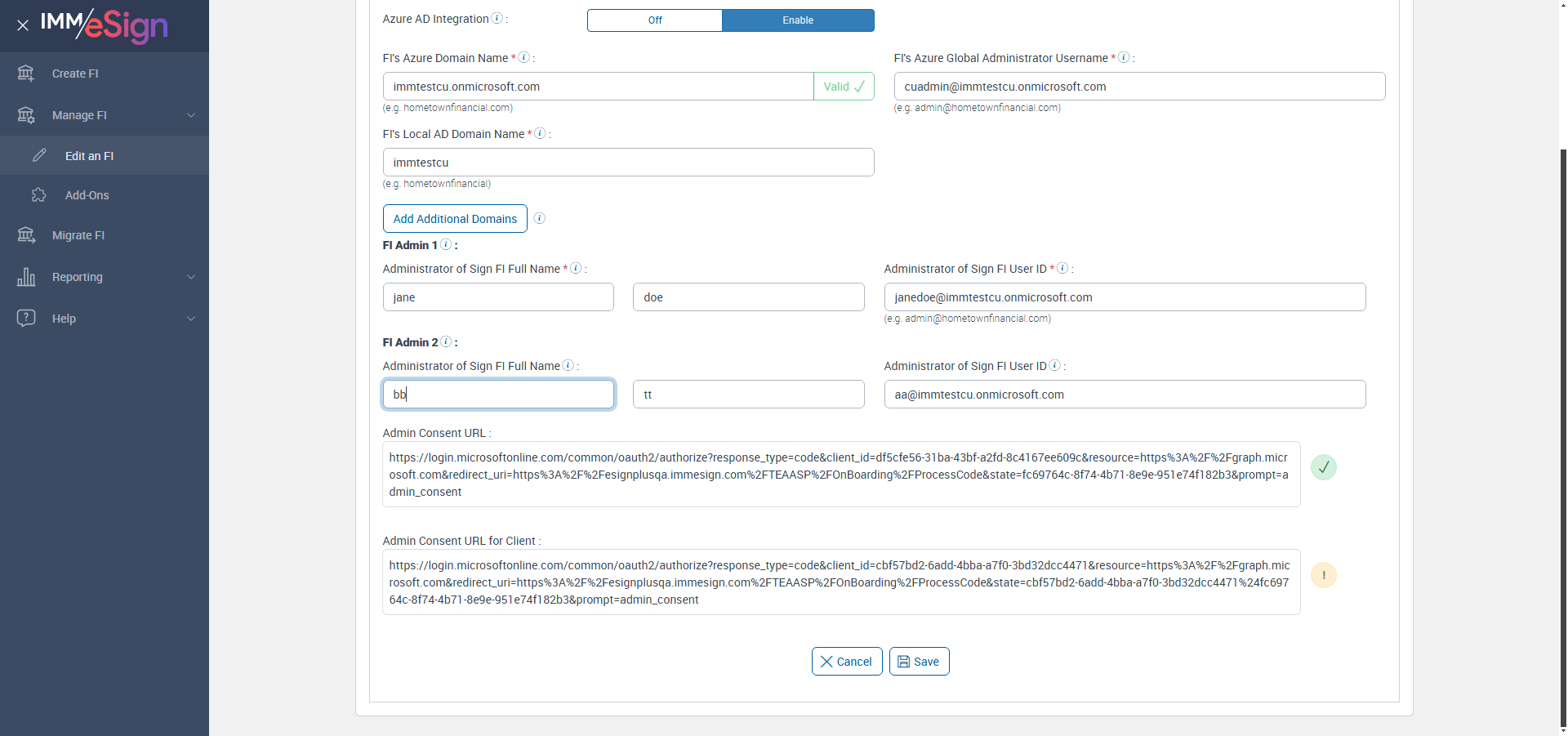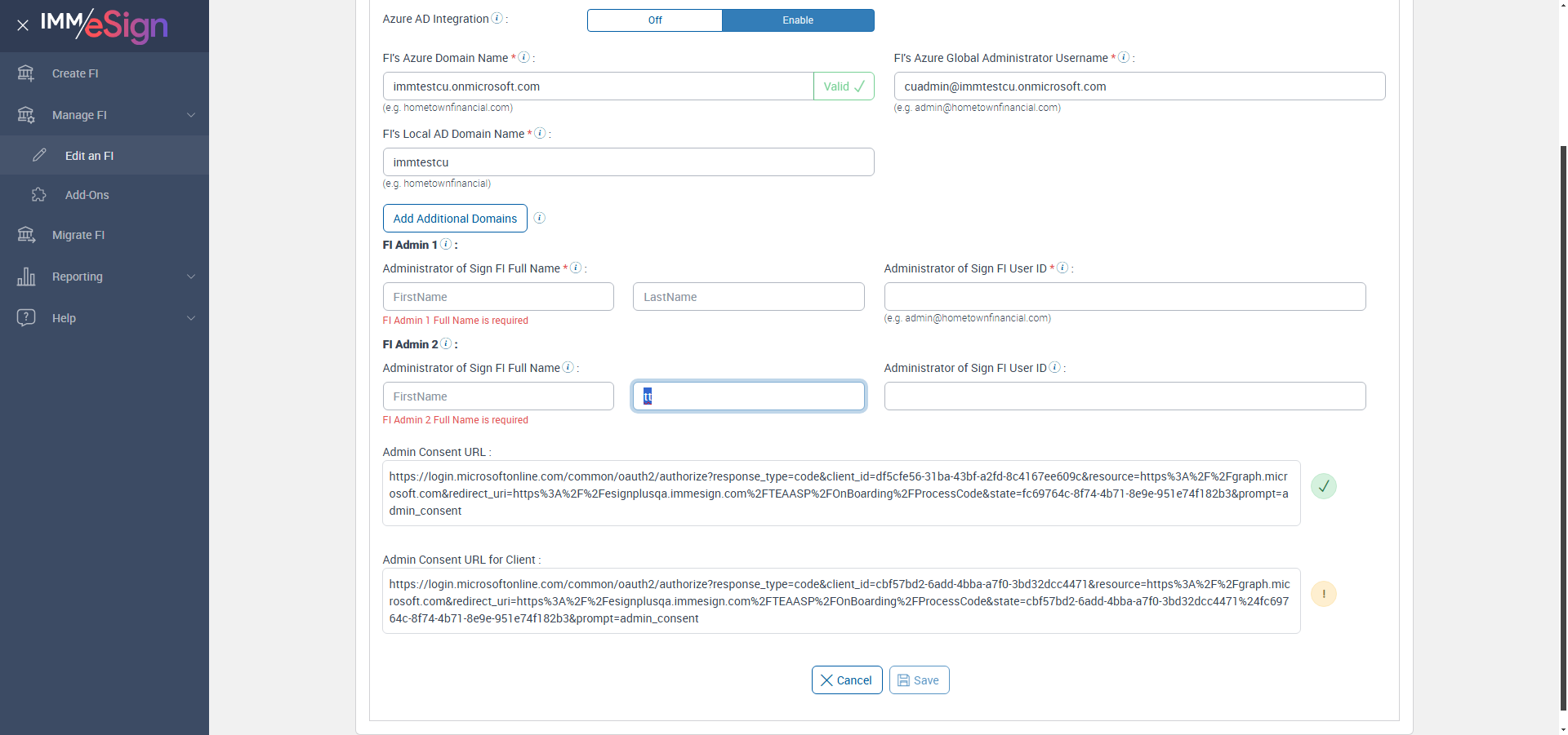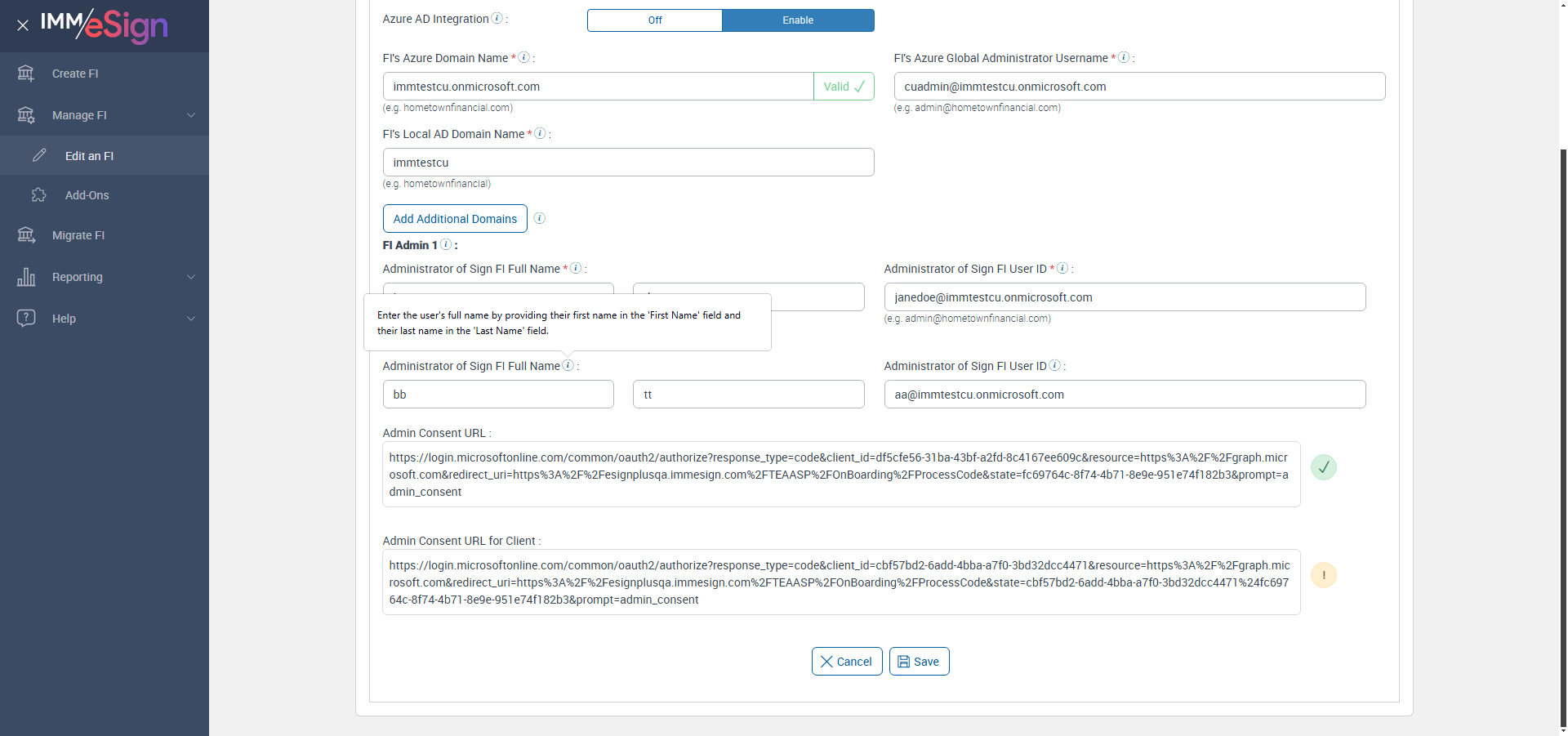 | 04:26:54 PM | Successfully verified Fi Admin 1 tool tip This user will be created as an FI Administrator (FIAdmin) in Sign. For the Fully Integrated Remote account this user will be added to the Default Group in the institution’s Adobe account. This user can be the same as the Azure Global Administrator. equals to This user will be created as an FI Administrator (FIAdmin) in Sign. For the Fully Integrated Remote account this user will be added to the Default Group in the institution’s Adobe account. This user can be the same as the Azure Global Administrator. [ScreenShot] | |