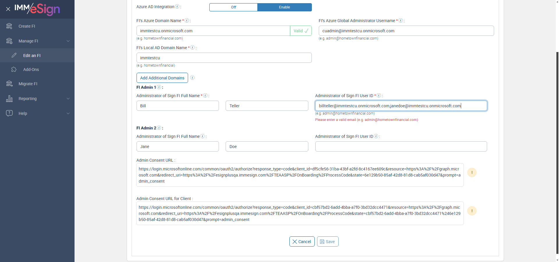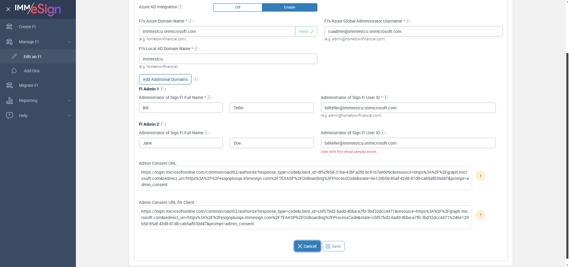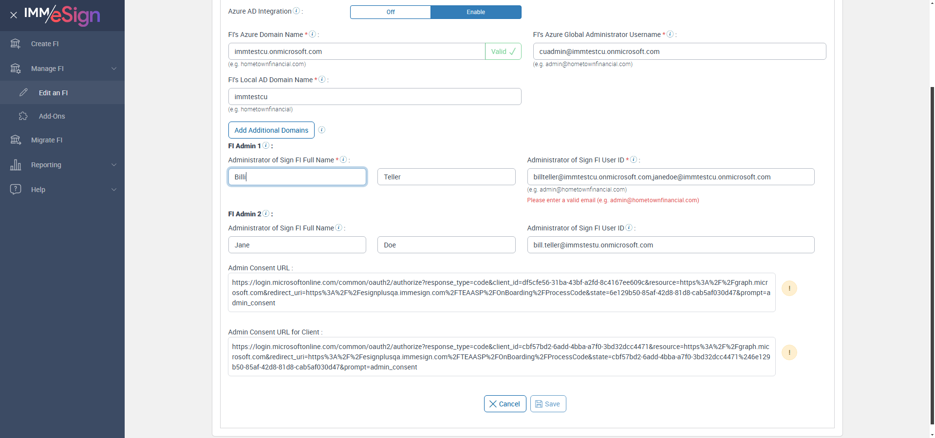 | 06:13:16 PM | Successfully verified Fi Admin 2 tool tip This user will be created as an FI Administrator (FIAdmin) in Sign. For the Fully Integrated Remote account this user will be added to the Default Group in the institution’s Adobe account. This user can be the same as the Azure Global Administrator. equals to This user will be created as an FI Administrator (FIAdmin) in Sign. For the Fully Integrated Remote account this user will be added to the Default Group in the institution’s Adobe account. This user can be the same as the Azure Global Administrator. [ScreenShot] | |