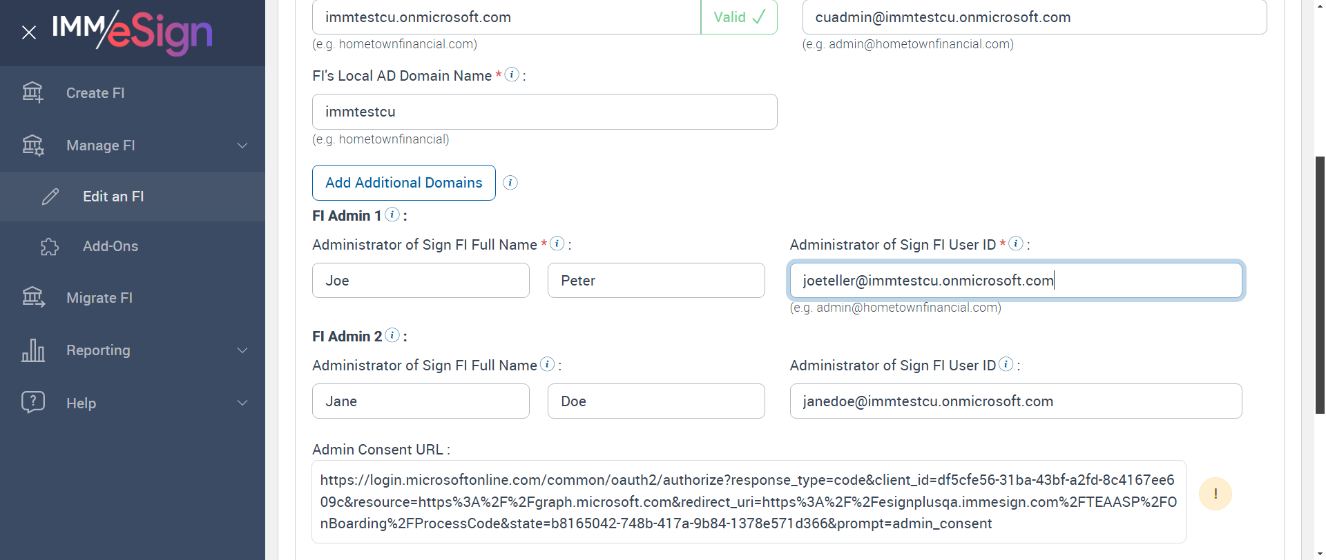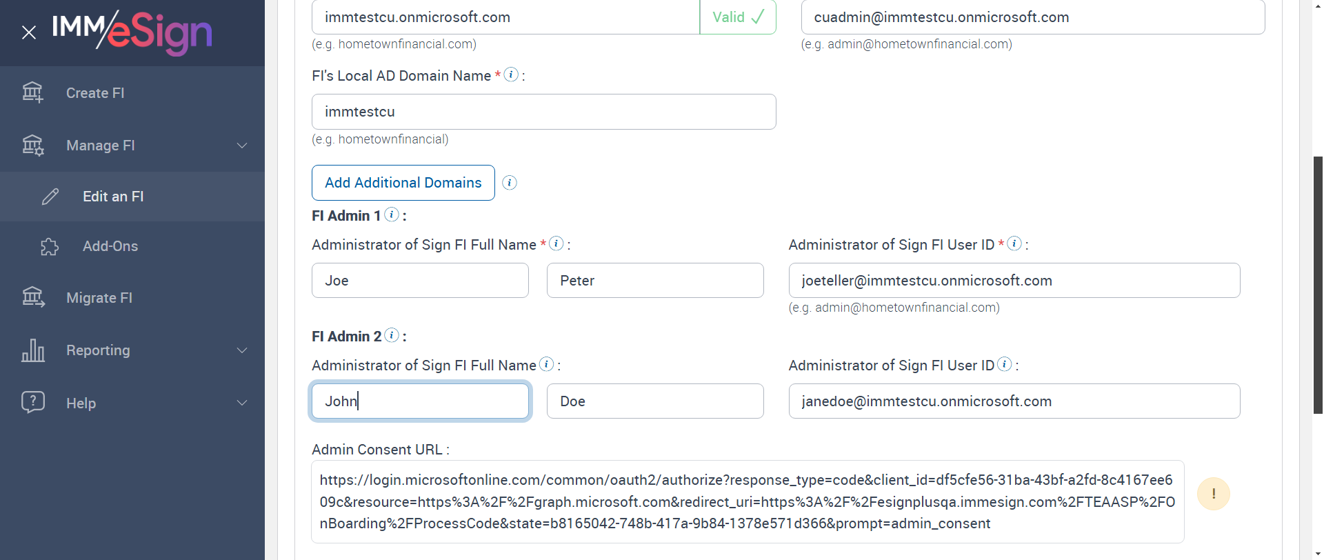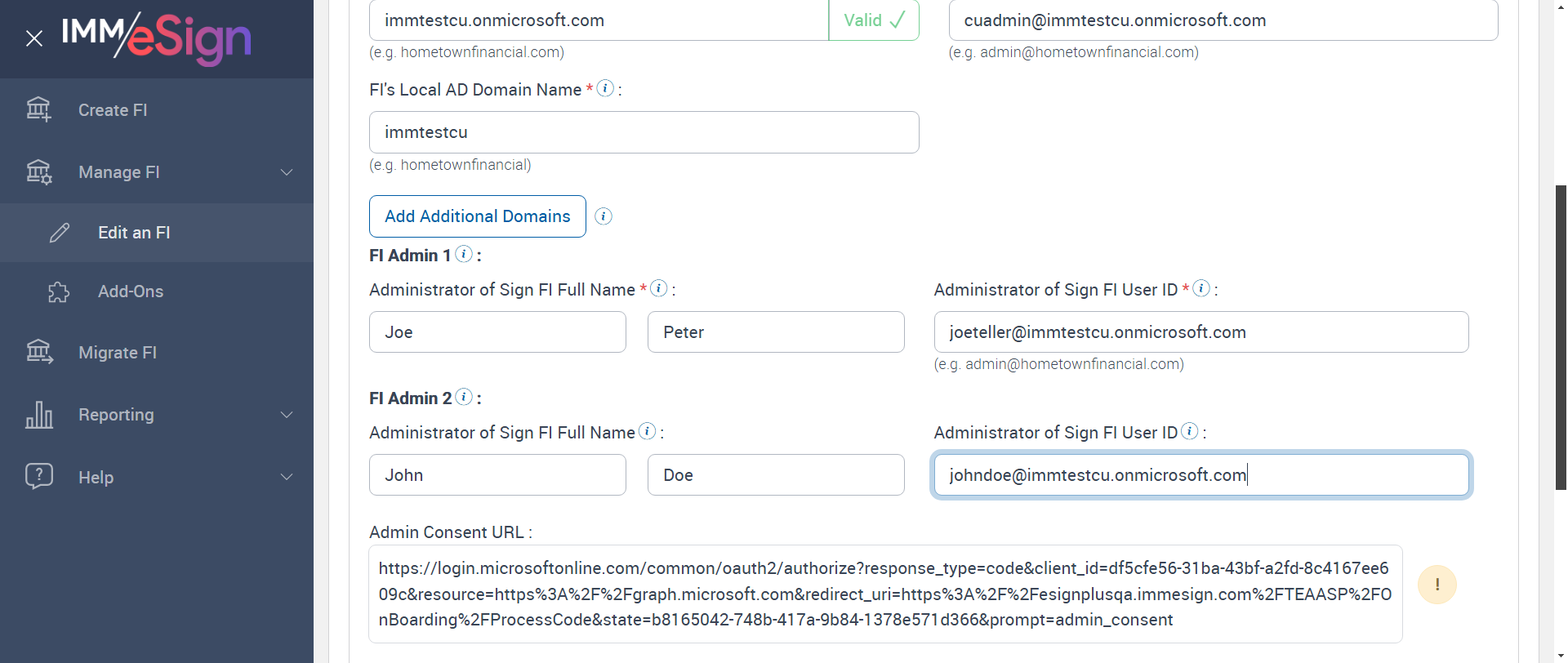 | {ZIP=, Login_User_ID=immadmin1@immesignqa.onmicrosoft.com, RemoteSettings=Ad Hoc Document,Web Form,Reusable Templates, FiStatus=, AdobeKey=, FiAdmin_LastName=Teller,Doe, Name=, LocalDomain=immtestcu, Edit_UserID=joeteller@immtestcu.onmicrosoft.com,johndoe@immtestcu.onmicrosoft.com, eSignPlus=, RtmAuthTypes=, IntegrationType=Fully Integrated, RemoteSign=Enable, DrpSpot=, AZDomain=immtestcu.onmicrosoft.com, VerifastEDays=, City=, WrongAZDomain=, LCEvalDays=, State=, LoanCoupon=, Login_Password=iMM@2024, Country=, ClientID=, FIID=, Key=, FiAdmin_FirstName=Bill,Jane, Dictionary=TeSign;XPLN, Sign_RmtAgree_NotChecked=Send In Bulk, StarterEvalDays=, Description=VerifyUIelemntsinAzureDetailspage, StarterChecks=, eSignURL=https://esignplusqa.immesign.com/TEAASP/Login.aspx, E-Vault=, Filepath=, TestID=ManageFIAddNewFiAdmin1FiAdmin2, FiAdmin_UserID=billteller@immtestcu.onmicrosoft.com,janedoe@immtestcu.onmicrosoft.com, EditFIAdmin_FName=Joe,John, Verifast=, LacerPro=, Notes=, Session URL=https://esignnonprod.immesign.com/qa/tenantmanager/, GlobalAdmin=cuadmin@immtestcu.onmicrosoft.com, TypeOfUser=, eValultDays=, ErrorMsg=, Address2=, Address3=, Address1=, Sign_Password=iMM@2022, WrongFIID=, DrpEvalDays=, EditFiadmin_LName=Peter,Doe, Sign_RmtAgree_checked=Ad Hoc Document,Web Form,Reusable Templates,Manage Remote Agreements} |