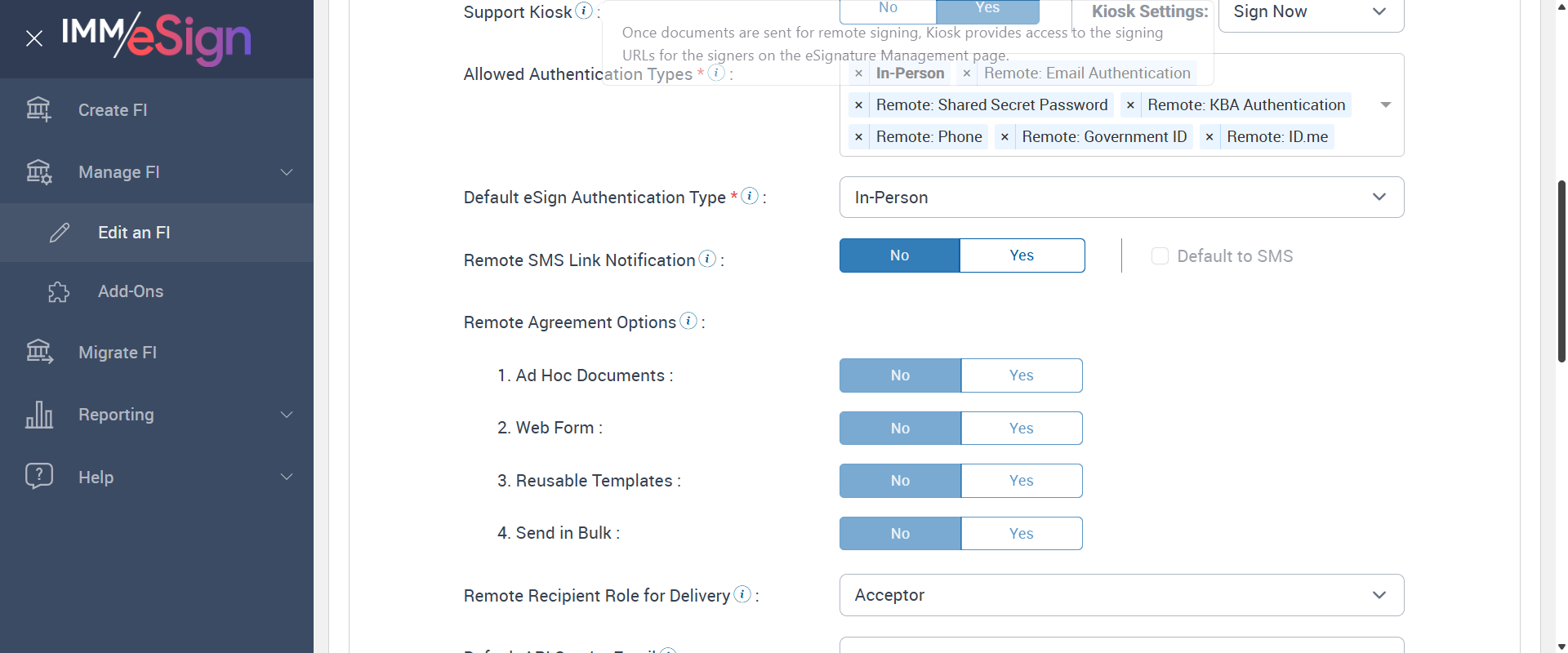 | 10:43:12 am | Set Kiosk setting dropdown field in Tenant Manager. Login into eSign Fi with creating RTS and XML session and verify Kiosk functionality. | |