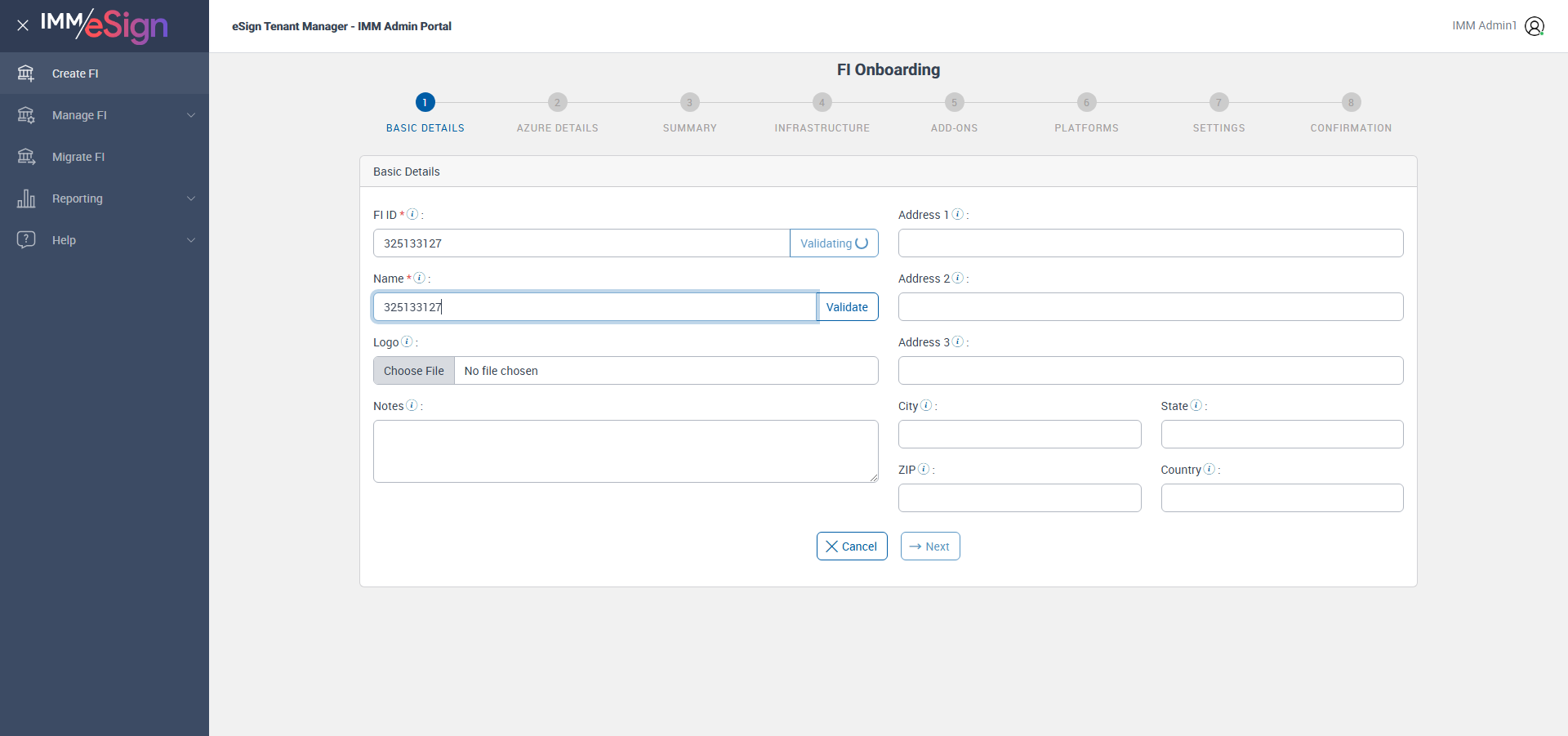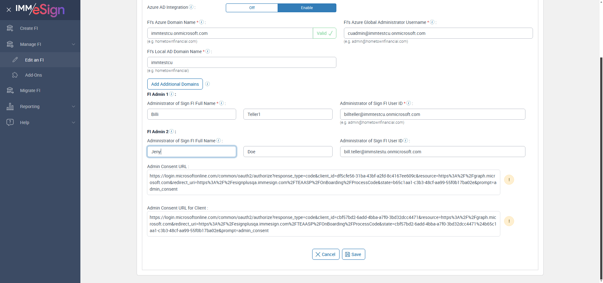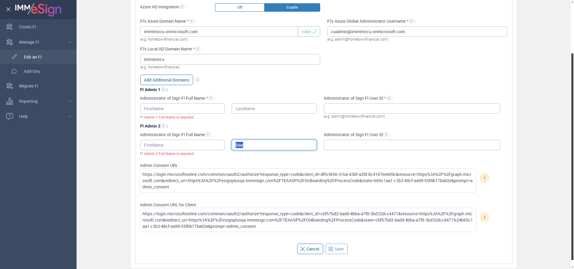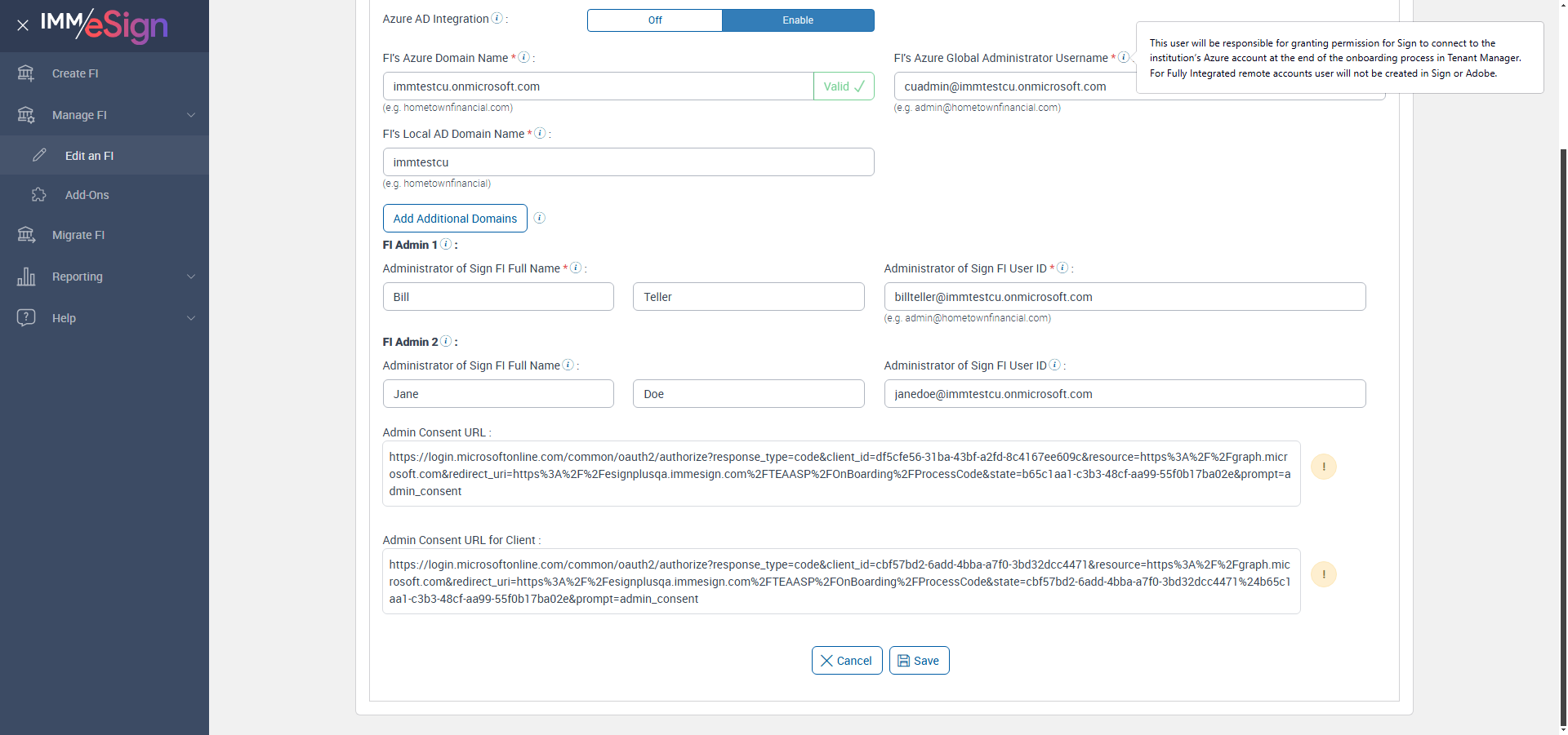 | 01:42:48 PM | Successfully verified Fi Admin 2 tool tip This user will be created as an FI Administrator (FIAdmin) in Sign. For the Fully Integrated Remote account this user will be added to the Default Group in the institution’s Adobe account. This user can be the same as the Azure Global Administrator. equals to This user will be created as an FI Administrator (FIAdmin) in Sign. For the Fully Integrated Remote account this user will be added to the Default Group in the institution’s Adobe account. This user can be the same as the Azure Global Administrator. [ScreenShot] | |