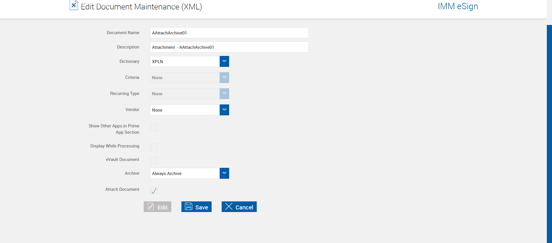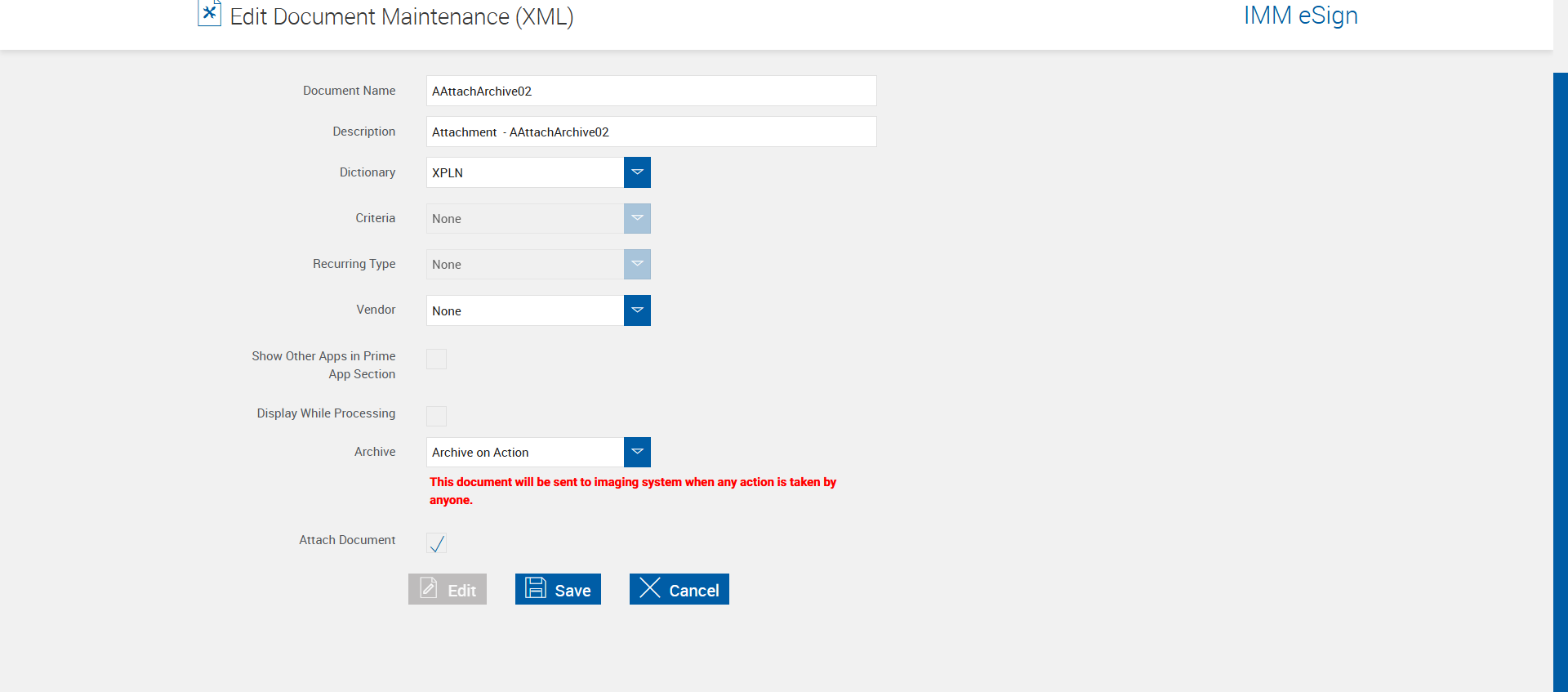 | 04:29:54 pm | Default Archive value is set to Archive on Action on Edit Document Maintenance XML page [ScreenShot] | |