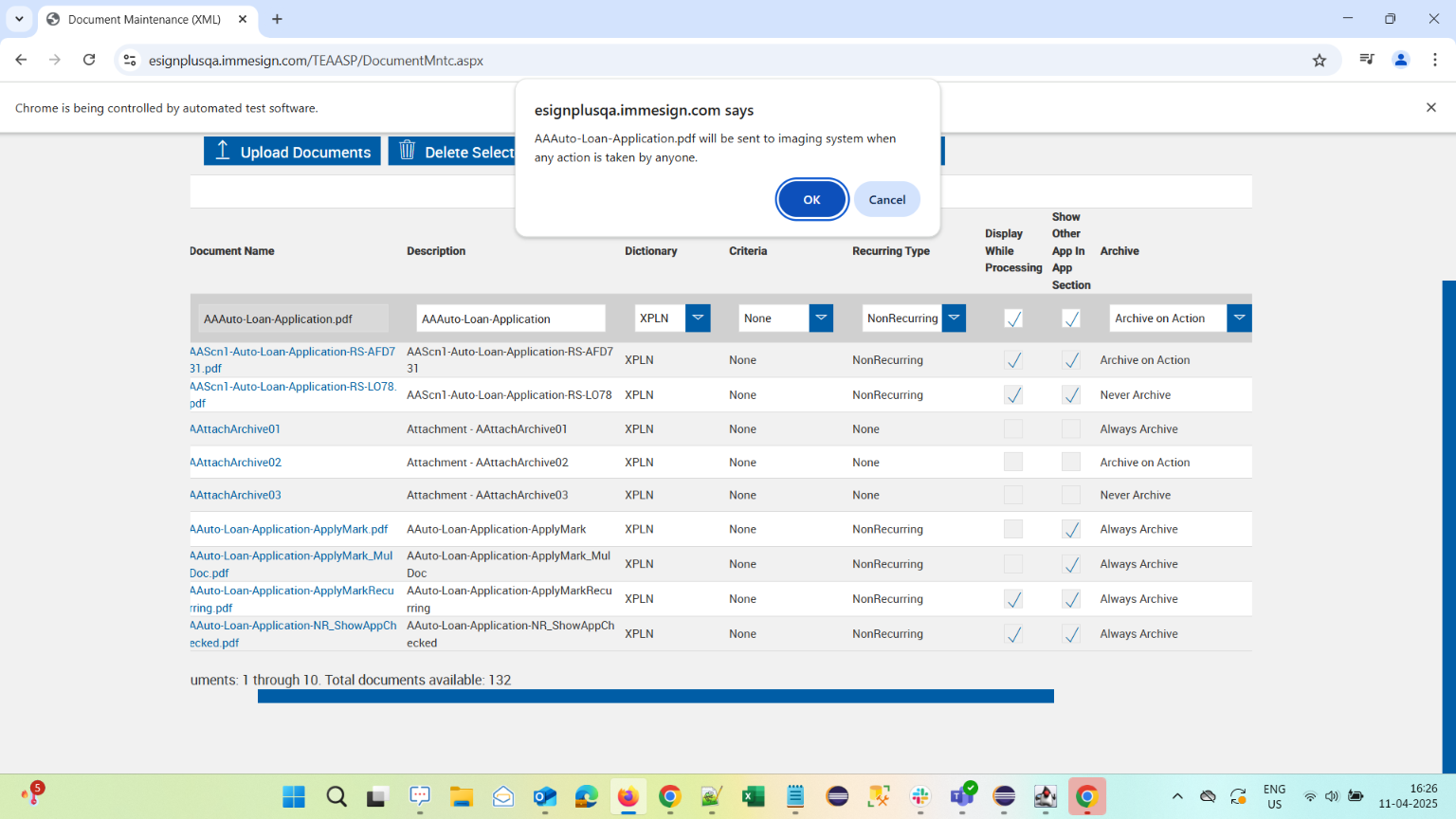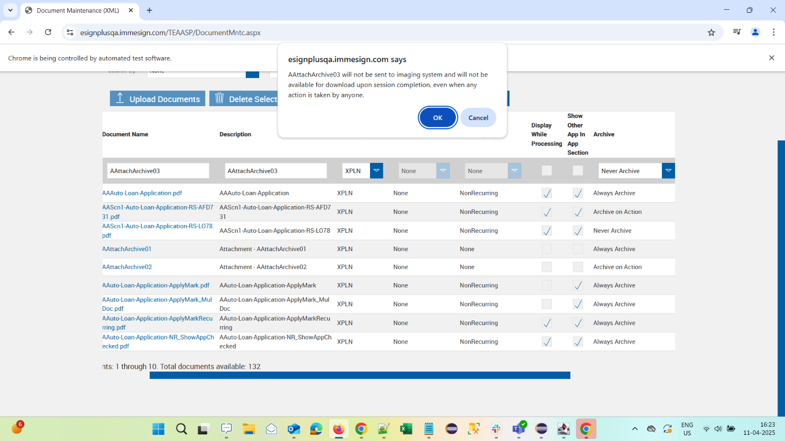 | 04:26:16 pm | Warning Message for Archive on Action is verified on Document Maintenance XML page | |