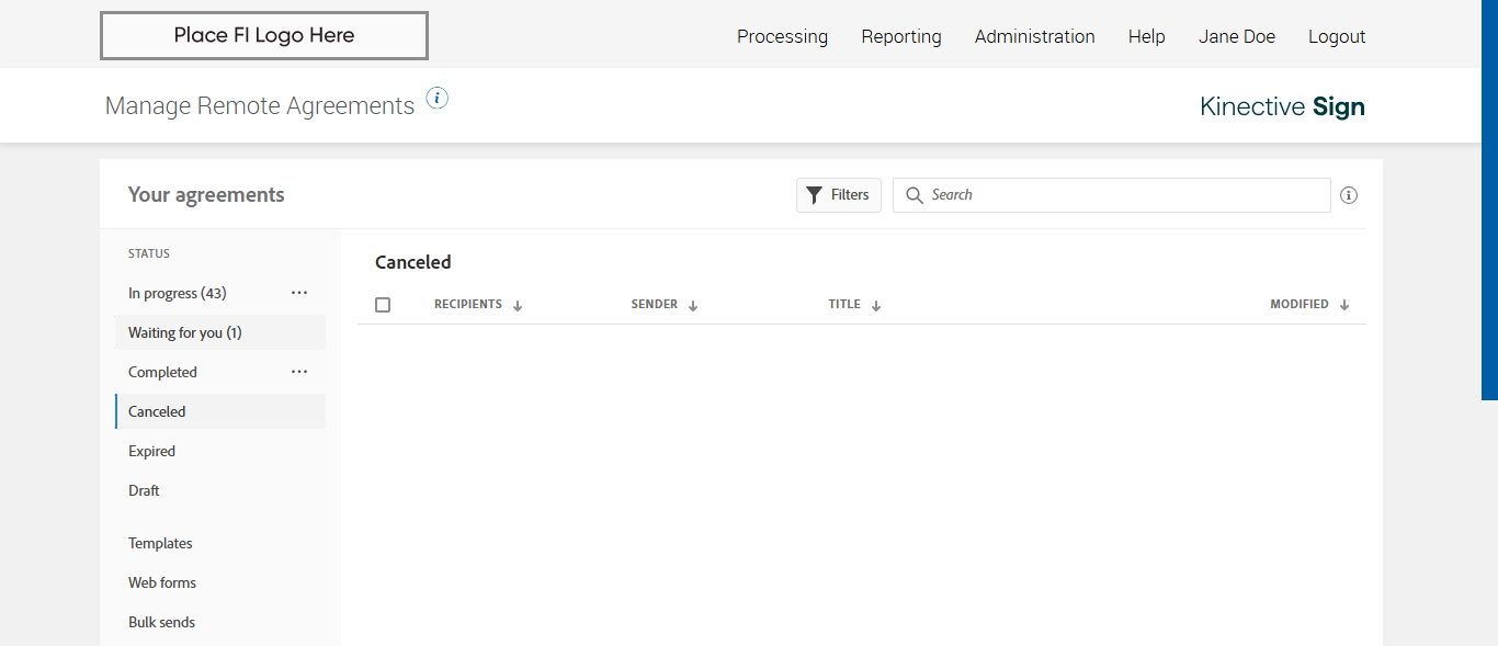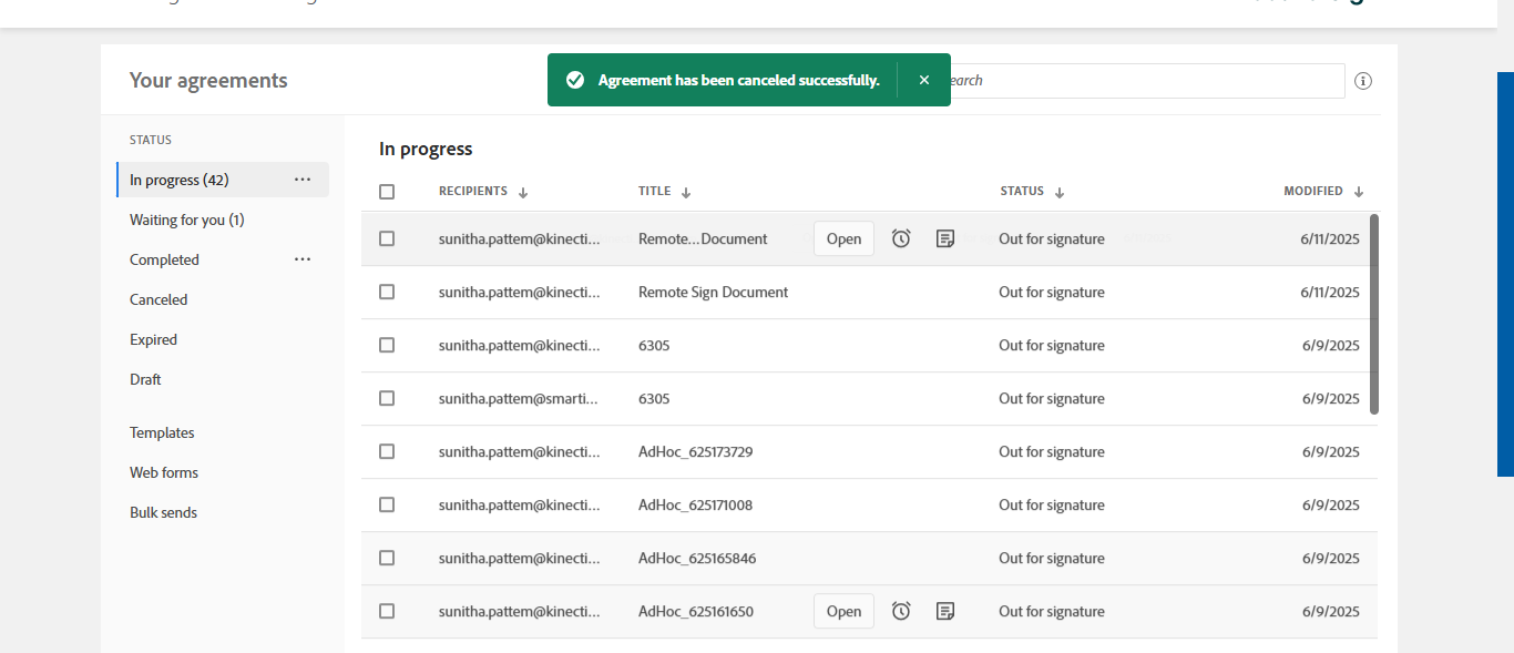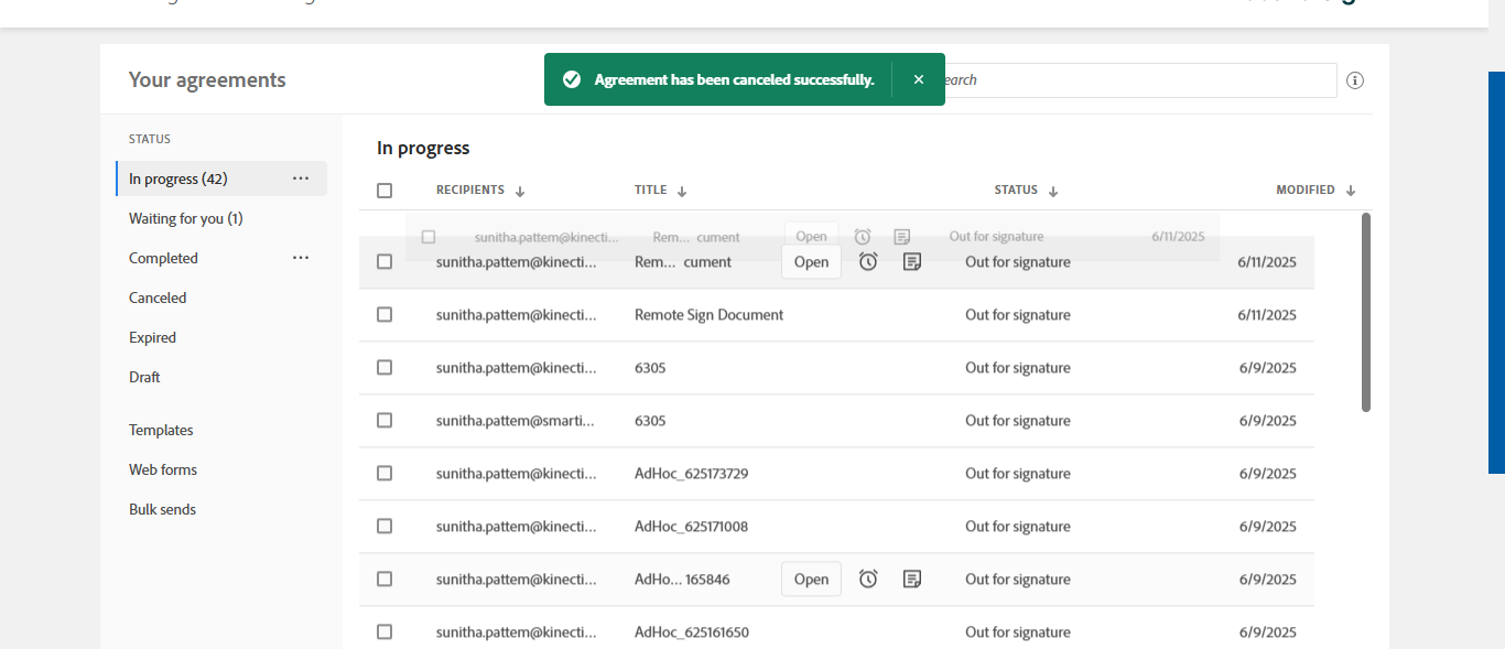 Manage Remote Agreement page displayed successfully and Canceled status is displayed