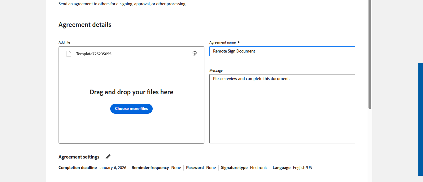 Manage Remote Agreement page displayed and 'Bulk sends' status displayed successfully