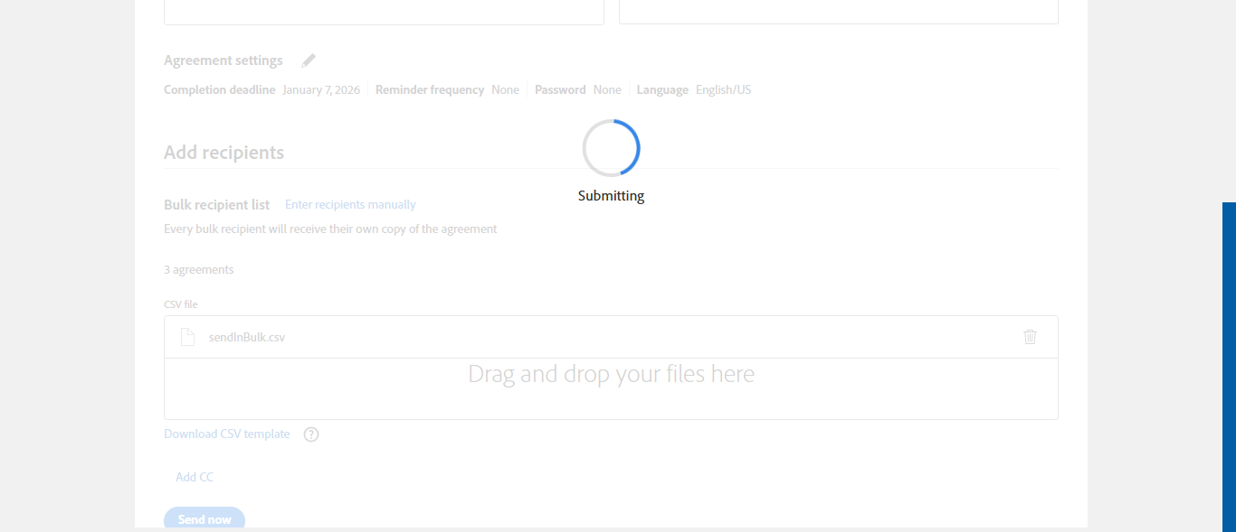 | 03:35:21 pm | Success message The Bulk send "Remote Sign Document", containing 3 agreements, has been queued for sending to recipients. | |