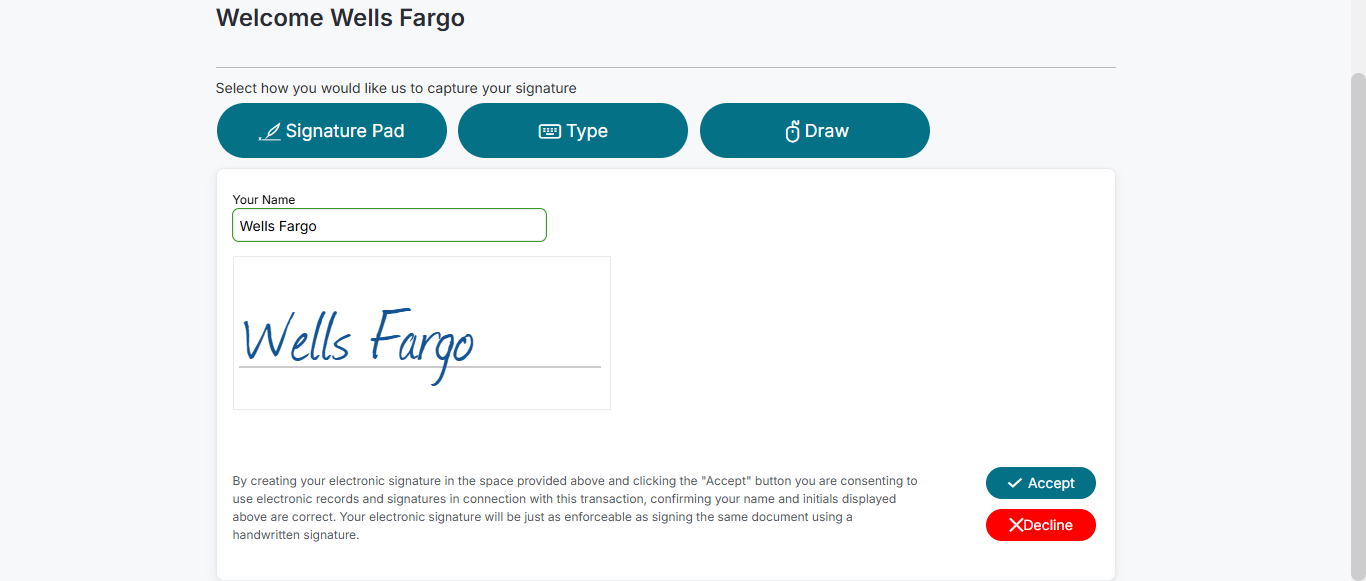 | 09:33:50 am | Expected: By creating your electronic signature in the space provided above and clicking the "Accept" button you are consenting to use electronic records and signatures in connection with this transaction, confirming your name and initials displayed above are correct. Your electronic signature will be just as enforceable as signing the same document using a handwritten signature. Actual(Passed): Successfully verified consent message when 'Electronic Signature Consent' - disabled By creating your electronic signature in the space provided above and clicking the "Accept" button you are consenting to use electronic records and signatures in connection with this transaction, confirming your name and initials displayed above are correct. Your electronic signature will be just as enforceable as signing the same document using a handwritten signature. [ScreenShot] |