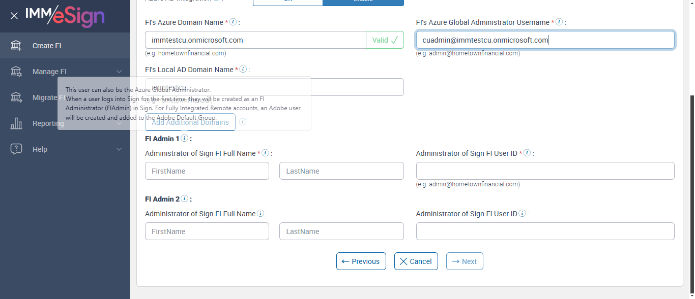 | 06:44:12 pm | Failed to verify Fi Admin1 tool tip This user can also be the Azure Global Administrator. When a user logs into Sign for the first time, they will be created as an FI Administrator (FIAdmin) in Sign. For Fully Integrated Remote accounts, an Adobe user will be created and added to the Adobe Default Group. [ScreenShot] | |
