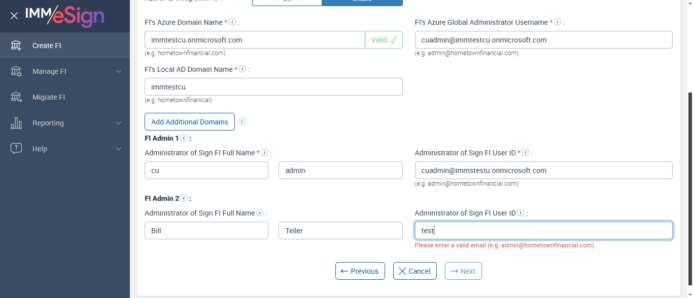 [ScreenShot] Succesfully entered email Fi Admin 1 User ID 'cuadmin@immstestu.onmicrosoft.com' [ScreenShot] Error message is displayed for incorrect email 'test' [ScreenShot] Error message is displayed for incorrect incorrect email in Fi Admin2 User ID