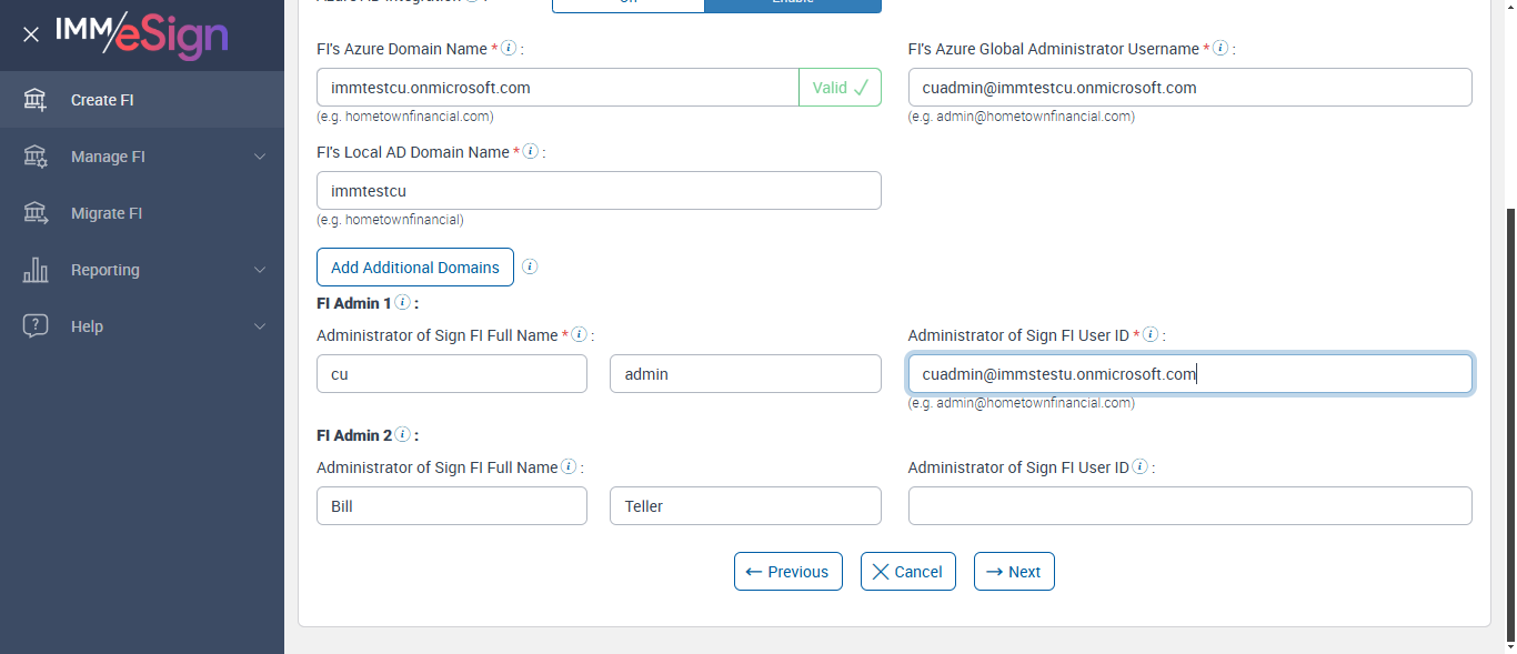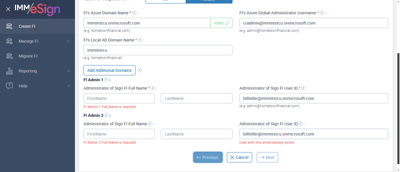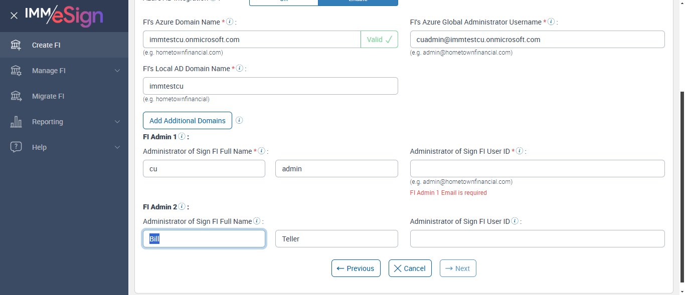When a user logs into Sign for the first time, they will be created as an FI Administrator (FIAdmin) in Sign. For Fully Integrated Remote accounts, an Adobe user will be created and added to the Adobe Default Group. [ScreenShot] Successfully verified Fi Admin1 Full Name tool tip Enter the user's full name by providing their first name in the 'First Name' field and their last name in the 'Last Name' field. [ScreenShot] Successfully verified Fi Admin2 Full Name tool tip Enter the user's full name by providing their first name in the 'First Name' field and their last name in the 'Last Name' field. [ScreenShot] Successfully verified Fi Admin1 User ID tool tip Enter the user's email address. [ScreenShot] Successfully verified Fi Admin2 User ID tool tip Enter the user's email address. [ScreenShot] Expected: First Name entry field description when blank: “First Name” Actual(Passed): Successfully verified Default value FirstName[ScreenShot] Expected: First Name entry field description when blank: “First Name” Actual(Passed): Successfully verified Default value FirstName[ScreenShot] Expected: Last Name entry field description when blank: “Last Name” Actual(Passed): Successfully verified Default value LastName[ScreenShot] Expected: Last Name entry field description when blank: “Last Name” Actual(Passed): Successfully verified Default value LastName[ScreenShot] Expected: Error message is displayed whe Same email added for FI admin 1 and 2 Actual(Passed): Successfully verified same User Id error User with this email already exists.[ScreenShot] Error message is displayed for blank FiAdmin1 First Name [ScreenShot] Error message is displayed for blank FiAdmin1 Last Name [ScreenShot] Error message is displayed for blank FiAdmin2 First Name [ScreenShot] Error message is displayed for blank FiAdmin2 Last Name [ScreenShot] Value added in FiAdmin 1FirstName field - cu Value added in FiAdmin 1LastName field - admin Value added in FiAdmin 2FirstName field - Bill Value added in FiAdmin 2LastName field - Teller Successfully added FiAdmin1 Full Name [ScreenShot] Error message is displayed for Blank UserID 1 [ScreenShot] Error message is displayed for incorrect email 'test' [ScreenShot] Error message is displayed for incorrect incorrect email Fi Admin1 User ID [ScreenShot] Error message is displayed for incorrect email 'test@123' [ScreenShot] Error message is displayed for incorrect incorrect email Fi Admin1 User ID [ScreenShot] Error message is displayed for incorrect email 'admintestfi.com' [ScreenShot] Error message is displayed for incorrect incorrect email Fi Admin1 User ID [ScreenShot] Succesfully entered email Fi Admin 1 User ID 'cuadmin@immstestu.onmicrosoft.com' [ScreenShot] Error message is displayed for Blank UserID 2 [ScreenShot] Error message is displayed for incorrect email 'test' [ScreenShot] Error message is displayed for incorrect incorrect email in Fi Admin2 User ID [ScreenShot] Error message is displayed for incorrect email 'test@123' [ScreenShot] Error message is displayed for incorrect incorrect email in Fi Admin2 User ID [ScreenShot] Error message is displayed for incorrect email 'admintestfi.com' [ScreenShot] Error message is displayed for incorrect incorrect email in Fi Admin2 User ID [ScreenShot] Succesfully entered email in Fi Admin 2 User ID'bill.teller@immstestu.onmicrosoft.com' [ScreenShot] Next button is enabled [ScreenShot] --- 12 Feb 19:30:44 014 - Element is displayed using Selenide:: [[RemoteWebDriver: chrome on Windows 10 (b91d7db94a8d87fc24943783c576bfde)] -> id: btnNext] --- 12 Feb 19:30:49 337 - Page URL:: https://esignnonprod.immesign.com/qa/tenantmanager/#/fi/create/summary --- 12 Feb 19:30:49 337 - 3 - Page Load Wait: (Sync) - com.imm.support.Utils.waitForPageLoad(Utils.java:117) --- 12 Feb 19:30:52 436 - Page URL:: https://esignnonprod.immesign.com/qa/tenantmanager/#/fi/create/summary --- 12 Feb 19:30:52 437 - 3 - Page Load Wait: (Sync) - com.imm.support.Utils.waitForPageLoad(Utils.java:117) --- 12 Feb 19:30:52 523 - Element is displayed using Selenide:: [[RemoteWebDriver: chrome on Windows 10 (b91d7db94a8d87fc24943783c576bfde)] -> xpath: /html/body/div/div/div/c-container/app-dashboard/app-create-fi/app-summary/c-card/c-card-header] --- 12 Feb 19:30:55 686 - Page URL:: https://esignnonprod.immesign.com/qa/tenantmanager/#/fi/create/summary --- 12 Feb 19:30:55 686 - 3 - Page Load Wait: (Sync) - com.imm.support.Utils.waitForPageLoad(Utils.java:117) --- 12 Feb 19:30:55 769 - Element is displayed using Selenide:: [[RemoteWebDriver: chrome on Windows 10 (b91d7db94a8d87fc24943783c576bfde)] -> css selector: .header] Clicked 'Next' button --- 12 Feb 19:30:58 863 - Page URL:: https://esignnonprod.immesign.com/qa/tenantmanager/#/fi/create/summary --- 12 Feb 19:30:58 863 - 3 - Page Load Wait: (Sync) - com.imm.support.Utils.waitForPageLoad(Utils.java:117) --- 12 Feb 19:30:58 960 - Element is displayed using Selenide:: [[RemoteWebDriver: chrome on Windows 10 (b91d7db94a8d87fc24943783c576bfde)] -> xpath: /html/body/div/div/div/c-container/app-dashboard/app-create-fi/app-summary/c-card/c-card-header] --- 12 Feb 19:31:02 079 - Page URL:: https://esignnonprod.immesign.com/qa/tenantmanager/#/fi/create/summary --- 12 Feb 19:31:02 079 - 3 - Page Load Wait: (Sync) - com.imm.support.Utils.waitForPageLoad(Utils.java:117) --- 12 Feb 19:31:02 161 - Element is displayed using Selenide:: [[RemoteWebDriver: chrome on Windows 10 (b91d7db94a8d87fc24943783c576bfde)] -> css selector: .header] Successfully navigated to the 'SummaryPage' page [ScreenShot] Clicked on Previous button [ScreenShot] --- 12 Feb 19:31:07 848 - Page URL:: https://esignnonprod.immesign.com/qa/tenantmanager/#/fi/create/azure --- 12 Feb 19:31:07 848 - 3 - Page Load Wait: (Sync) - com.imm.support.Utils.waitForPageLoad(Utils.java:117) --- 12 Feb 19:31:10 975 - Page URL:: https://esignnonprod.immesign.com/qa/tenantmanager/#/fi/create/azure --- 12 Feb 19:31:10 975 - 3 - Page Load Wait: (Sync) - com.imm.support.Utils.wait