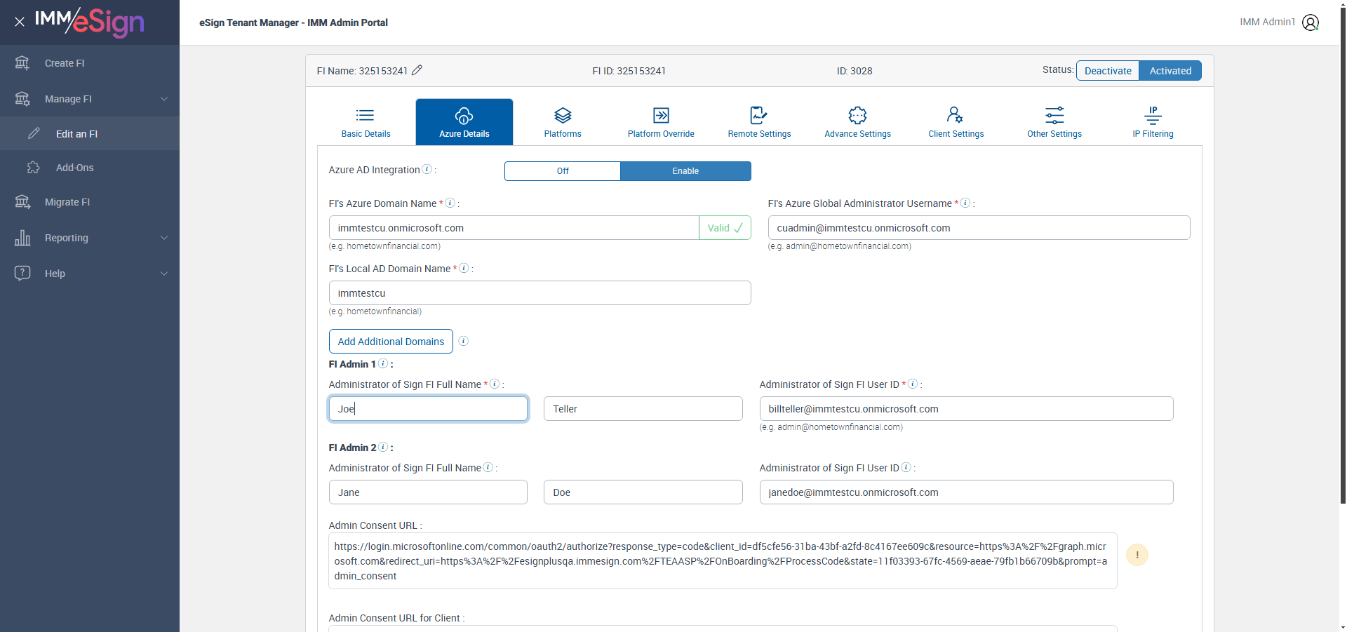 | {ZIP=, Login_User_ID=immadmin1@immesignqa.onmicrosoft.com, RemoteSettings=Ad Hoc Document,Web Form,Reusable Templates, FiStatus=, WebForm=, AdobeKey=, FiAdmin_LastName=Teller,Doe, Name=, LocalDomain=immtestcu, Edit_UserID=joeteller@immtestcu.onmicrosoft.com,johndoe@immtestcu.onmicrosoft.com, Adhoc_Doc=, eSignPlus=, RtmAuthTypes=, Fully_Intgrt_Key=, IntegrationType=Fully Integrated, SendInBulk=, RemoteSign=Enable, DrpSpot=, RemoteSign_ManageFI=, Reusable_Temp=, AZDomain=immtestcu.onmicrosoft.com, VerifastEDays=, City=, WrongAZDomain=, LCEvalDays=, State=, LoanCoupon=, Login_Password=iMM@2024, Country=, ClientID=, FIID=, Key=, FiAdmin_FirstName=Bill,Jane, Dictionary=TeSign;XPLN, Sign_RmtAgree_NotChecked=Send In Bulk, StarterEvalDays=, Description=ReplacingFiAdmin1Fiadmin2, StarterChecks=, eSignURL=https://esignplusqa.immesign.com/TEAASP/Login.aspx, E-Vault=, Filepath=, TestID=ReplacingFiAdmin1Fiadmin2, FiAdmin_UserID=billteller@immtestcu.onmicrosoft.com,janedoe@immtestcu.onmicrosoft.com, EditFIAdmin_FName=Joe,John, Verifast=, LacerPro=, Notes=, Session URL=https://esignnonprod.immesign.com/qa/tenantmanager/, GlobalAdmin=cuadmin@immtestcu.onmicrosoft.com, TypeOfUser=, eValultDays=, ErrorMsg=, Address2=, Address3=, Address1=, Sign_Password=iMM@2022, WrongFIID=, DrpEvalDays=, EditFiadmin_LName=Peter,Doe, Sign_RmtAgree_checked=Ad Hoc Document,Web Form,Reusable Templates,Manage Remote Agreements} |