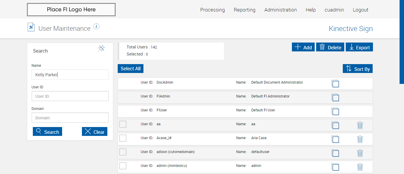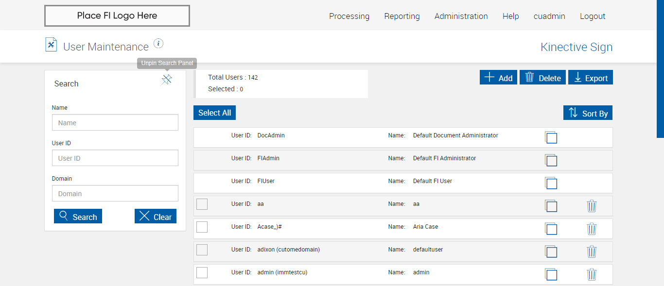 Expected: FIAdmin user present in User maintenace page