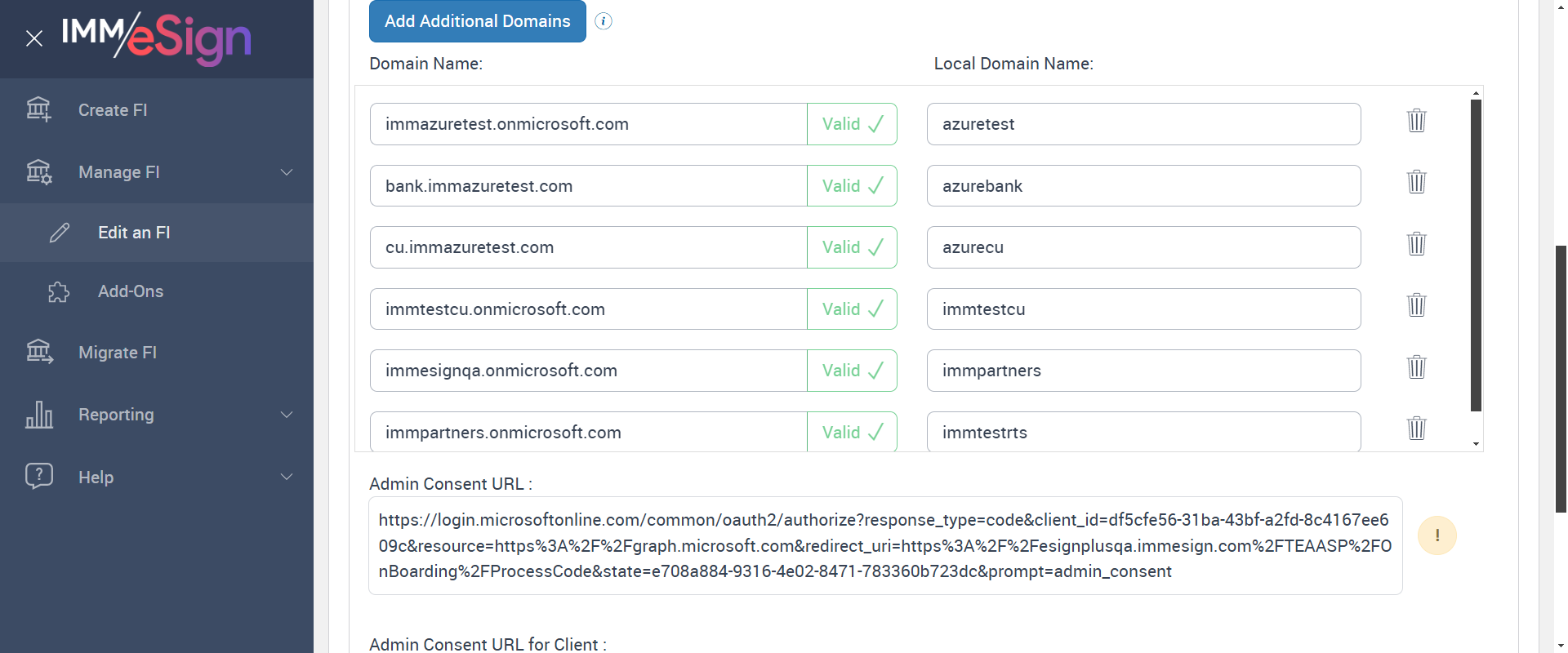 ({Tenant_URL=https://esignnonprod.immesign.com/qa/tenantmanager/, EmailID=, WorkflowSummary=, Login_User_ID=qauser2@immazuretest.onmicrosoft.com;qauser2@bank.immazuretest.com;qauser2@cu.immazuretest.com;, Address=, FiStatus=Completed, FiAdmin_LastName=one;, Add_Dictionary=, GRP_PermissionRadio=, Effect_Summary=, Name=, GRP_PermissionChkBox=, NewUser_ID=KPUser4@immtestcu.onmicrosoft.com;iMM@2025!, LocalDomain=immazuretest, PartiesToView=, NewName=, User_ID=, Wkf_Permission=, Reset_Password=, NewDescription=, AZDomain=immazuretest.onmicrosoft.com, Workflow=, City=, Delete_Dictionary=, AttachmentTypeOption=, NewEmailID=, State=, Login_Password=iMM@2025!;, eSignClient=, ClientID=3AAABLblqZhCPfuU-npiCakOjy5Ut75_7222WMCDdpSBYYA0z9PZE7hXvVdJDXKIzDh0zkAVwUGLc4pVh3cU31w119aZm6Uu_, Domain=azuretest;azurebank;azurecu;, UserType=, NewGroup=, Tenant_User=, FiAdmin_FirstName=admin;, Group=Users;Accounting Group;, Dictionary=TeSign;XPLN;MSP, FI_Name=Autotestfi, Description=Create new FI, While create FI verify Azure details tab UI for multi domain and add multiple Additional domain. After that verify user can login with different additional domains and check user will add in correct group also check correct domain name display., AdditionalDomainName=immazuretest.onmicrosoft.com;bank.immazuretest.com;cu.immazuretest.com;immtestcu.onmicrosoft.com;immesignqa.onmicrosoft.com;immpartners.onmicrosoft.com, SearchUser=, Filepath=src/main/resources/testdata/files/documentRTS/BasicRTSDocs/005BA1.pdf;src/main/resources/testdata/files/documentRTS/BasicRTSDocs/513BA.pdf, TestID=verifyMultiDomainTMCreateFIAzureDetailsandEsignUsersLogin, FiAdmin_UserID=admin@immazuretest.onmicrosoft.com;, Dictionary_Code=, IndexSource=, Access_Password=, UserURL2=, Inbox_Permission=, Confirm_Reset_Password=, AdditionalLocalDomainName=azuretest;azurebank;azurecu;immtestcu;immpartners;immtestrts;, Notes=, Inbox=, GlobalAdmin=admin@immazuretest.onmicrosoft.com, Path=src/main/resources/testdata/files/documentRTS/BasicRTSDocs/BasicRTSDocTemplates.zip;, Copy_User_ID=, Tenant_Password=, Enter_eSignClient=, ZipCode=, FI_ID=Autotestfi, Confirm_Password=, CasesUser=, Tab=, UserURL=, Copy_Tab=})